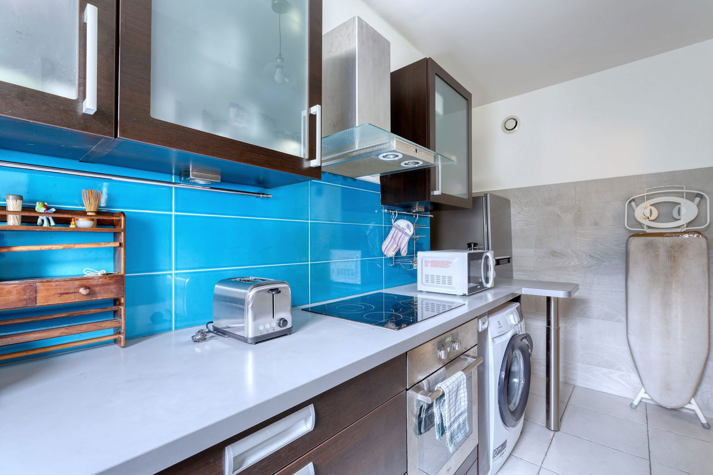 - a separate, fully-equipped kitchen (coffee machine, toaster, kettle, oven, microwave, hob, fridge, freezer),