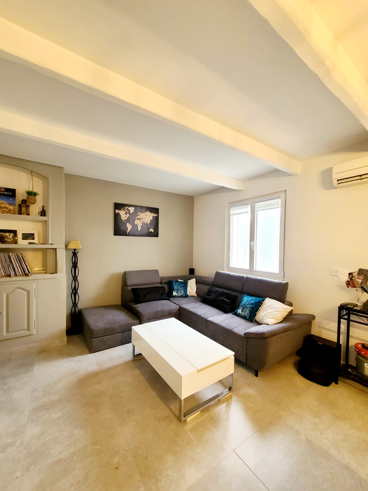 The house features a bathroom with a shower and bathtub, a separate toilet, and three comfortable double bedrooms. The air conditioning, strategically placed at the entrance of the hallway, cools the entire house, ensuring optimal comfort even during the warmest summer days.