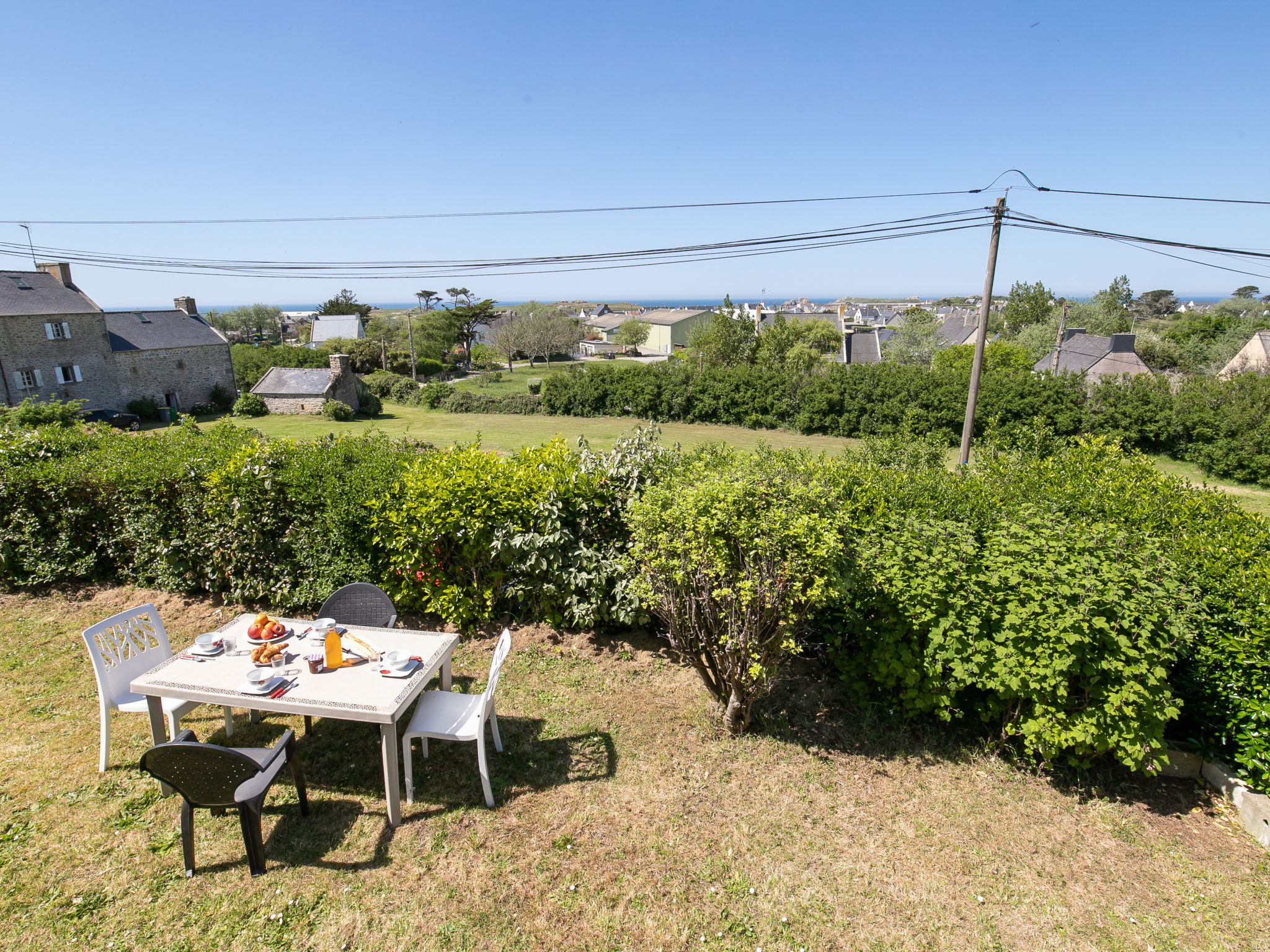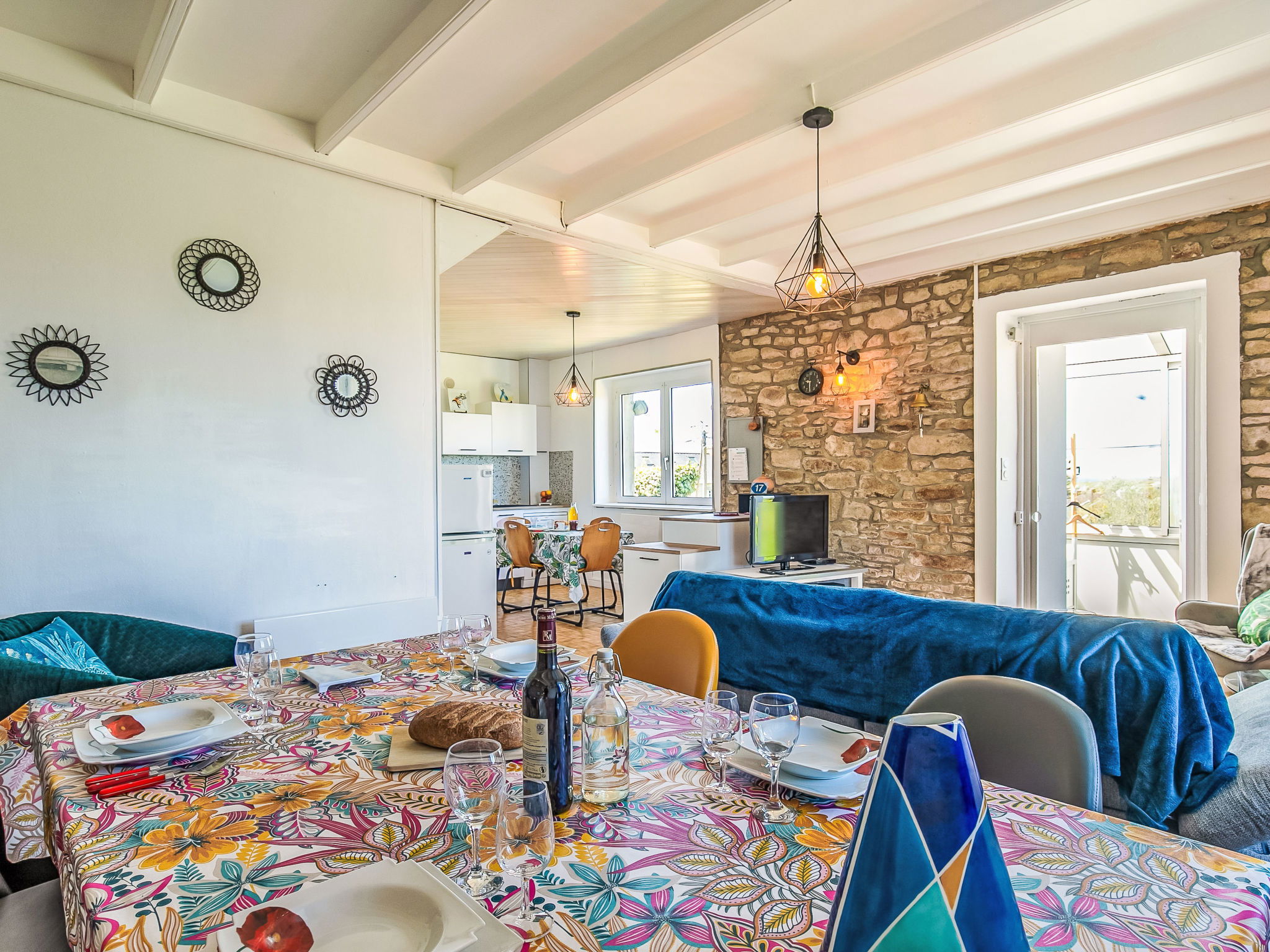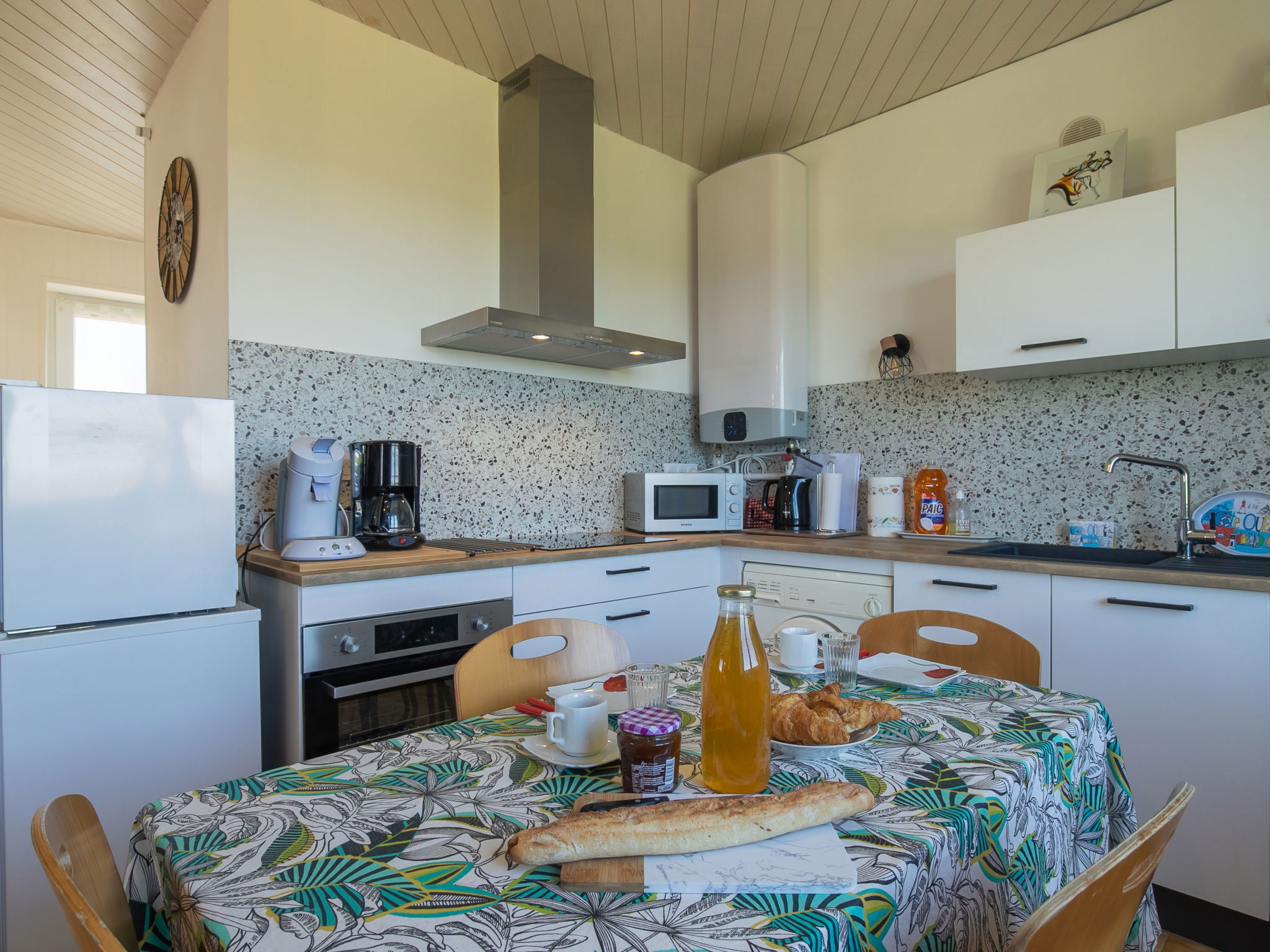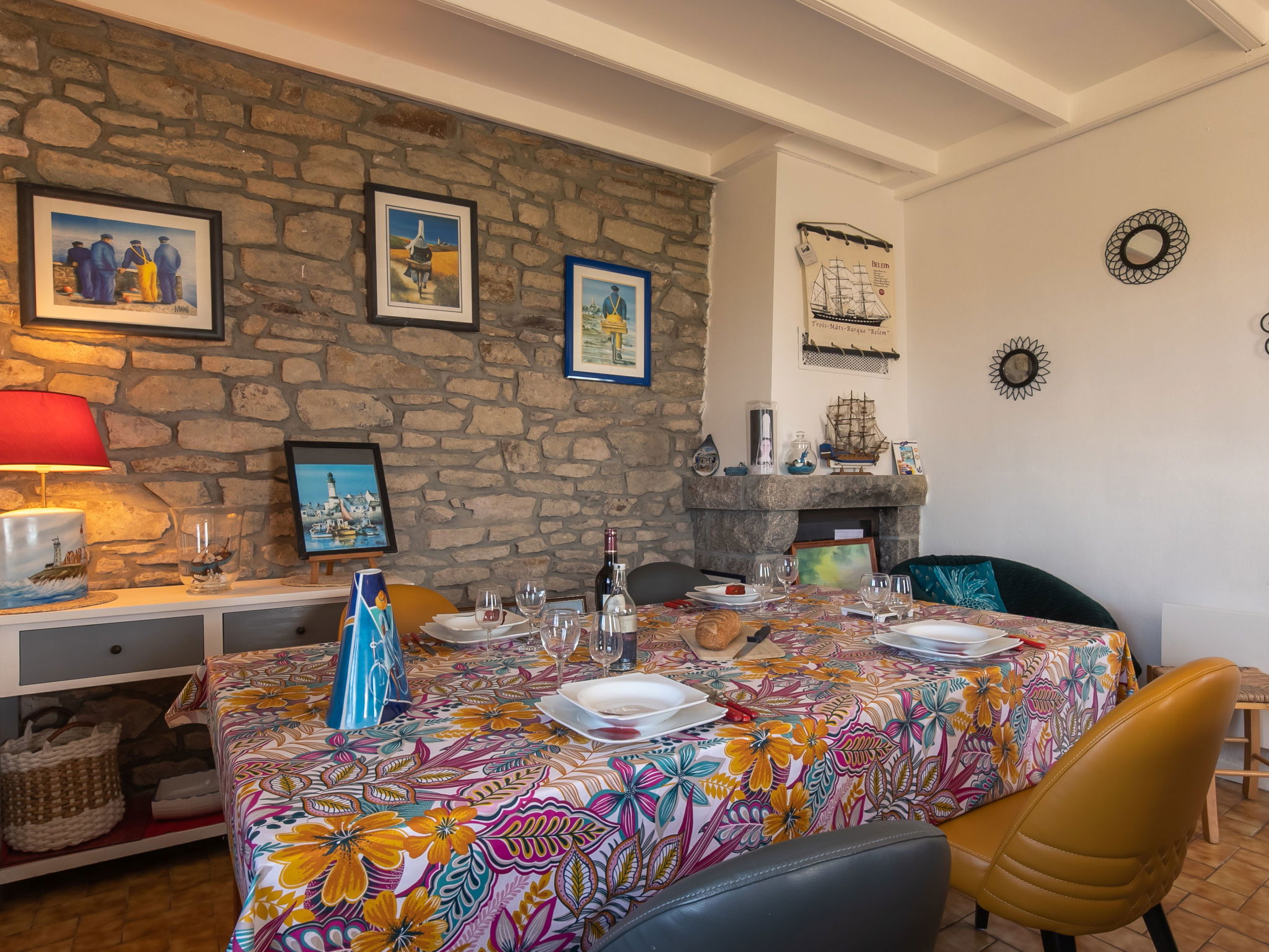 "La Grande Roche", 3-room house 80 m2 on 2 levels. Renovated in 2024, beautiful and cosy furnishings: living/dining room 30 m2 with open-hearth fireplace (only for decoration), dining table, satellite TV, radio, DVD and electric heater. Exit to the garden. Small, open kitchen (oven, dishwasher, 4 induction hot plates, toaster, kettle, microwave, freezer, electric coffee machine, raclette grill) with dining table. Bathroom, sep. WC. Upper floor: 1 room with sloping ceilings with 1 french bed (160 cm, length 200 cm), separate WC and electric heater. 1 room with sloping ceilings with 2 beds (90 cm, length 190 cm), electric heater. Terrace furniture, barbecue (portable), deck chairs (4). Distant view of the sea. Facilities: washing machine, iron, children's high chair, baby cot. Internet (WiFi, free). Please note: non-smoking house. Maximum 2 pets/ dogs allowed. Smoke alarm.