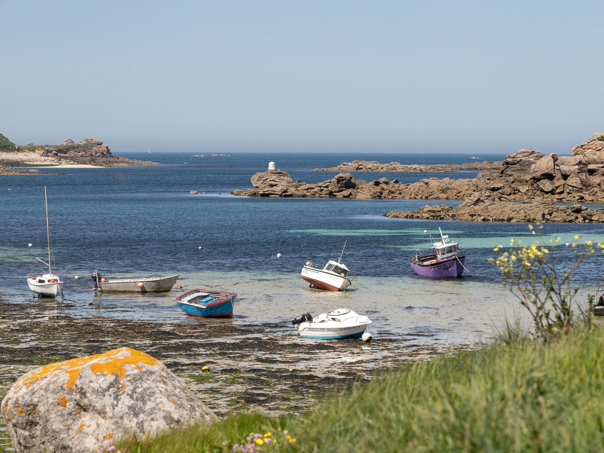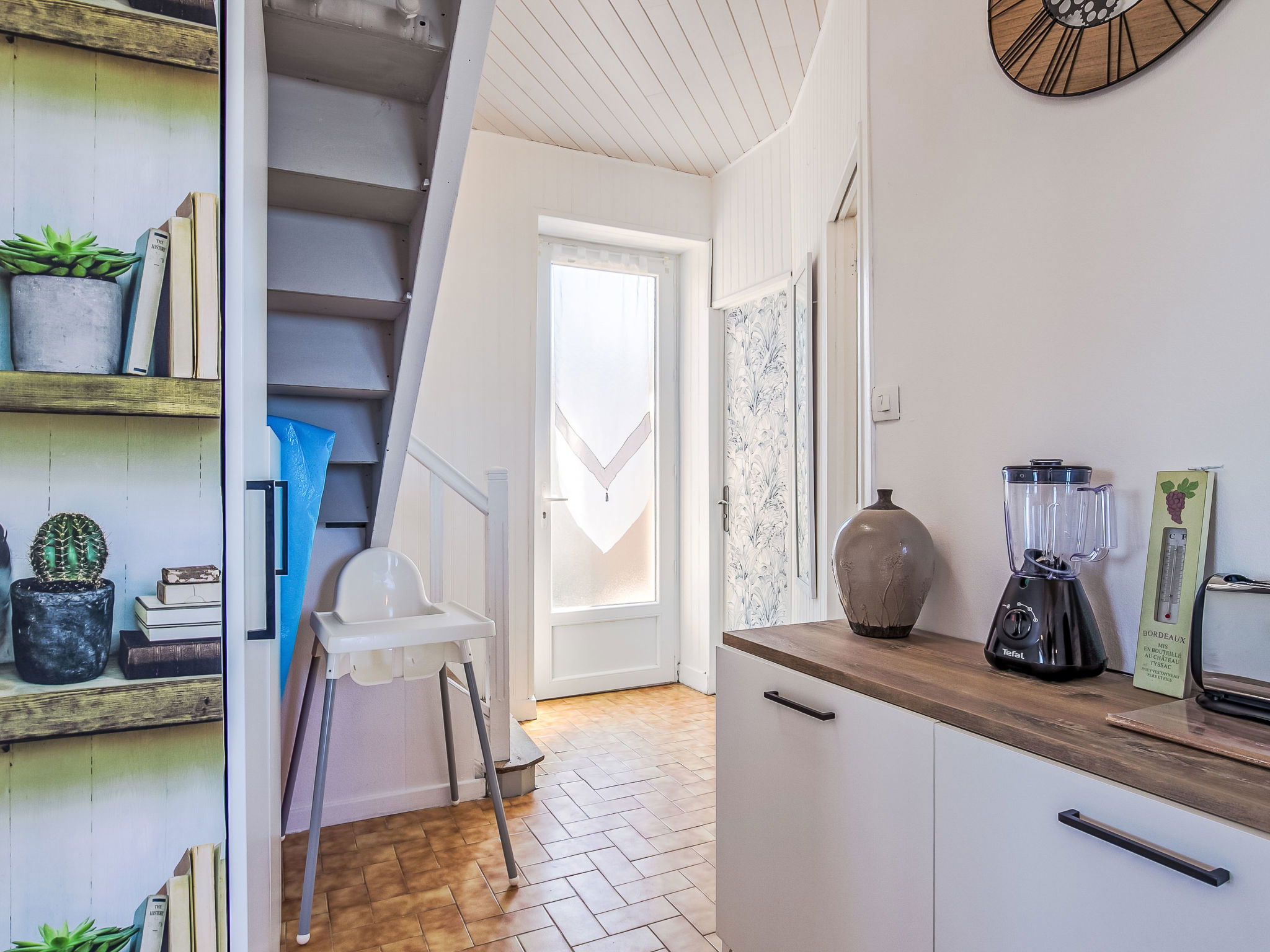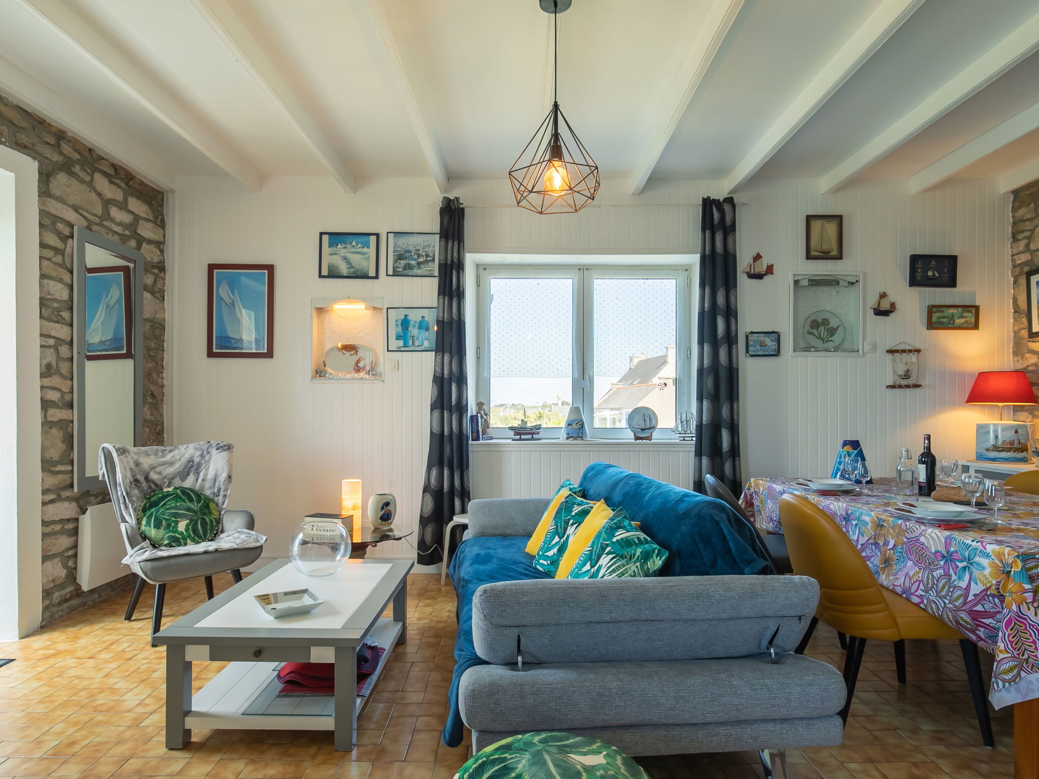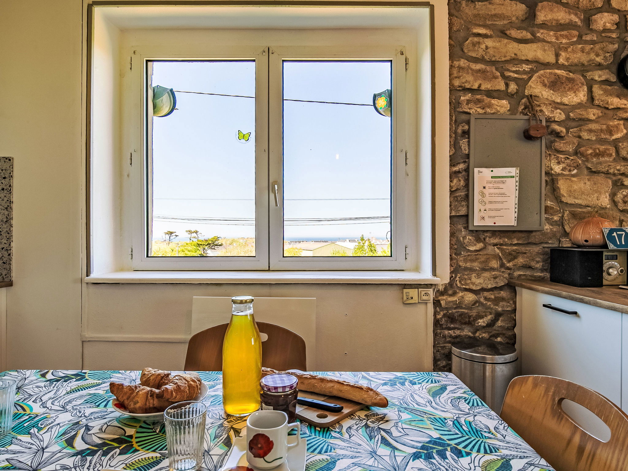 "La Grande Roche", 3-room house 80 m2 on 2 levels. Renovated in 2024, beautiful and cosy furnishings: living/dining room 30 m2 with open-hearth fireplace (only for decoration), dining table, satellite TV, radio, DVD and electric heater. Exit to the garden. Small, open kitchen (oven, dishwasher, 4 induction hot plates, toaster, kettle, microwave, freezer, electric coffee machine, raclette grill) with dining table. Bathroom, sep. WC. Upper floor: 1 room with sloping ceilings with 1 french bed (160 cm, length 200 cm), separate WC and electric heater. 1 room with sloping ceilings with 2 beds (90 cm, length 190 cm), electric heater. Terrace furniture, barbecue (portable), deck chairs (4). Distant view of the sea. Facilities: washing machine, iron, children's high chair, baby cot. Internet (WiFi, free). Please note: non-smoking house. Maximum 2 pets/ dogs allowed. Smoke alarm.