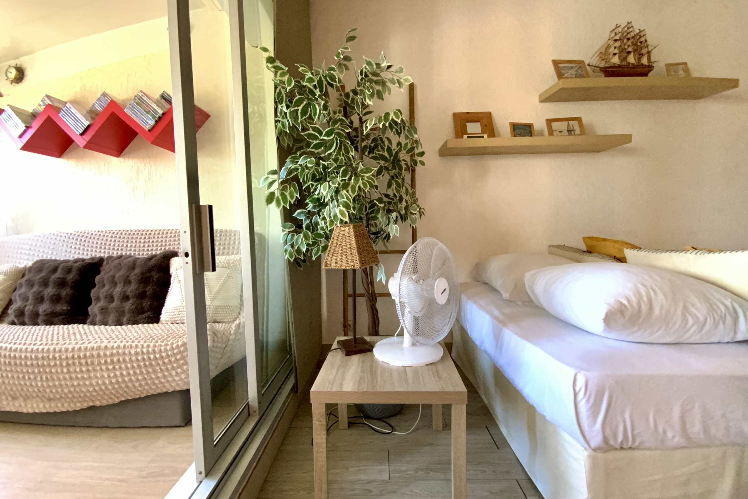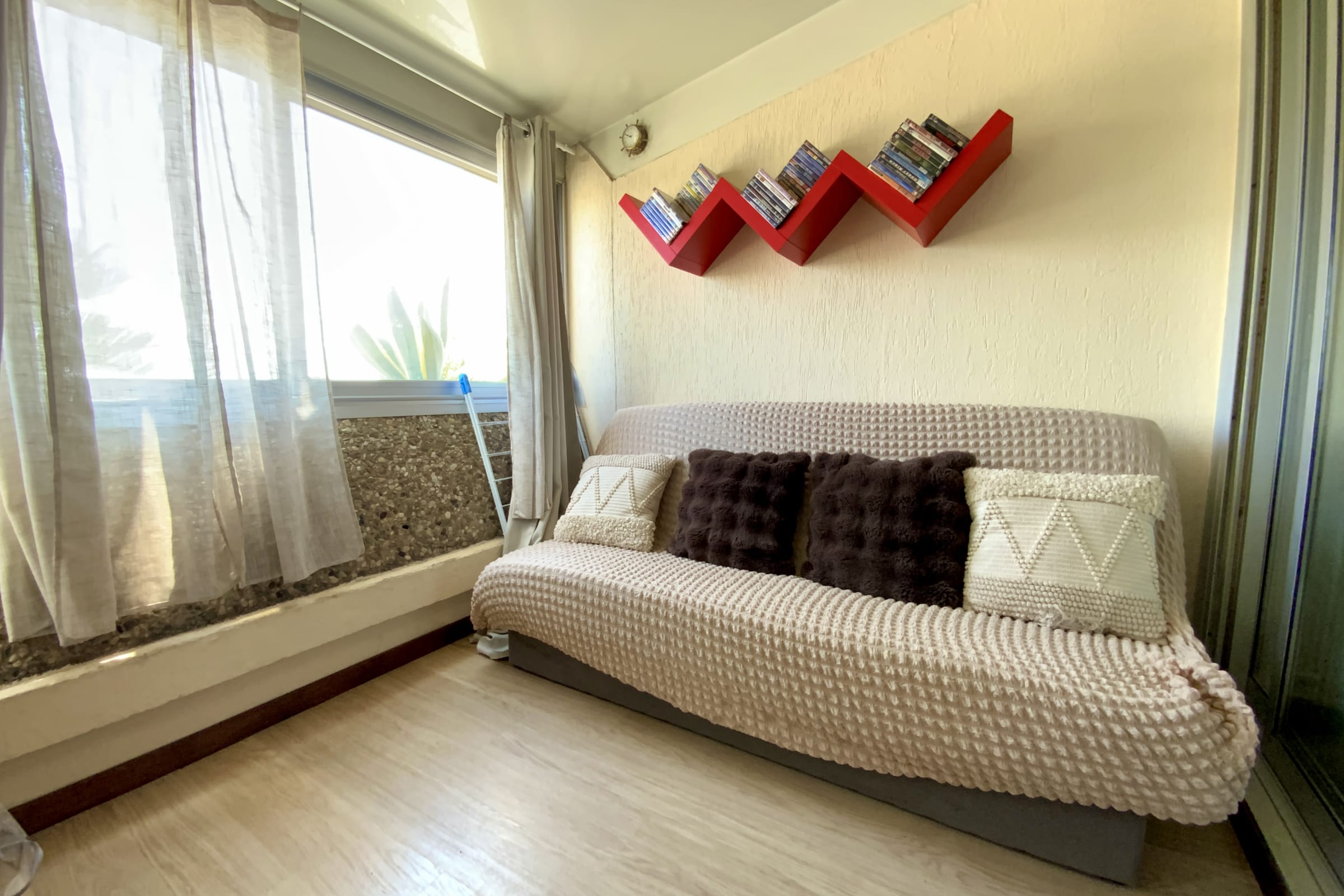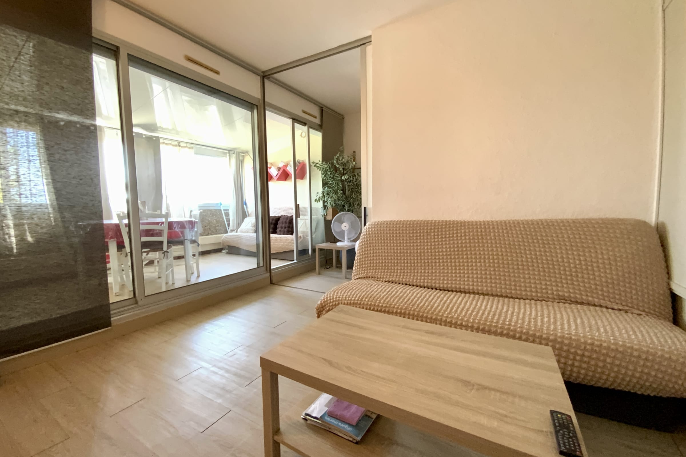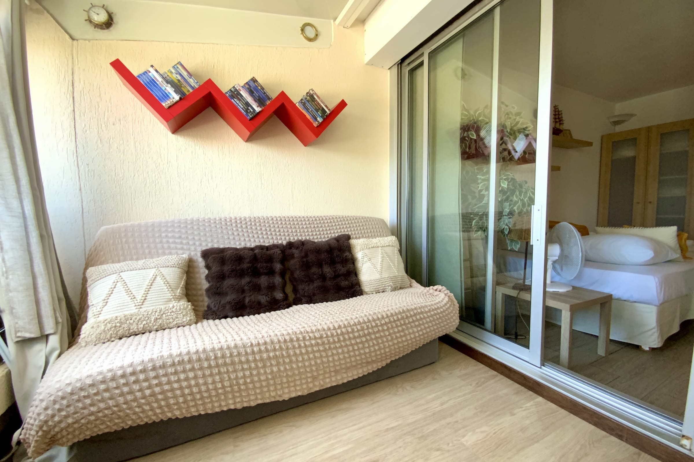 The fully renovated apartment features a bright living area with a veranda, a lounge with a sofa bed, and a fully equipped kitchen (coffee machine, kettle, toaster…).