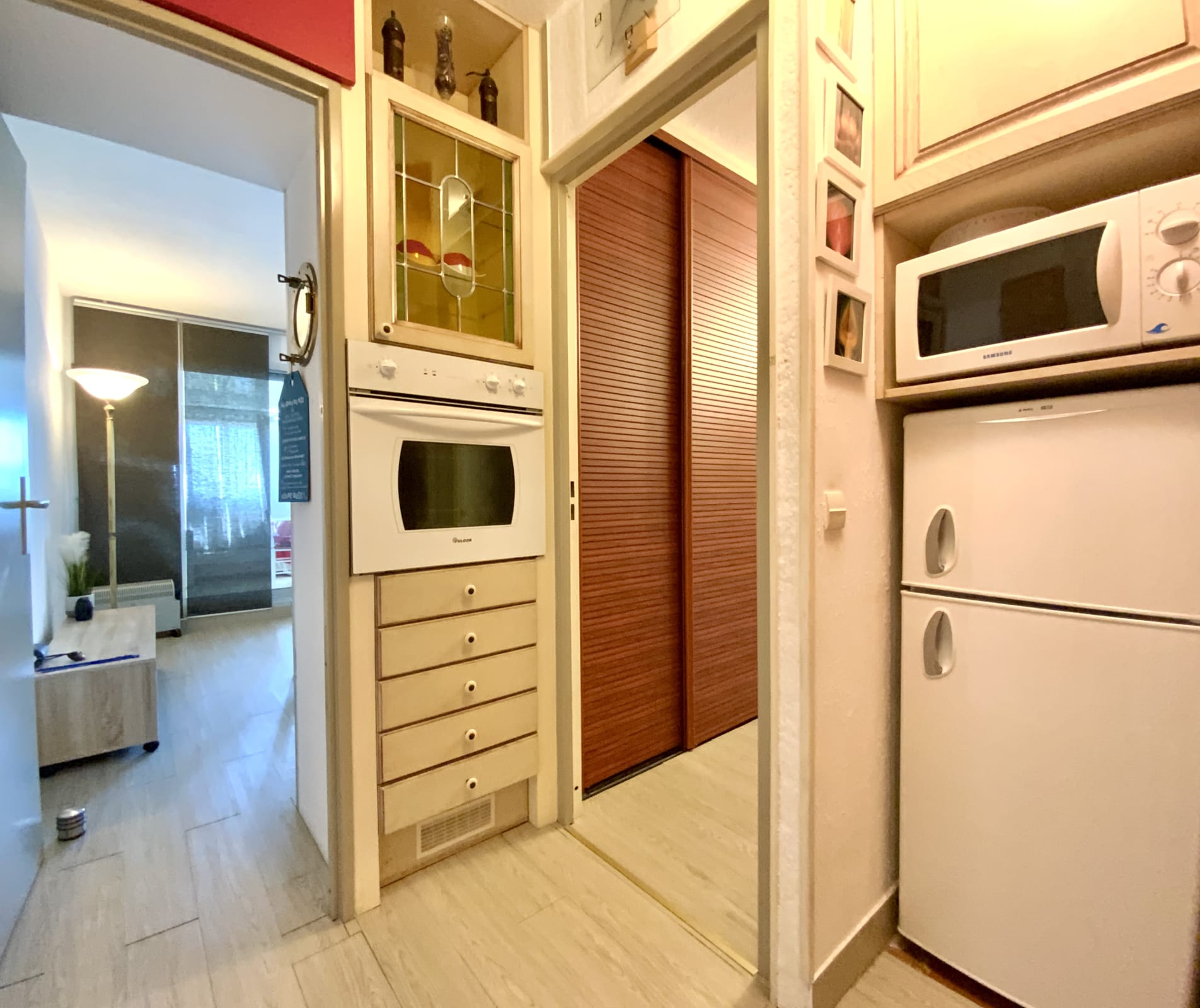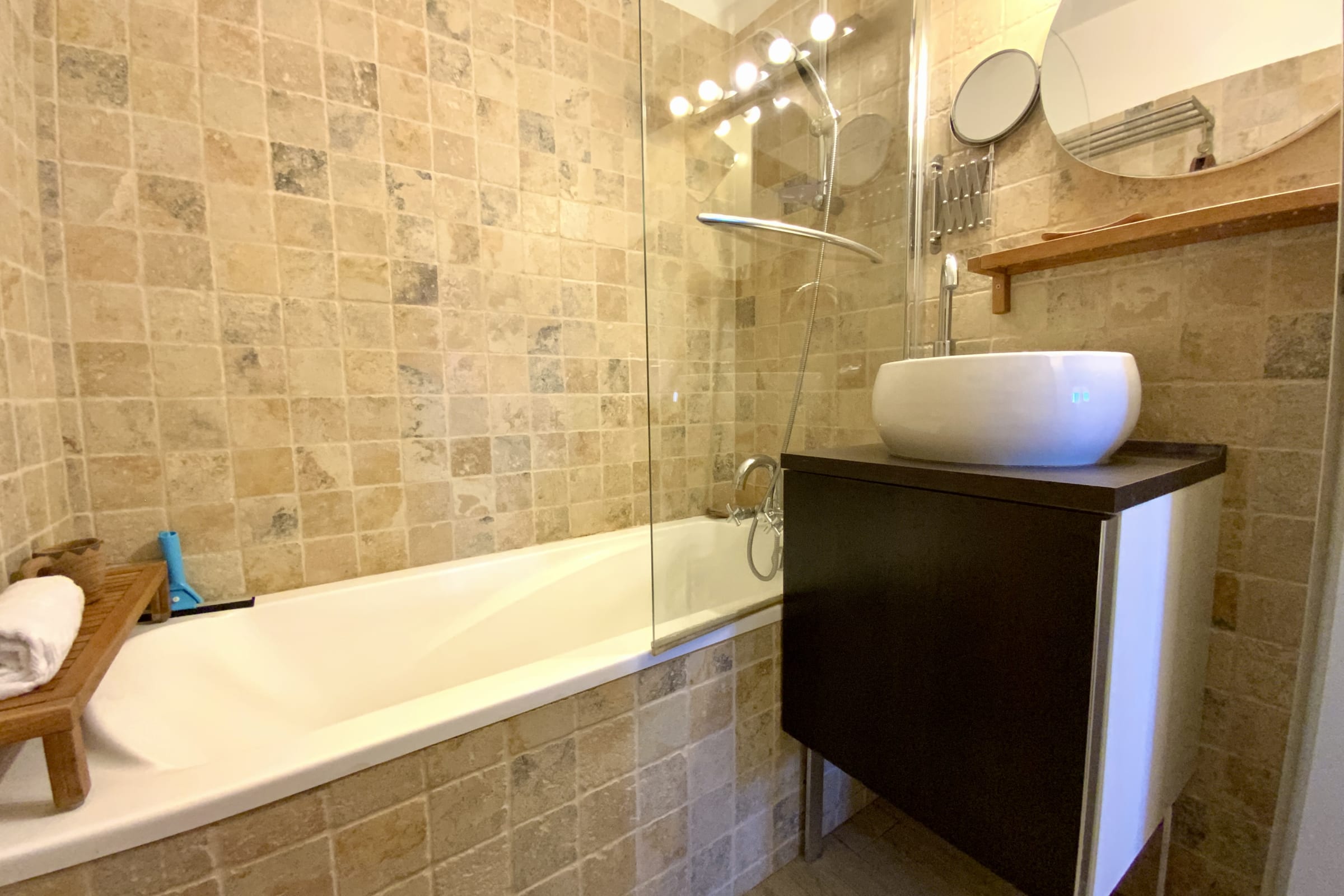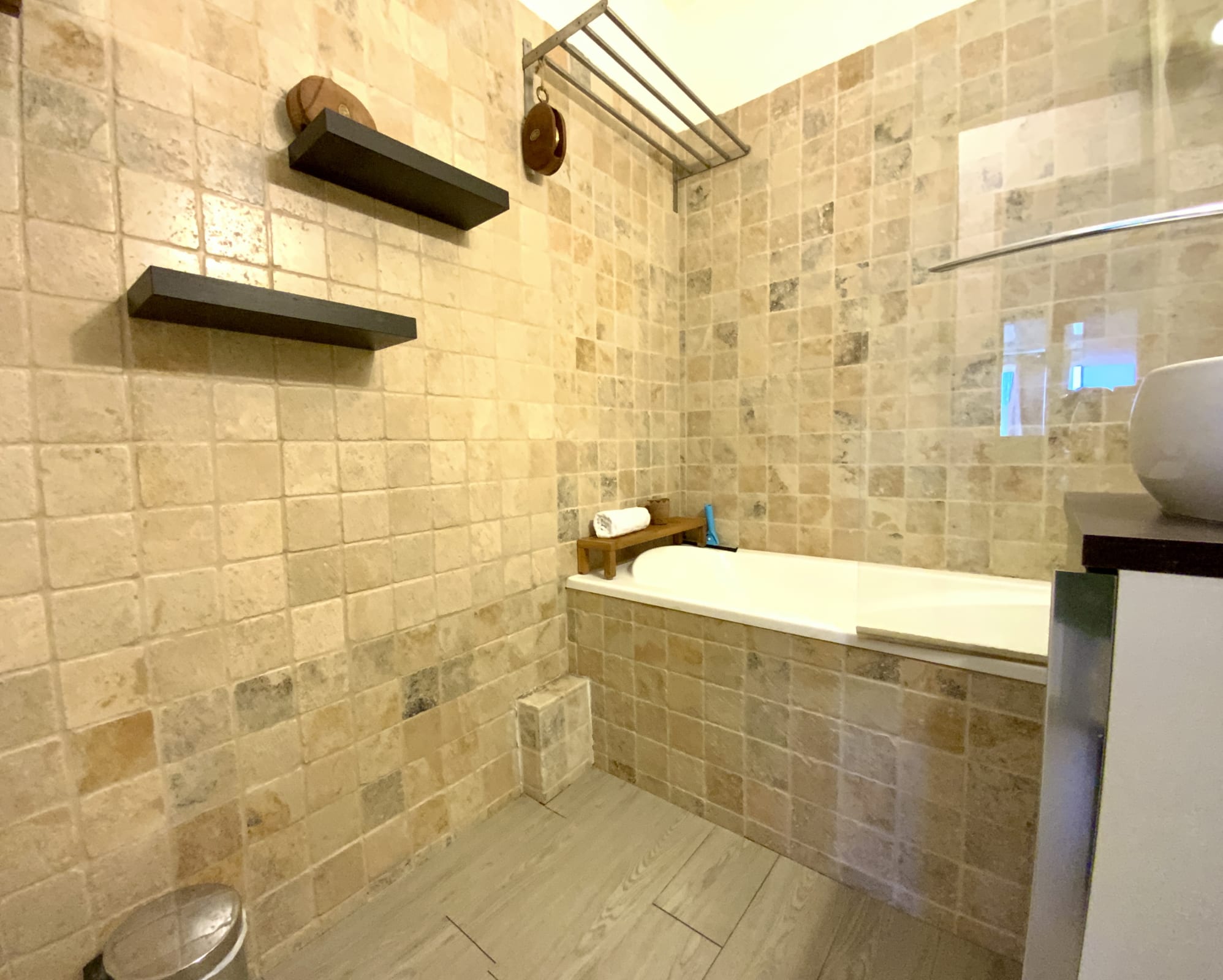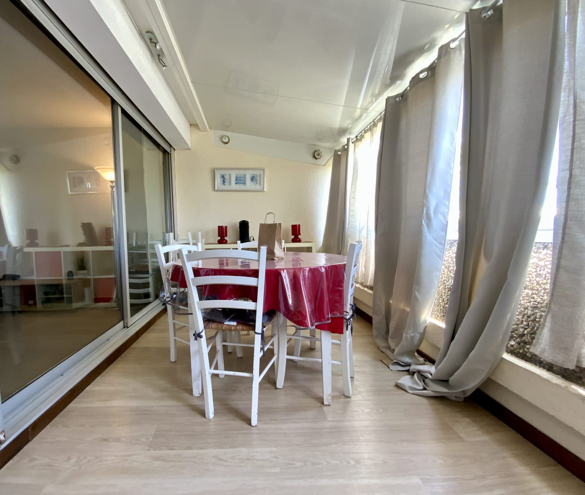 The fully renovated apartment features a bright living area with a veranda, a lounge with a sofa bed, and a fully equipped kitchen (coffee machine, kettle, toaster…).