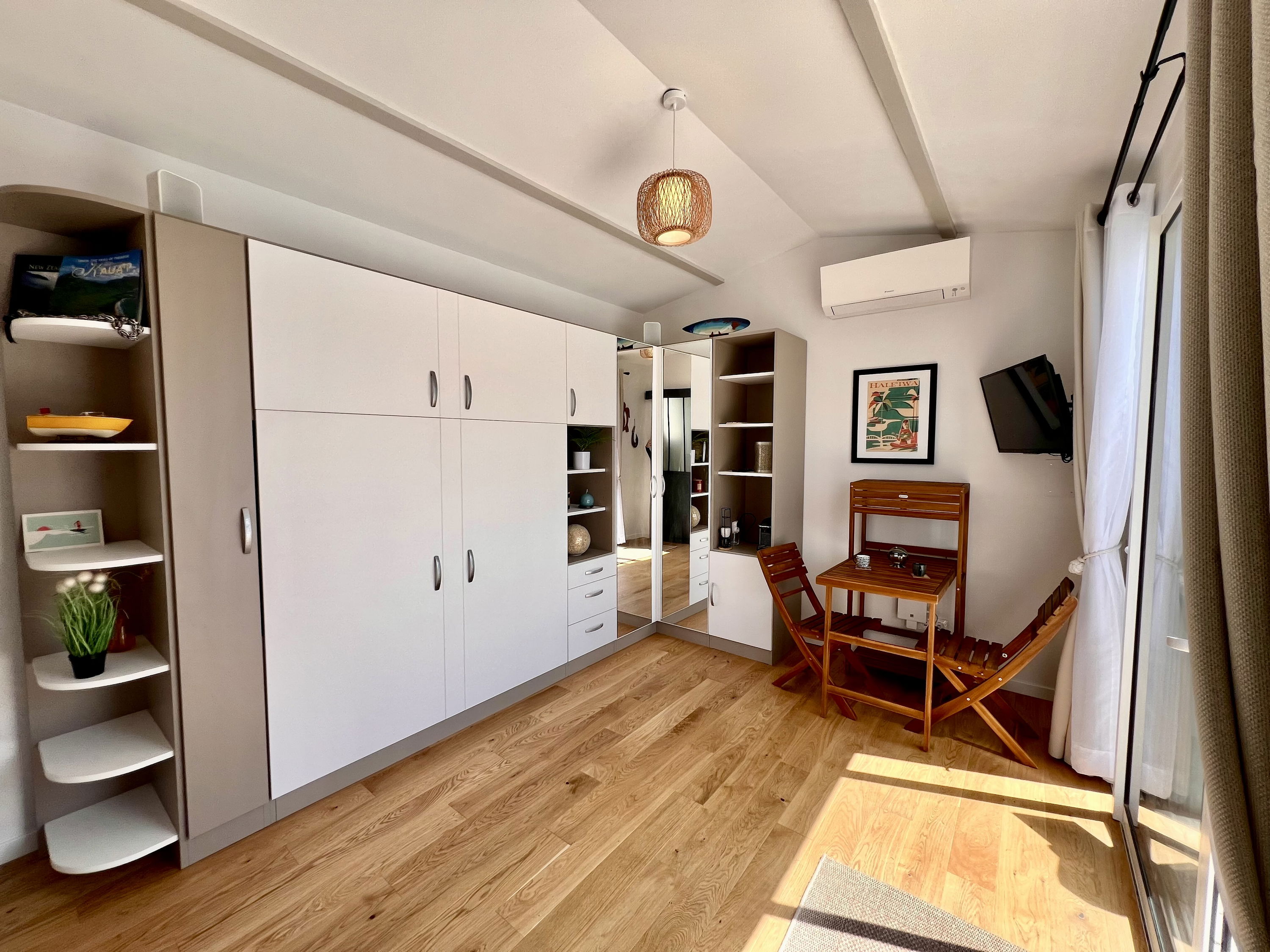 A spacious and bright living room welcomes you with a living area, an open kitchen and a dining area.