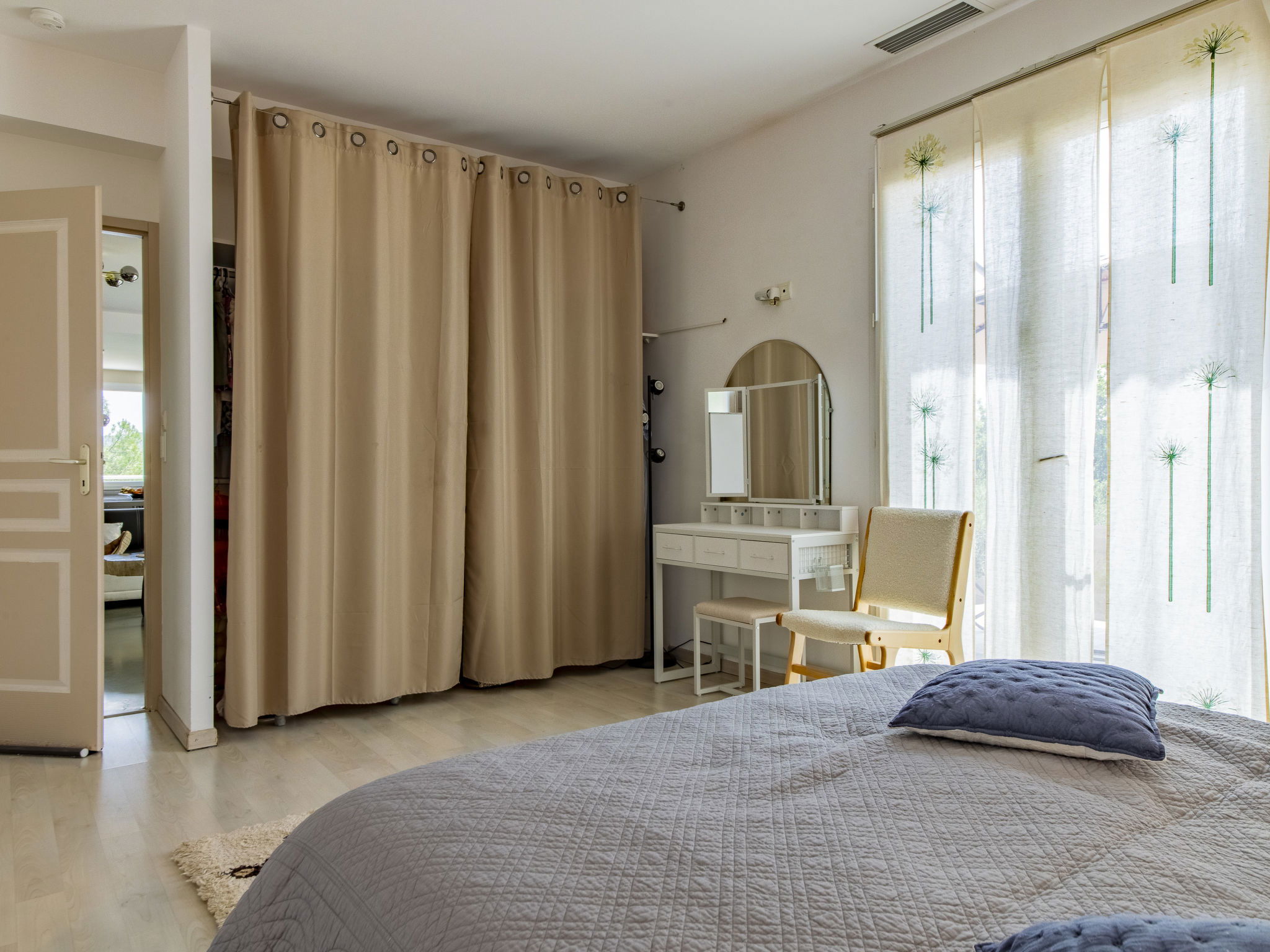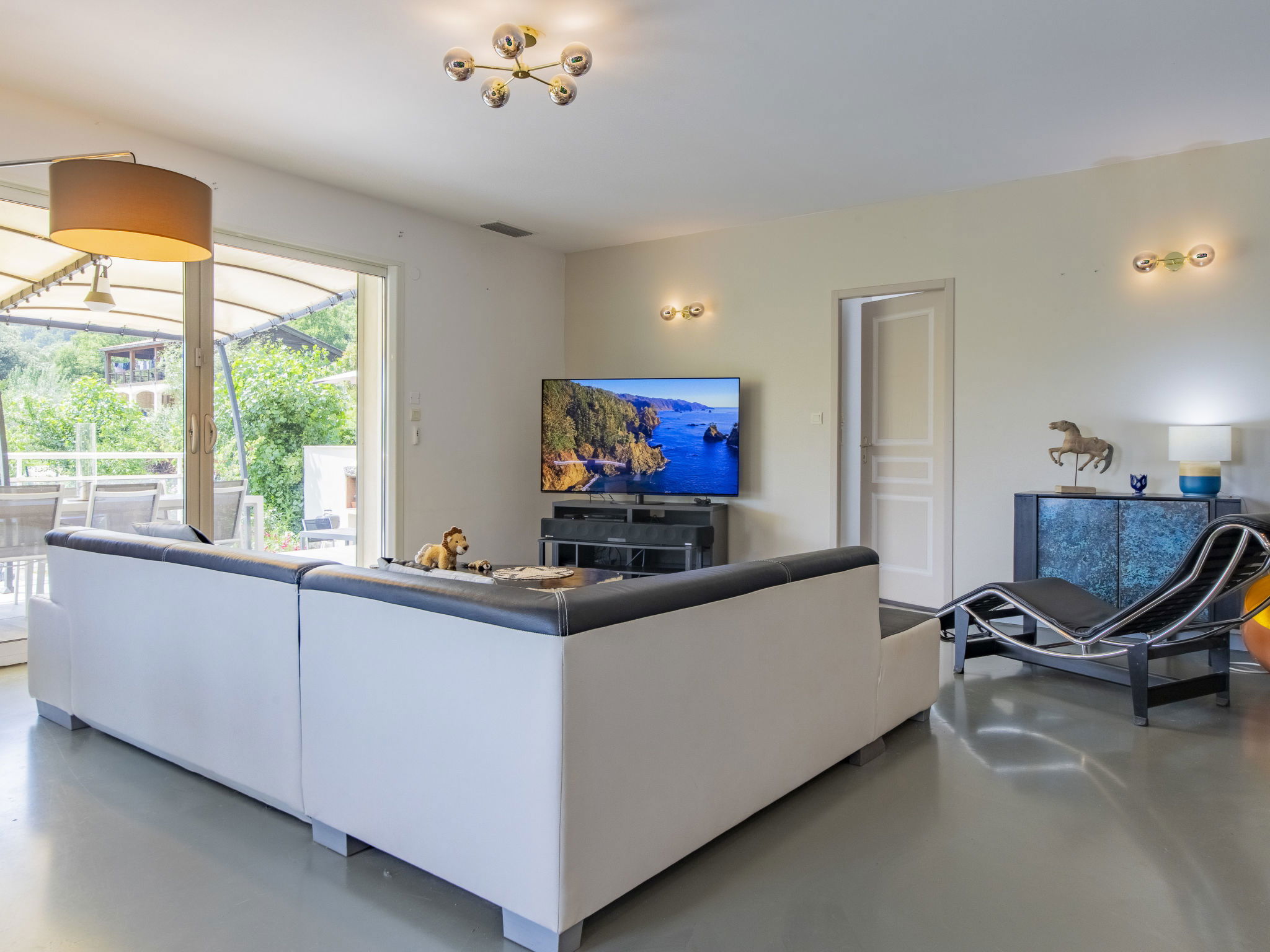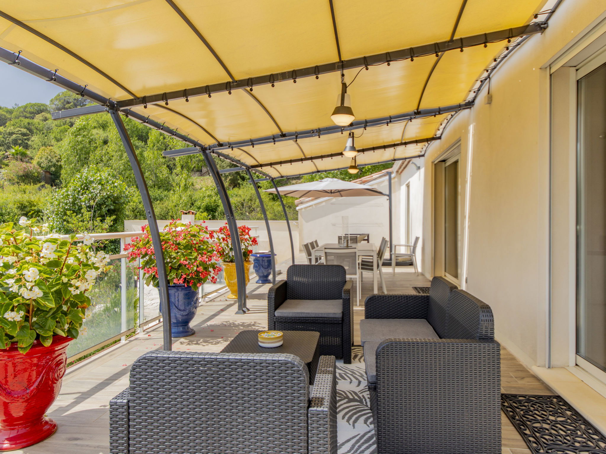5-room villa 160 m2 on 2 levels. Beautiful and modern furnishings: living/dining room 50 m2 with panoramic window with TV (flat screen). Exit to the terrace. Open kitchen (oven, dishwasher, 4 induction hot plates, toaster, kettle, microwave, freezer, electric coffee machine, Capsules for coffee machine (Nespresso et Senseo) extra). Air-conditioning, underfloor heating. On the lower ground floor: shower/WC. Air-conditioning. Upper floor: 1 room with 1 french bed (160 cm, length 200 cm), bath/shower. 1 room with 1 french bed (140 cm, length 190 cm), TV (flat screen). 1 room with 1 french bed (140 cm, length 200 cm), TV. 1 room with 2 beds (90 cm, length 200 cm). Bathroom, sep. WC, hydro massage bath. Air-conditioning. Terrace 100 m2 partly roofed, south facing position and west facing position. Terrace furniture, barbecue, deck chairs (8). Beautiful view of the valley. Facilities: washing machine, dryer, children's high chair, baby cot for up to 2 year olds, hair dryer. Internet (WiFi, free). Please note: non-smokers only. 1 small pet/ dog allowed. Smoke alarm. Offer by a private individual according to Art. 155, IV of CGI.