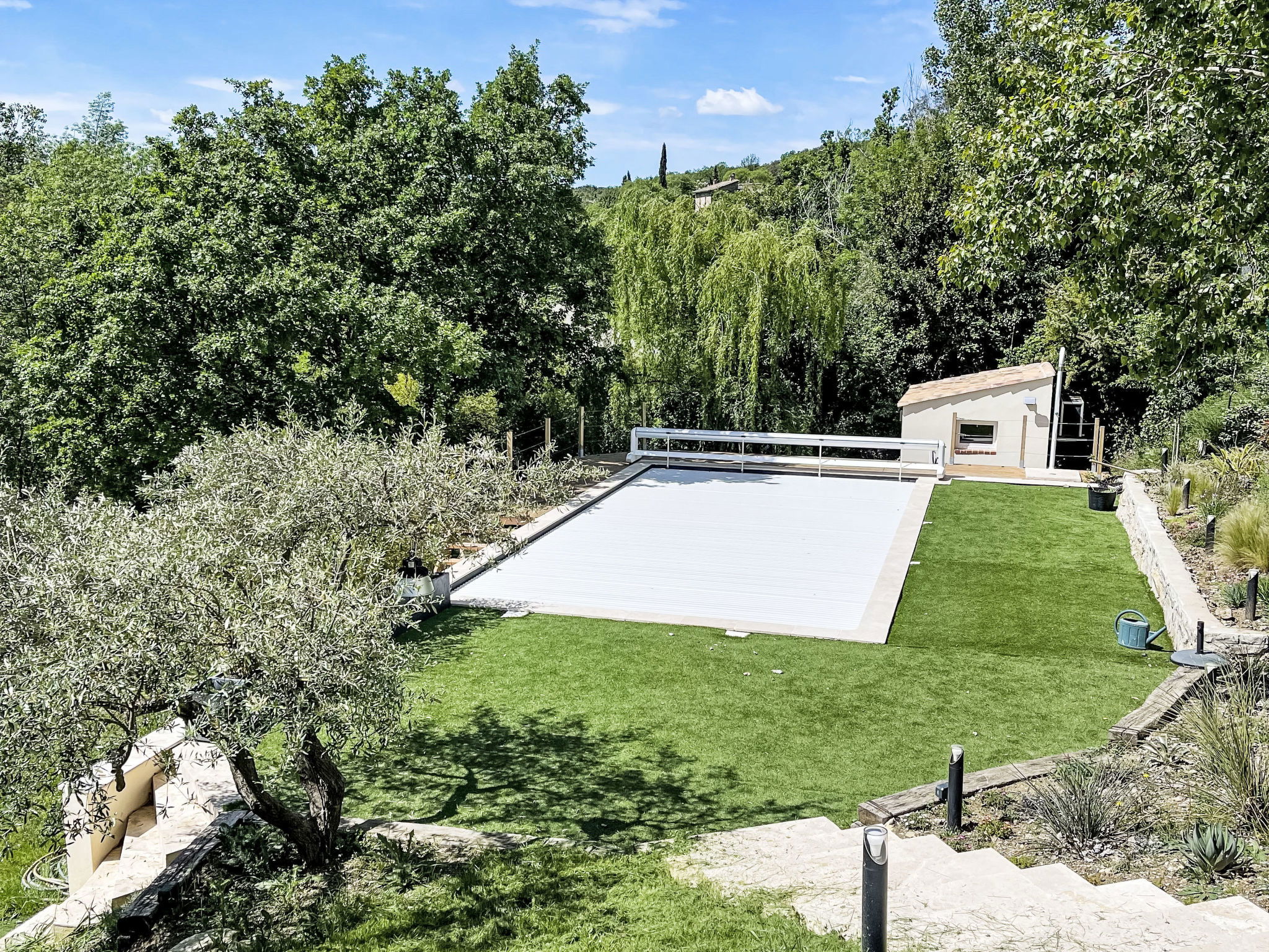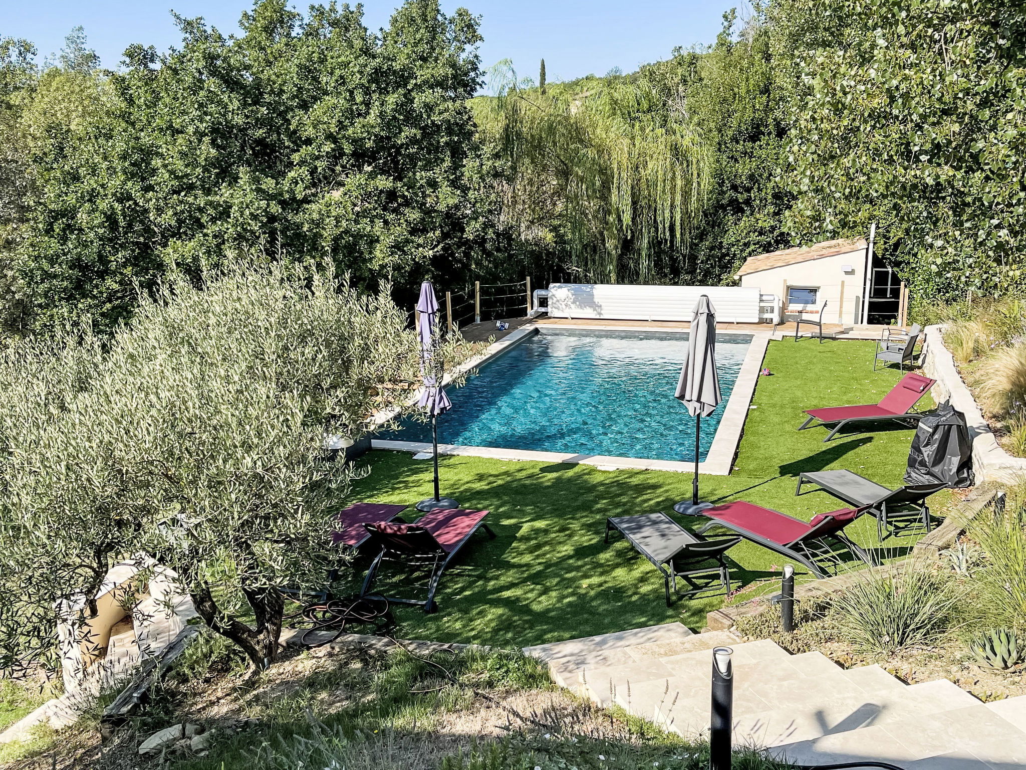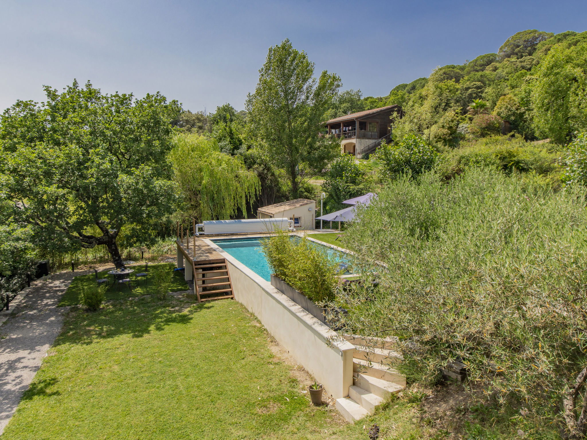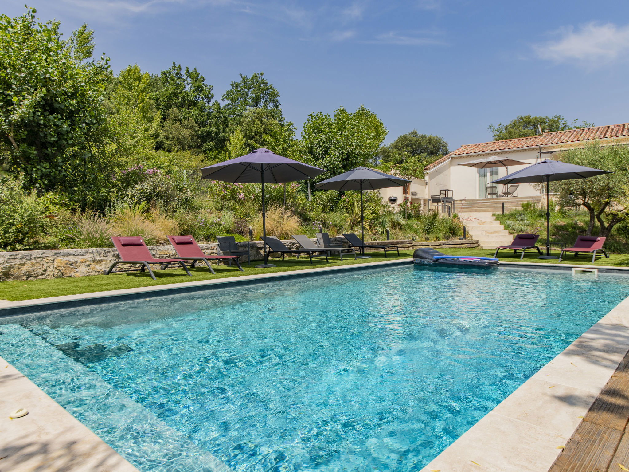 Villa "Castellas", 2 storeys, renovated in 2025. On the outskirts, on top of a hill. Private: swimming pool (5 x 10 m, depth 160 - 160 cm, seasonal availability: 01.May. - 30.Sep.) with shutter cover and salt-electrolysis pool-cleaning system. Outdoor shower. Motor access (50 m via unmade road). Parking (for 4 cars) on the premises. E-charging station. Grocery 6 km, supermarket 11.6 km, restaurant 5 km, bakery 5 km, bus stop "Crespenou" 3.1 km. Golf course (9 hole) 22 km, tennis 12 km, riding stable 7 km. Nearby attractions: Uzès 14 km, Saint-Hippolyte-du-Fort 10 km, Alès 30 km, Nîmes 54 km, Grottes des Demoiselles 26 km, La Grande Motte 64 km. Please note: The outdoor shower is heated. The pool has a counter-current swimming system, an aquabike and spa jets.