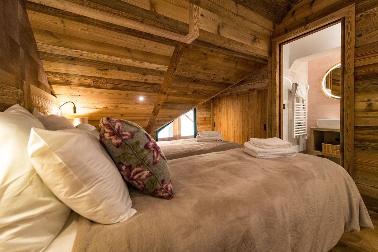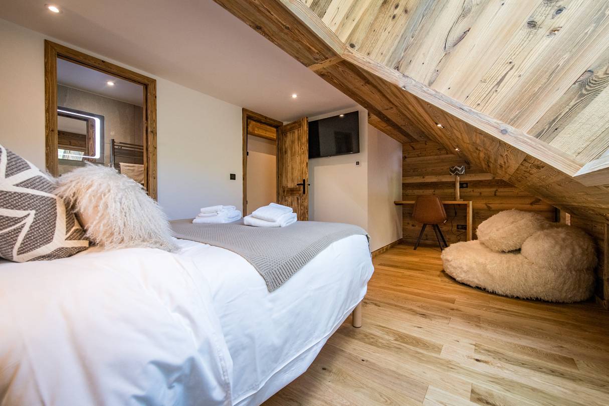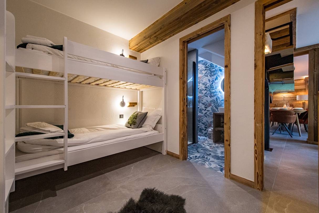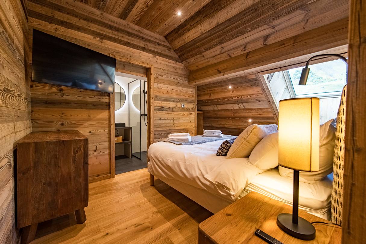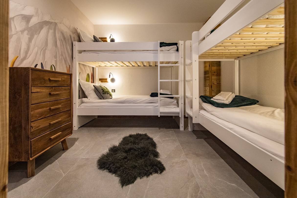 On this floor, one double bedroom has a 160cm bed, own shower room with toilet, closet and TV. Still on the lower floor, a mountain corner with two 80*190 cm bunk bed sleep 4 and own shower room with toilet.