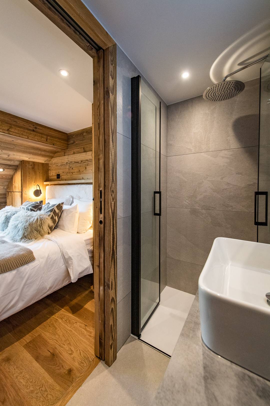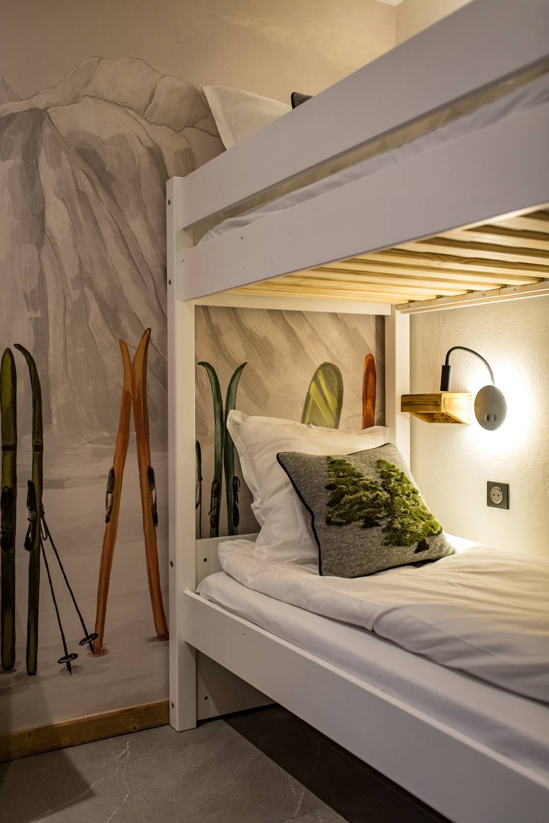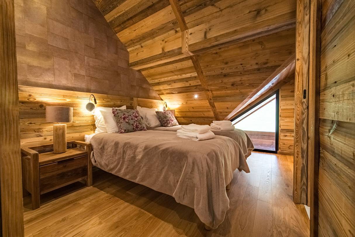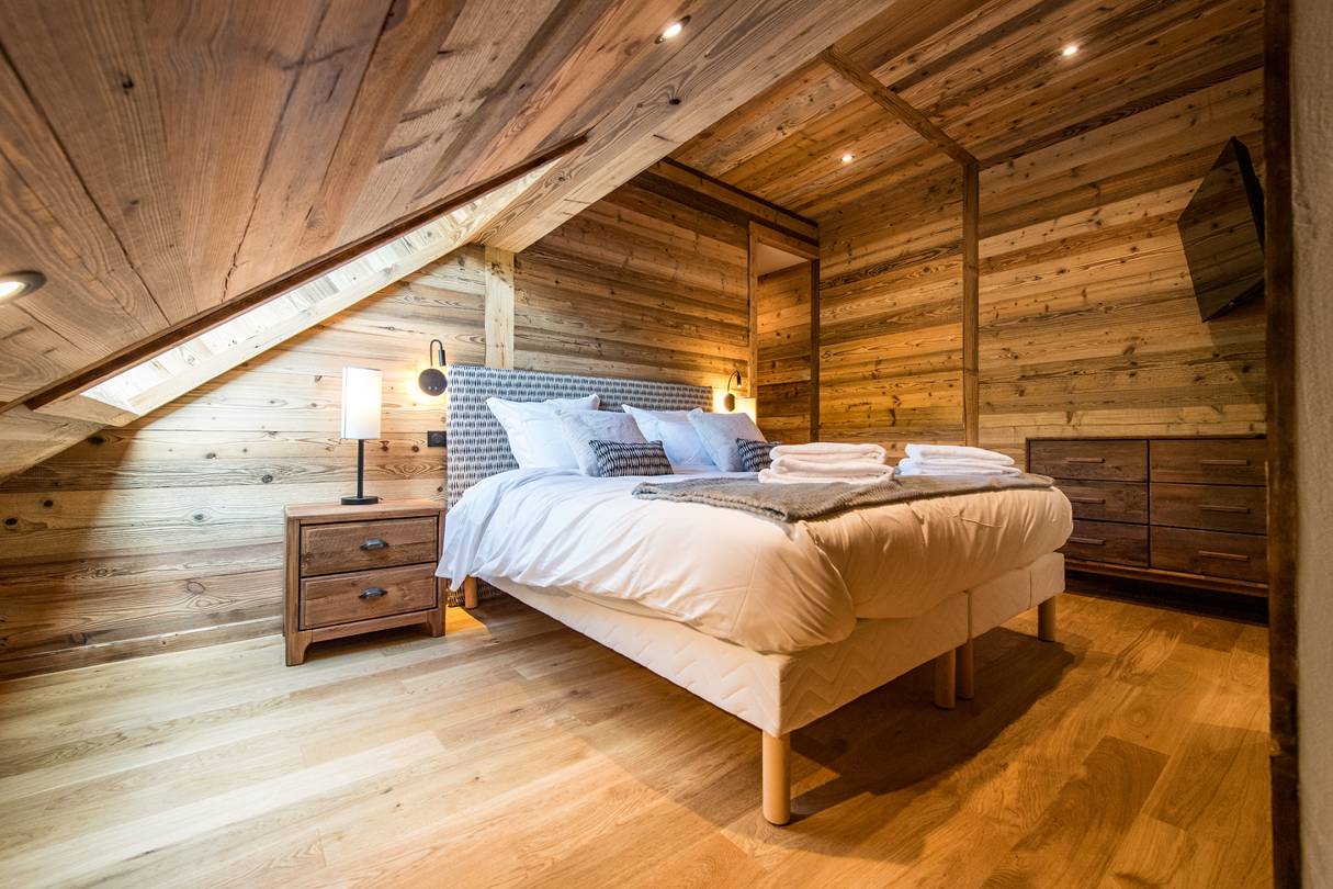 On this floor, one double bedroom has a 160cm bed, own shower room with toilet, closet and TV. Still on the lower floor, a mountain corner with two 80*190 cm bunk bed sleep 4 and own shower room with toilet.