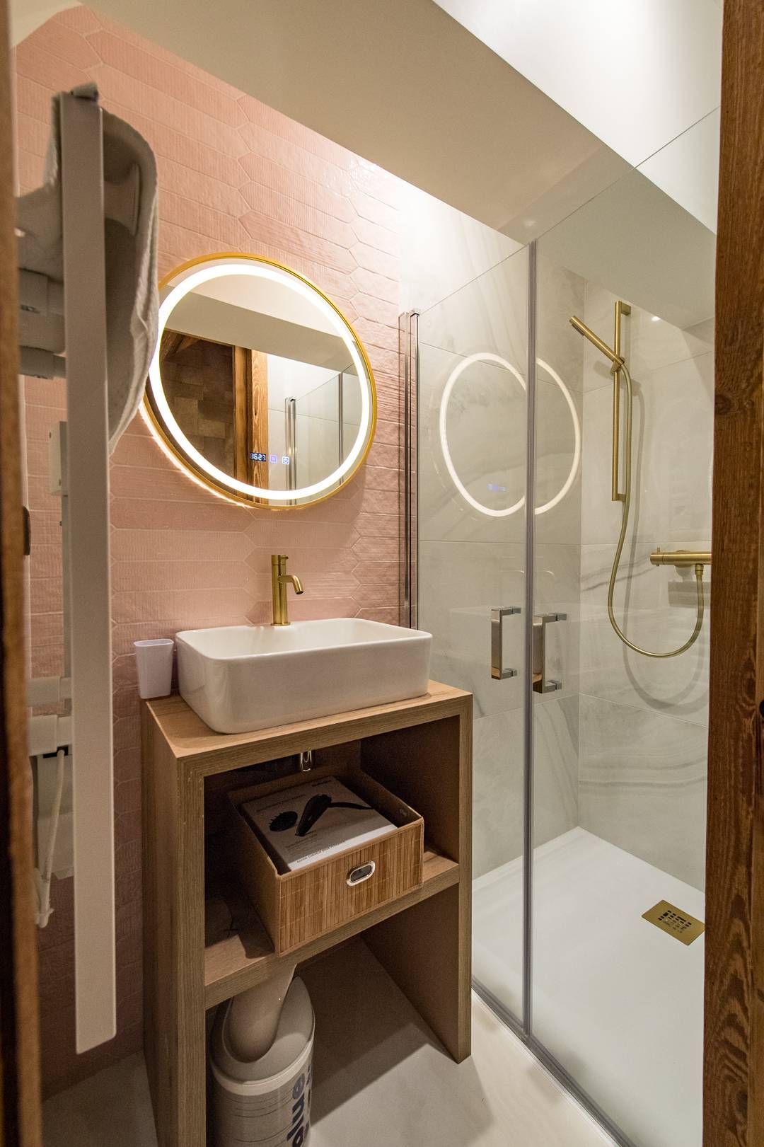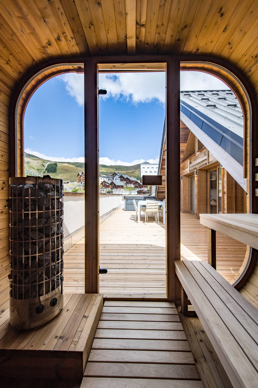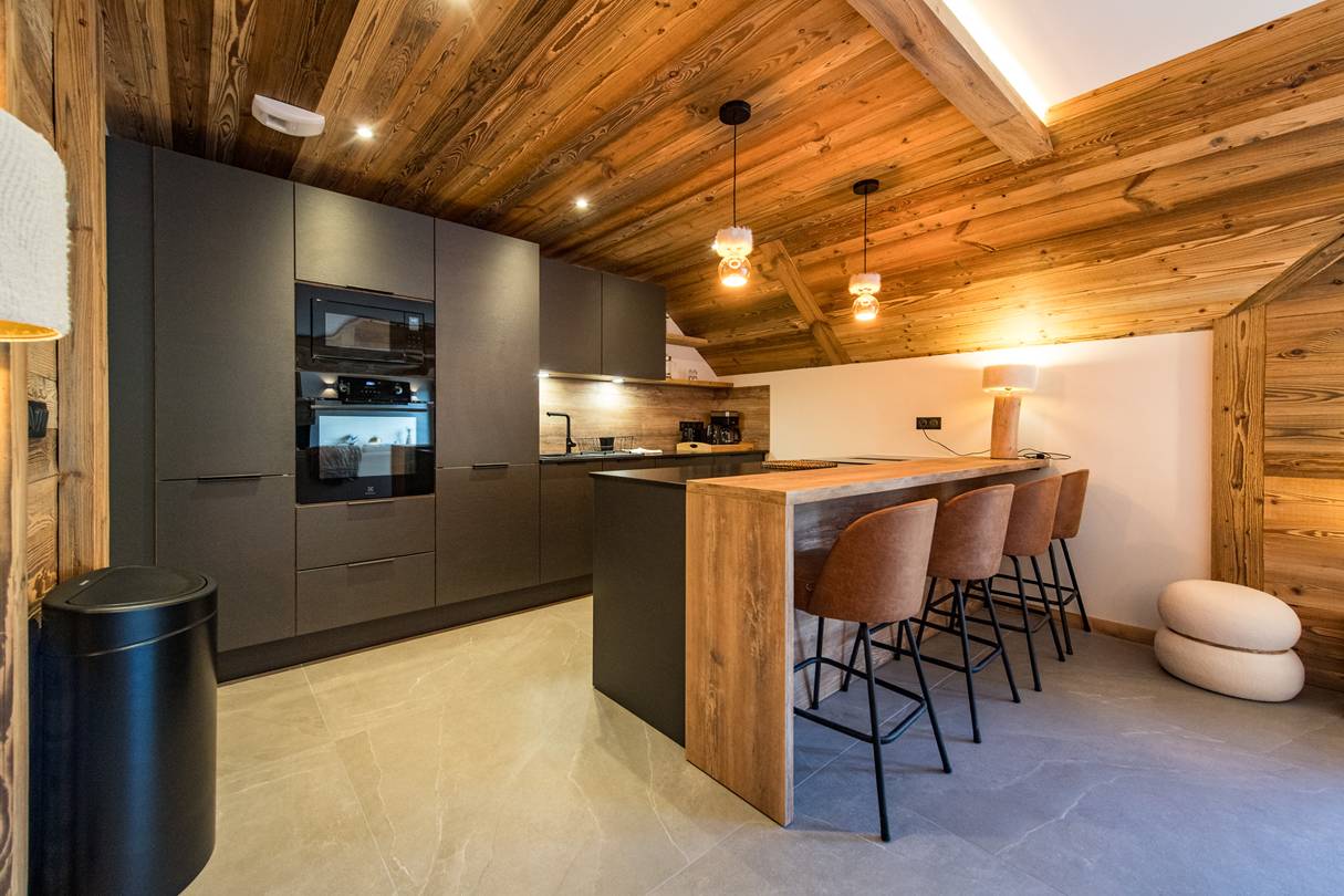 The flat comprises a living room opening onto a 40m2 terrace with jacuzzi and sauna facing west.