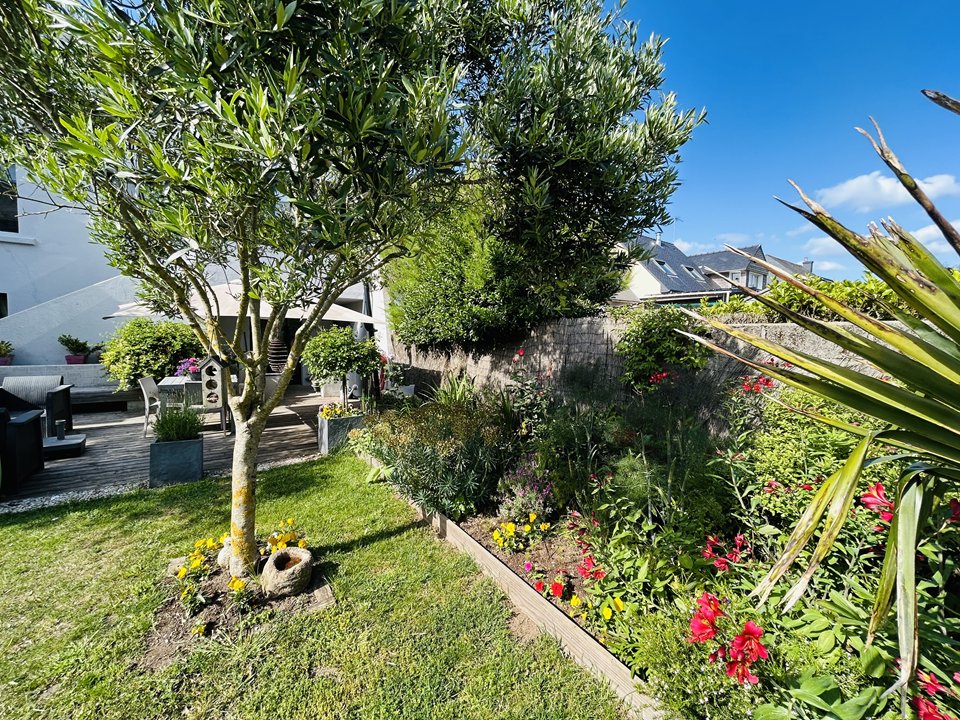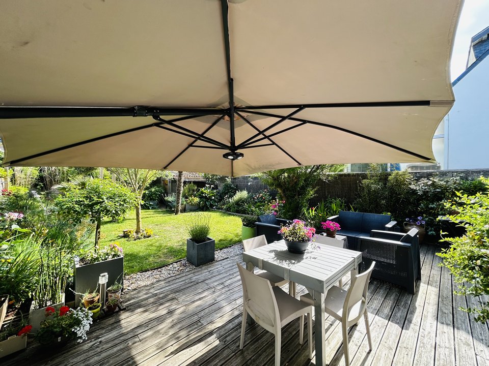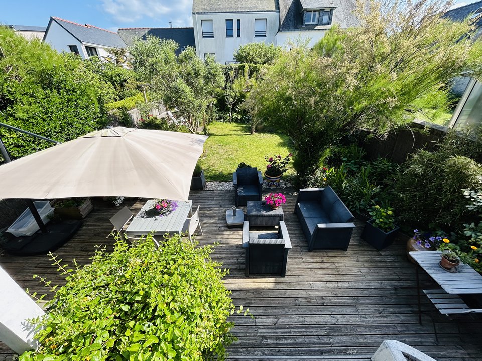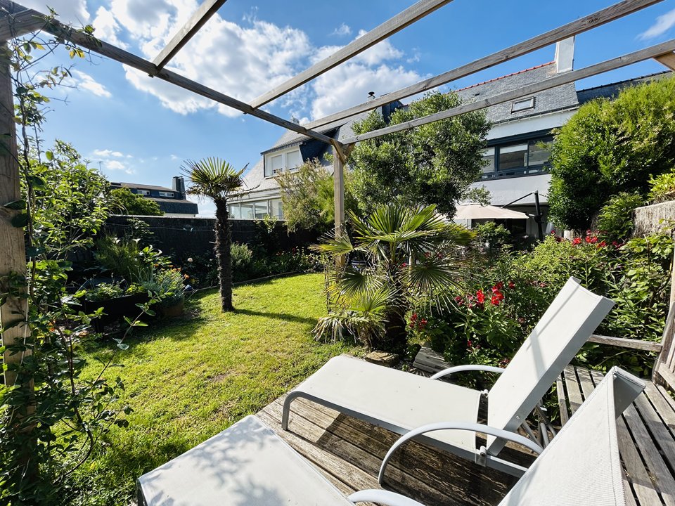 Beautiful fenced garden with large wooden terrace equipped with a garden furniture, facing south-west.