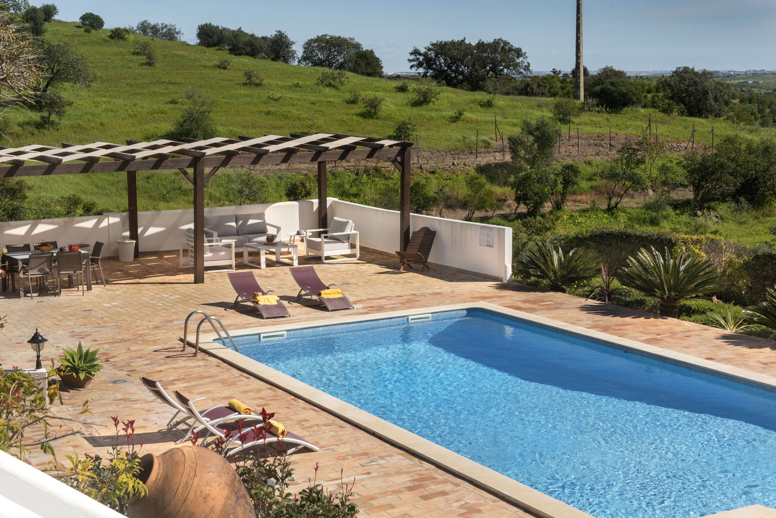 The spacious living room is equipped with a television and international channels, providing moments of leisure. The fully equipped kitchen allows for preparing meals with great convenience, maintaining a touch of authenticity. Outside, the typical local elements create a welcoming space to contemplate the landscape, while the patio is ideal for outdoor dining. The shared pool, surrounded by a well-maintained garden and with a covered seating area, is perfect for refreshing on hot days. For the little ones, the swing and slide ensure fun. Outdoor parking is also available. For special moments, the house also has a wine cellar, accessible under specific conditions presented at check-in.