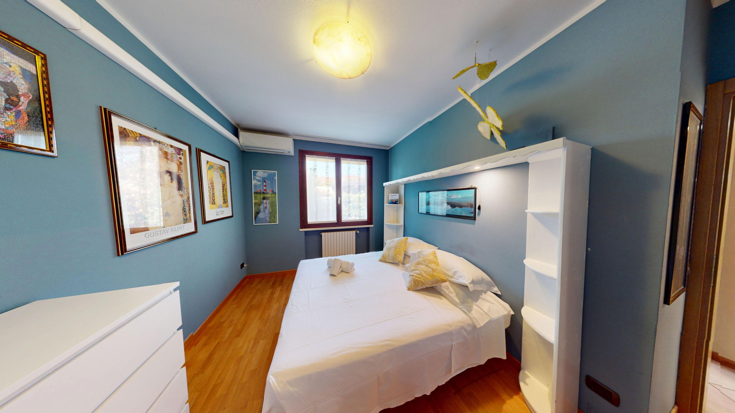 The accommodation has three bedrooms, carefully furnished with two double beds and a single bed, capable of comfortably accommodating up to 5 people. The rooms are equipped with air conditioning in the living room and bedroom area, while electric heating ensures optimal comfort throughout the year.
