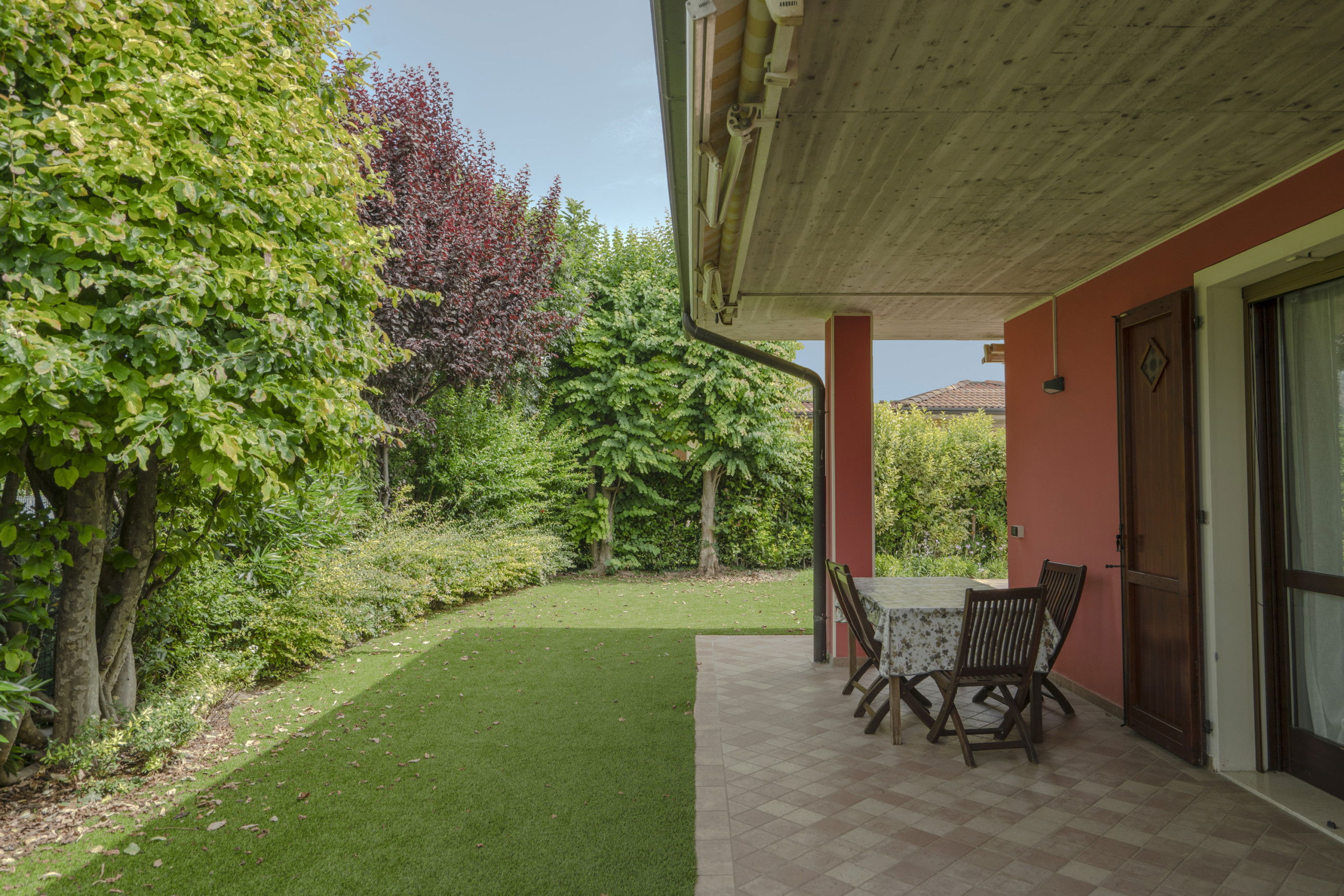 The external spaces are particularly well-maintained, with a 150 sqm garden of synthetic grass enclosed and furnished with garden furniture, perfect for outdoor relaxation moments. The property is pet-friendly, allowing up to two pets, and features two private parking spaces outside.