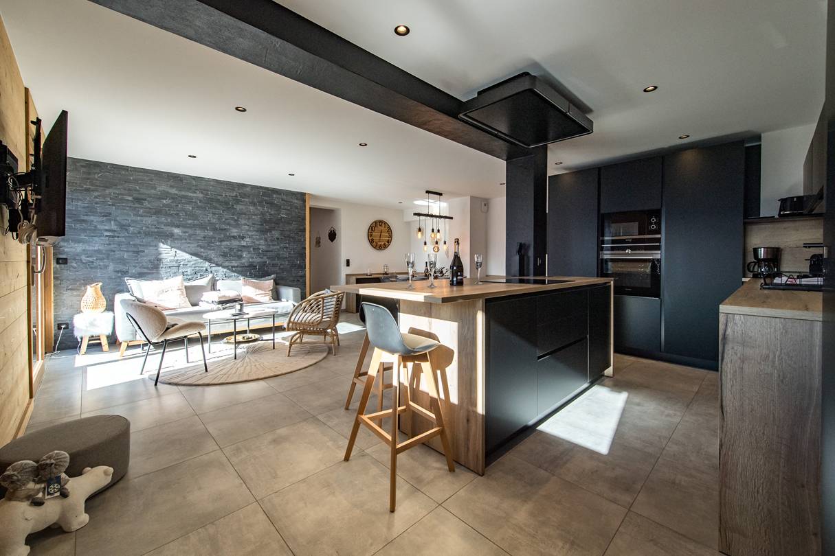 On the level of the apartment is the living room with a lounge area with TV & sofa bed, a dining room and an equipped kitchen. The kitchen is equipped with all the necessary comforts (induction hob, oven, microwave oven, etc.). This room opens onto the balcony of 6.5m2 facing South and furnished.