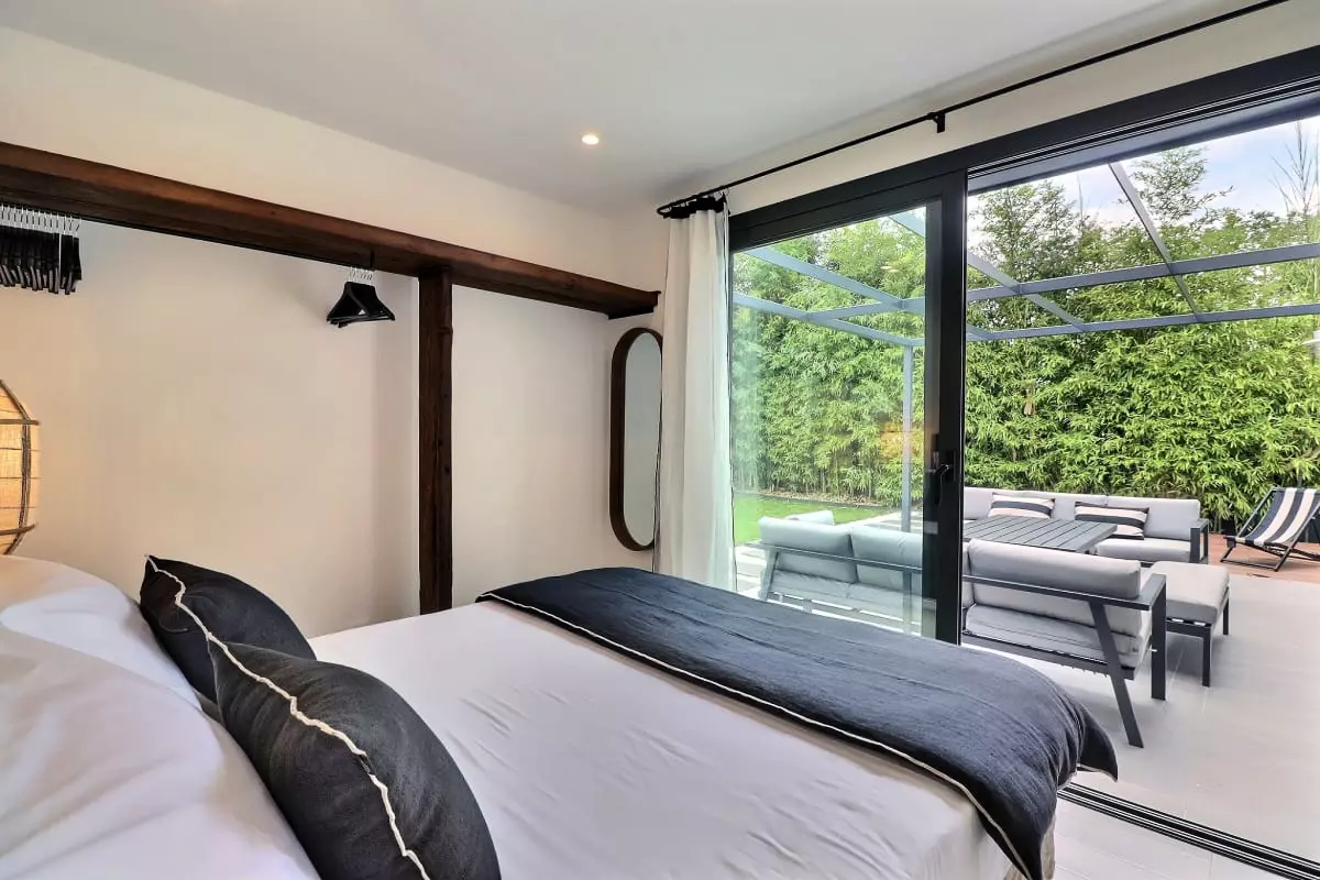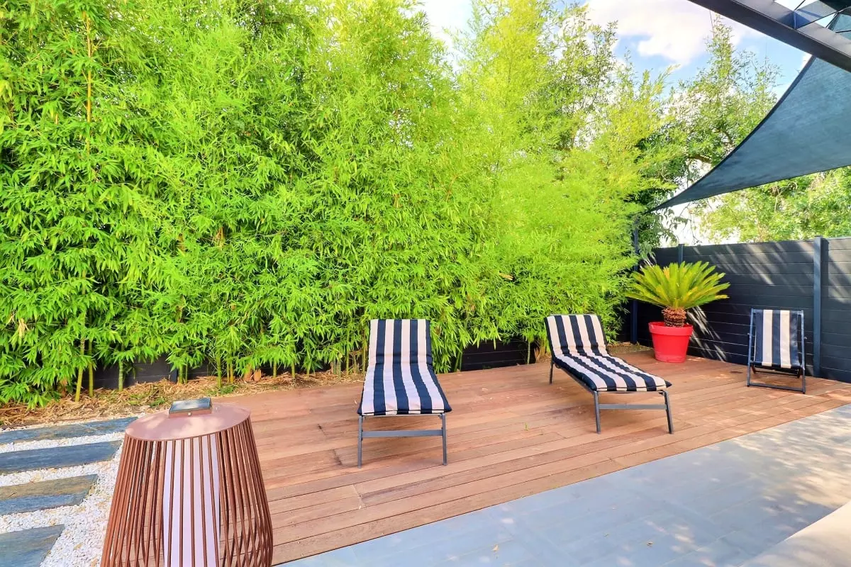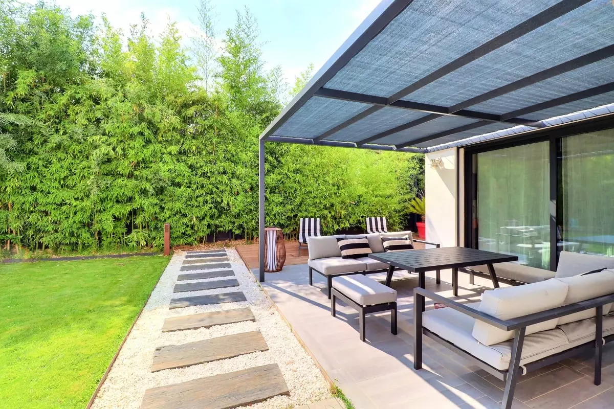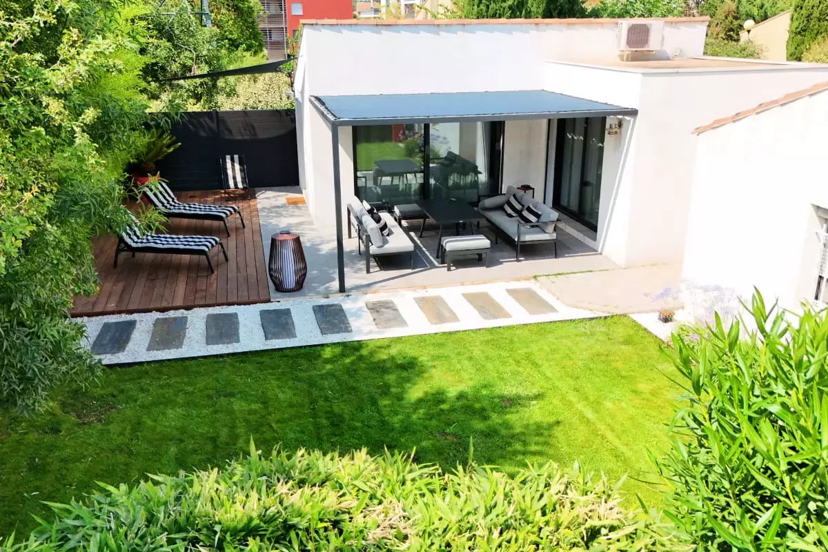 You'll enjoy a large terrace furnished with a modular sofa, ideal for al fresco dining or relaxing. You'll also find two deck chairs under a covered pergola.