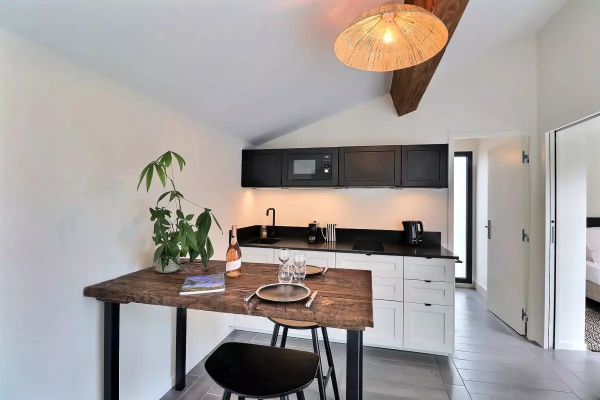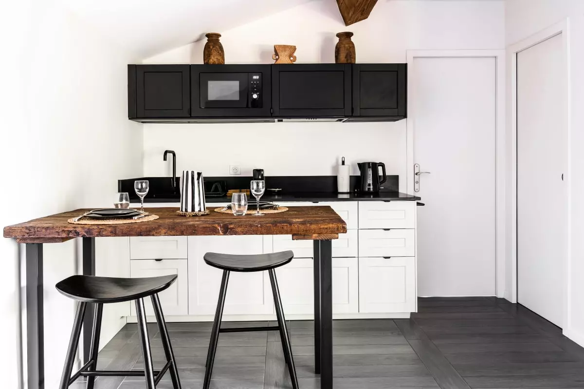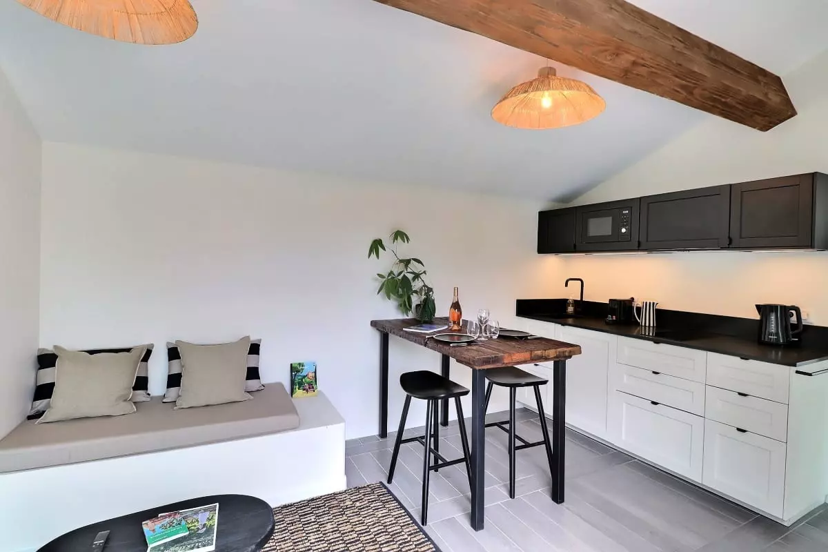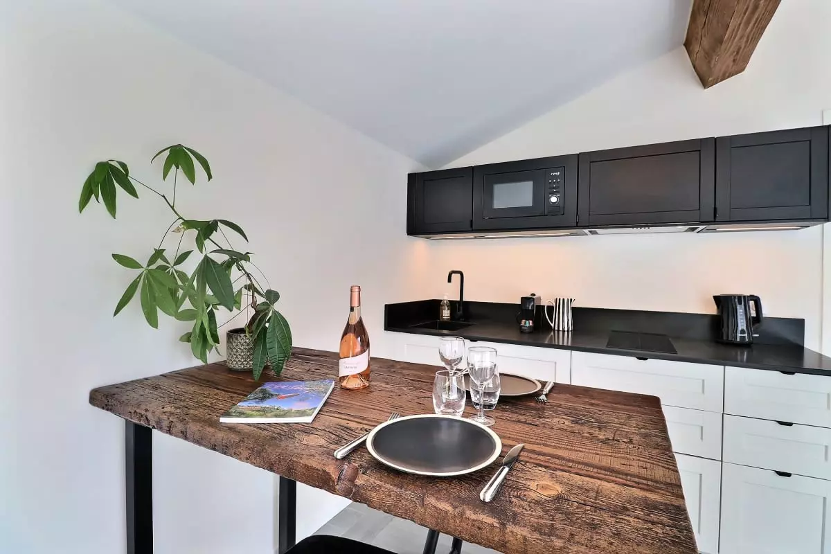 Modern and functional kitchen with: 2-burner ceramic hob, microwave, Nespresso coffee machine, refrigerator with small freezer, dishes and utensils for 4 people