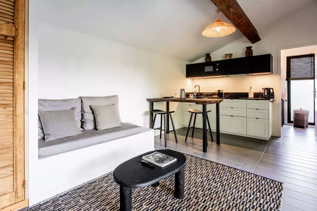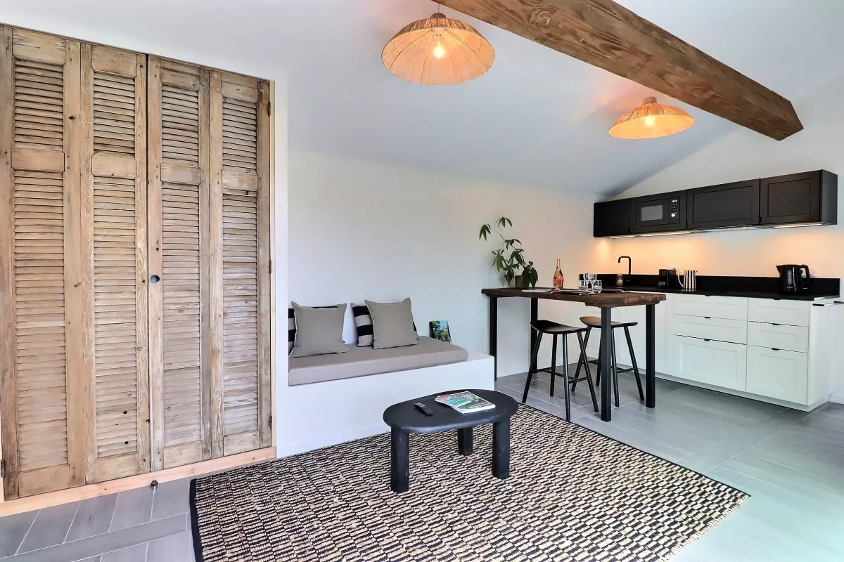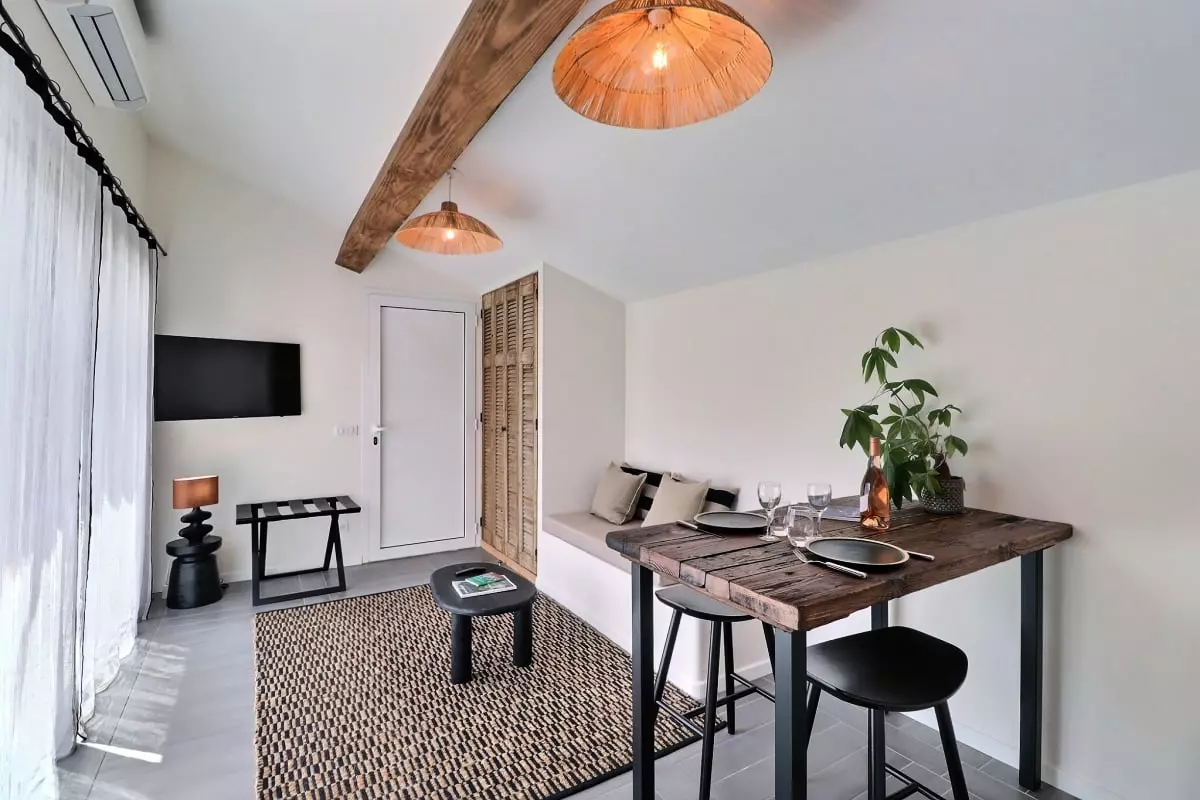 Modern, fully equipped apartment, ideal for 2 people. Bright space with a 2-seater sofa and a wall-mounted smart TV for relaxing moments after a day of exploring.