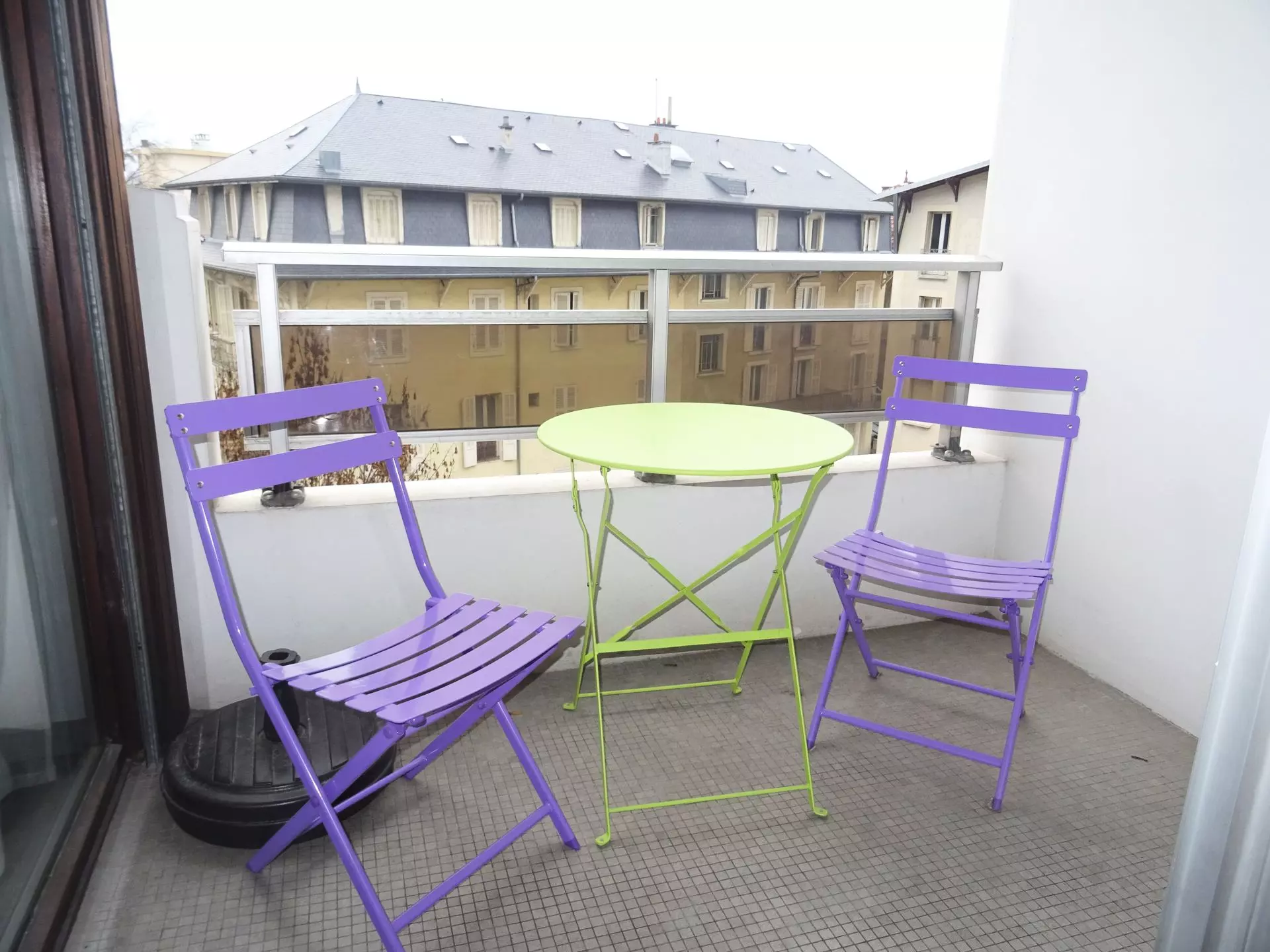 Balcony equipped with a table, 2 chairs, 1 parasol, 1 parasol base, 1 Dyson fan.