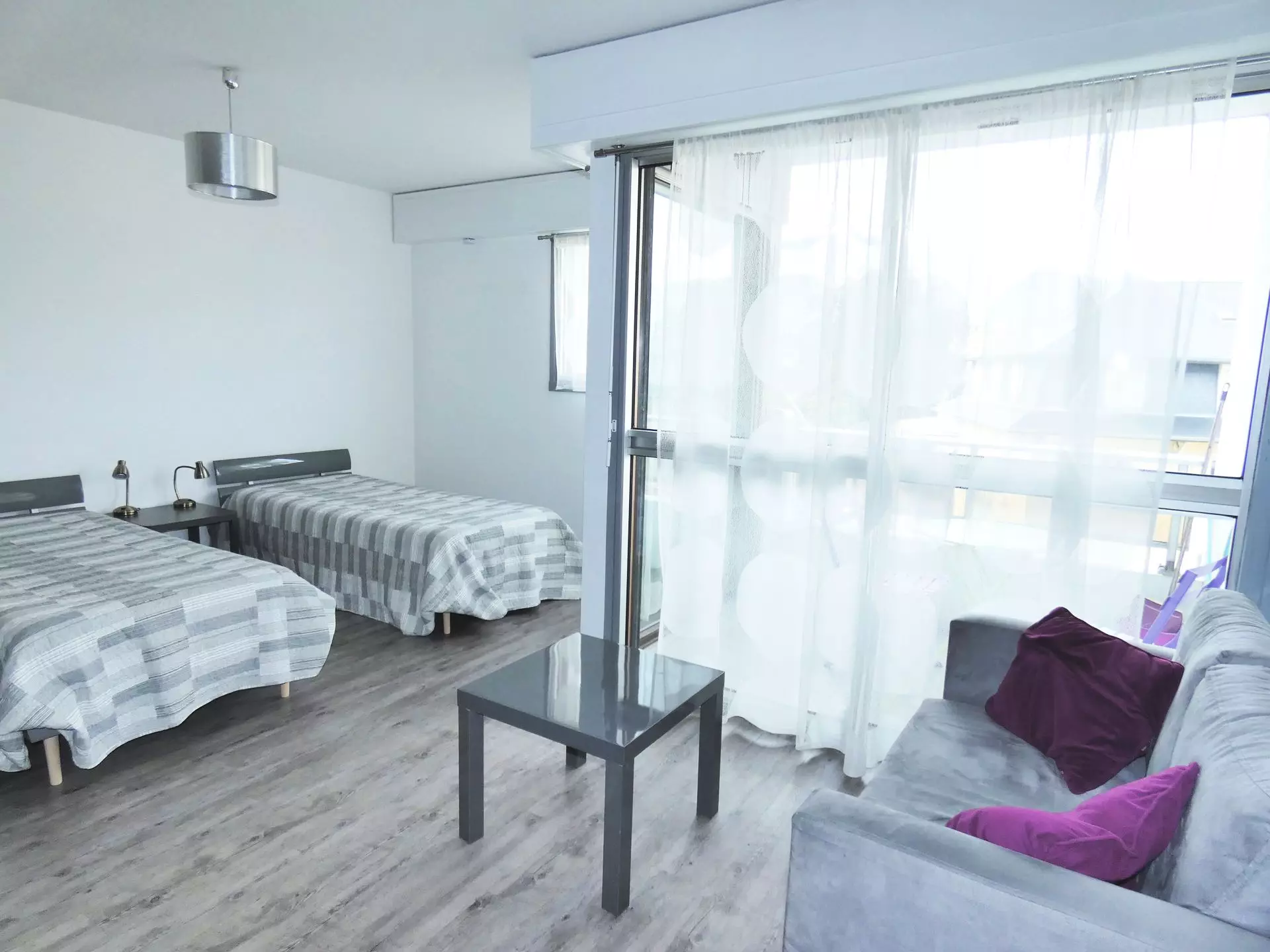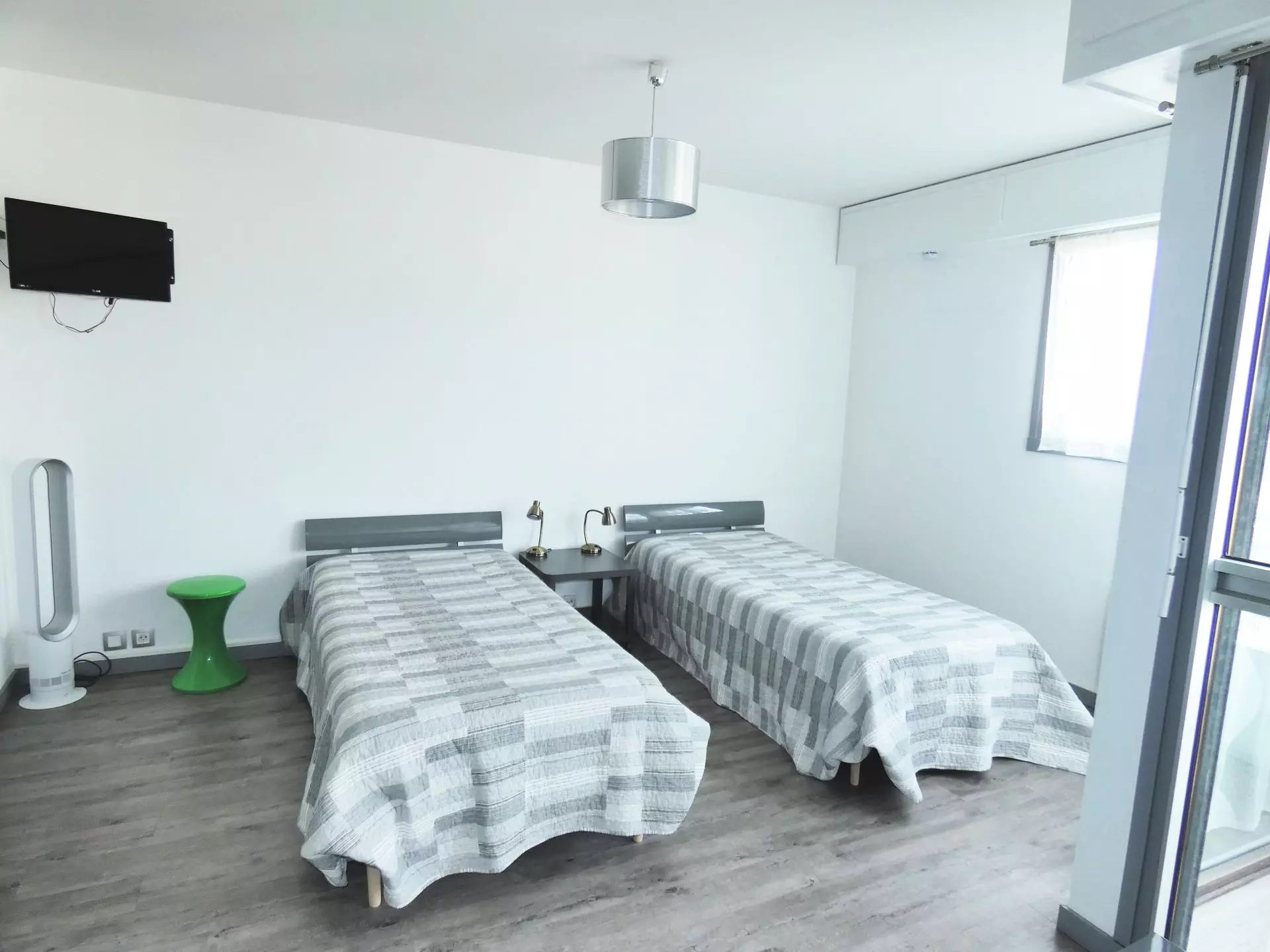 Main room (PVC floor): 2 90cm beds, 1 bedside table, 2 lamps, 1 sofa, 1 coffee table, 1 table, 2 chairs, 1 wall-mounted flat-screen television, 1 wall-mounted wardrobe, 1 washing machine.