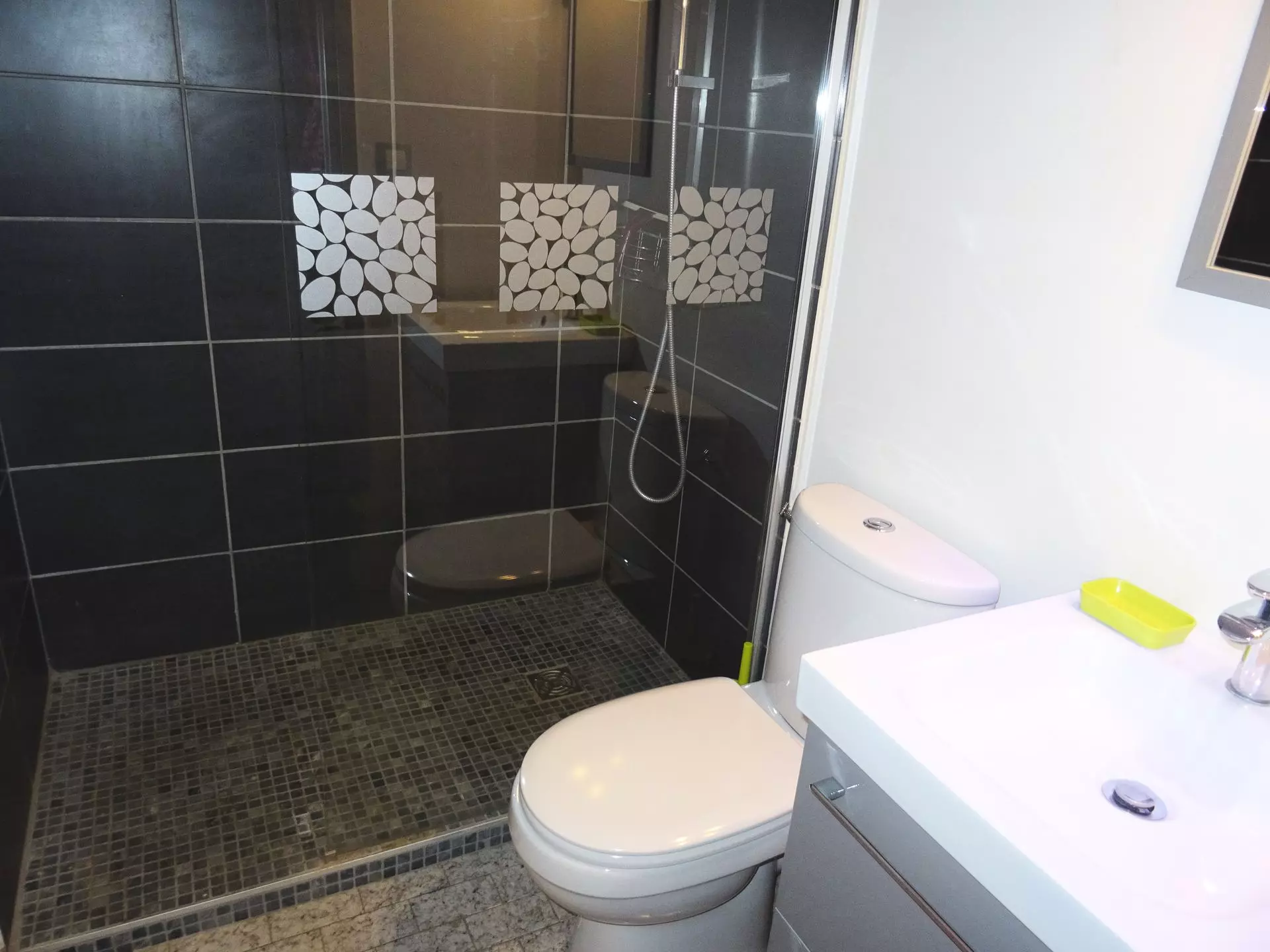 Shower room (tiled): Italian shower, vanity sink, electric towel dryer, WC.