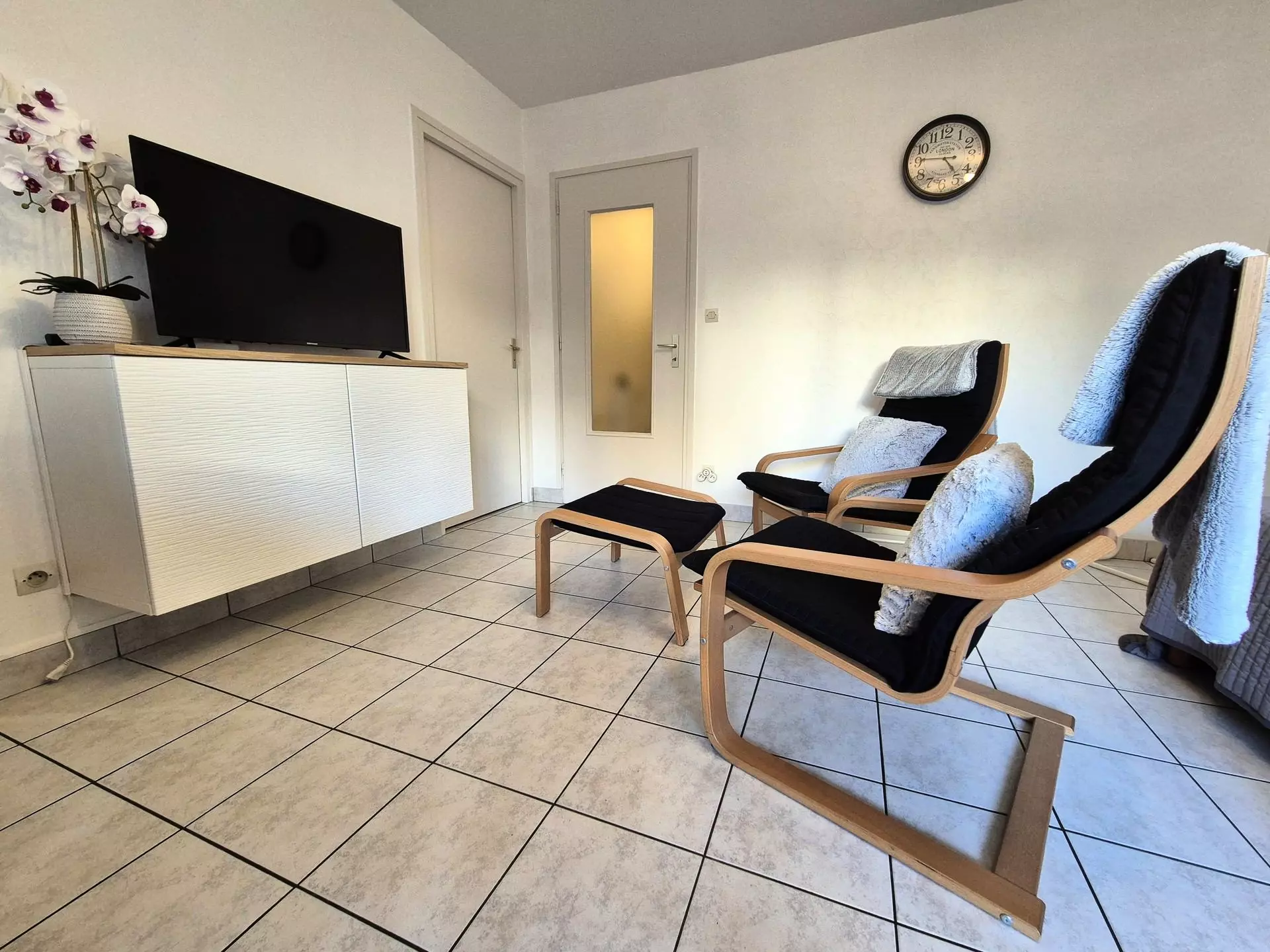 Main room (tiled floor): 2 beds 90cm, 2 bedside tables, 1 table 4 chairs, 1 wall unit 2 doors 2 armchairs with footrests, 1 lampshade, 1 flat screen television 100cm, 1 radio Kitchen with window (tiled floor): sink, 1 fridge/freezer, 2 ceramic hobs, 1 extractor fan, 1 microwave, 1 electric oven, 1 washing machine, 1 electric coffee maker, 1 magimix, 1 kettle, 1 toaster, crockery and cookware.