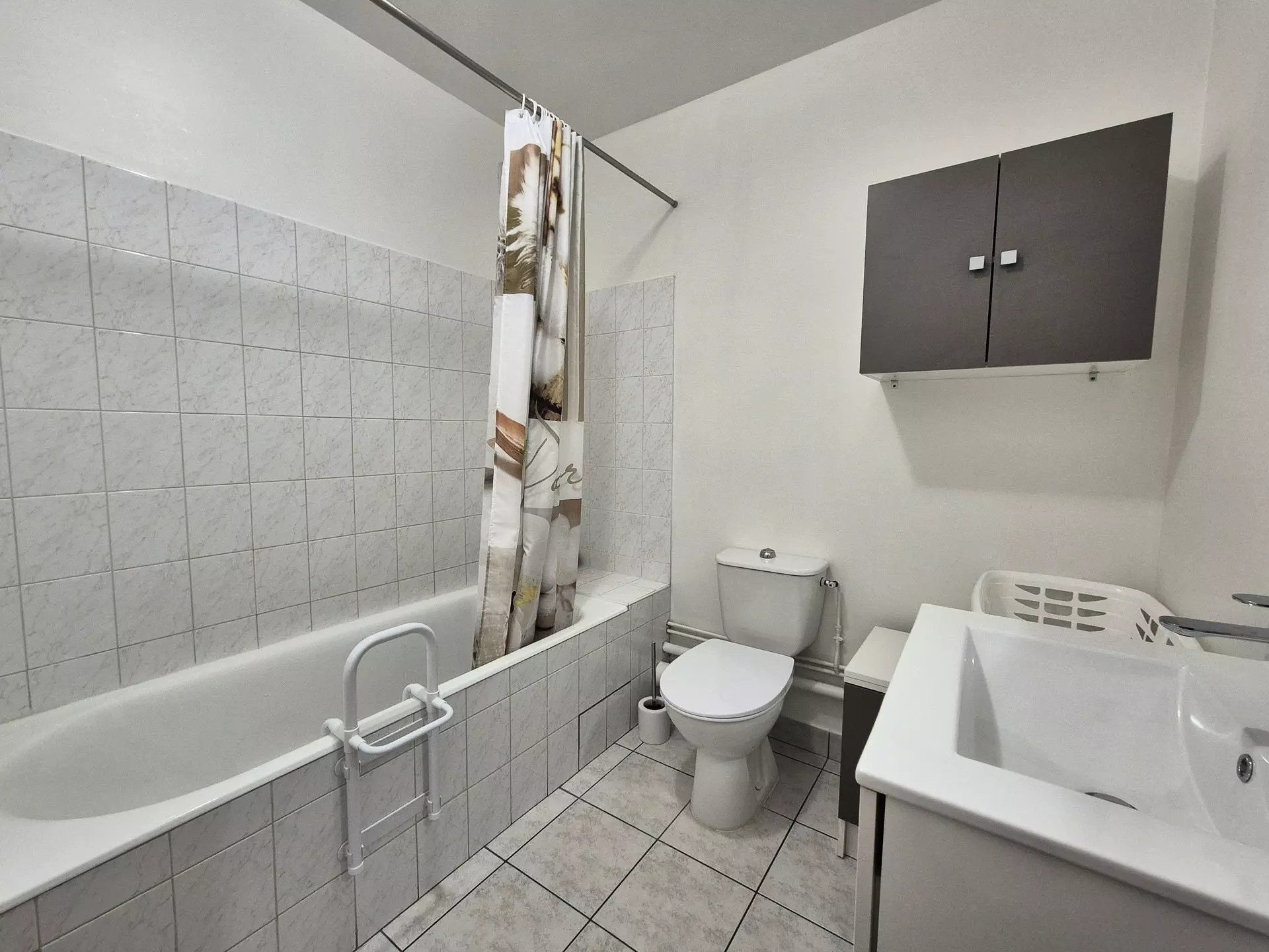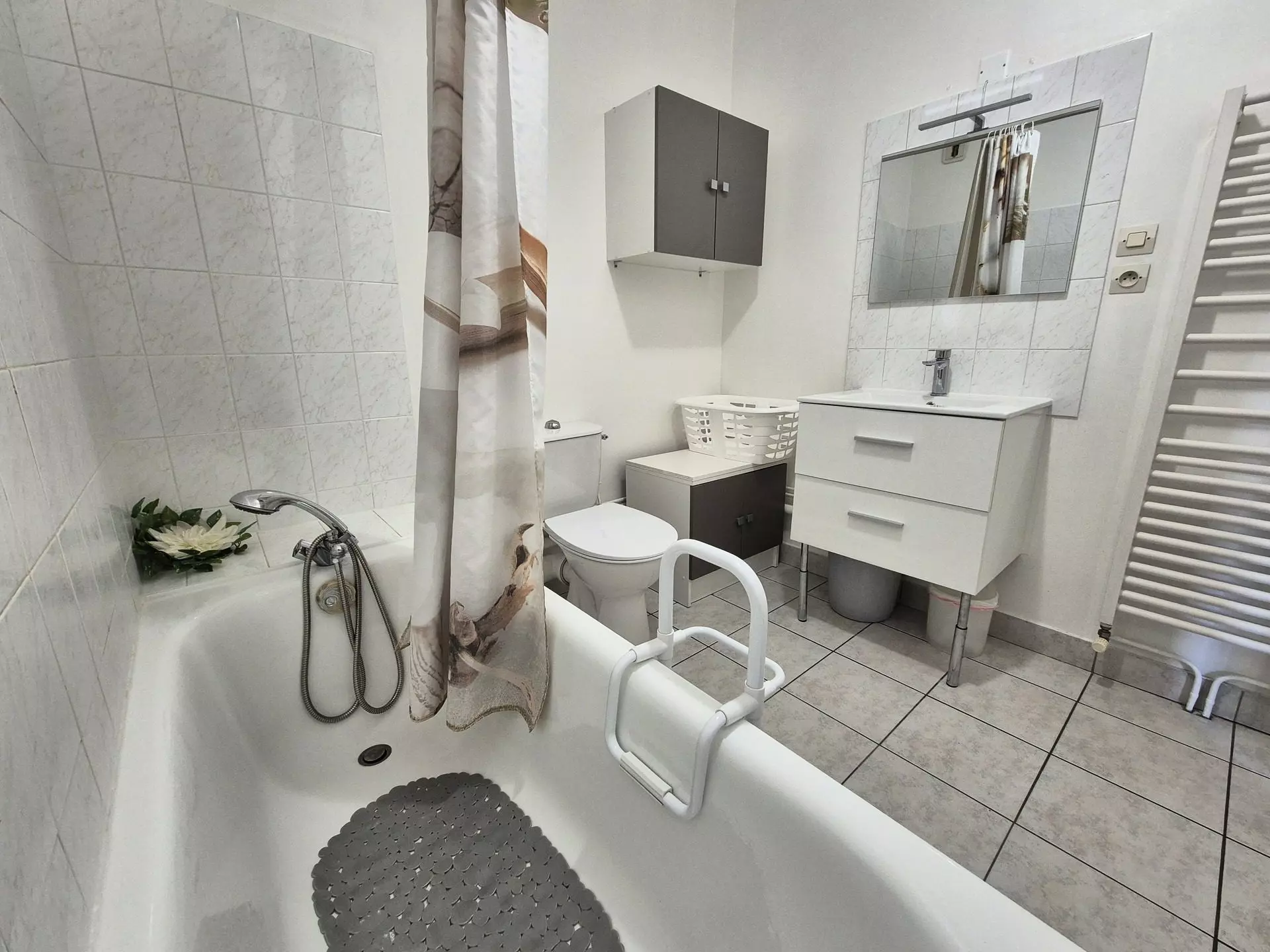 Bathroom (tiled floor): bathtub with grab handle (curtain), 2-door vanity unit, WC, electric towel dryer