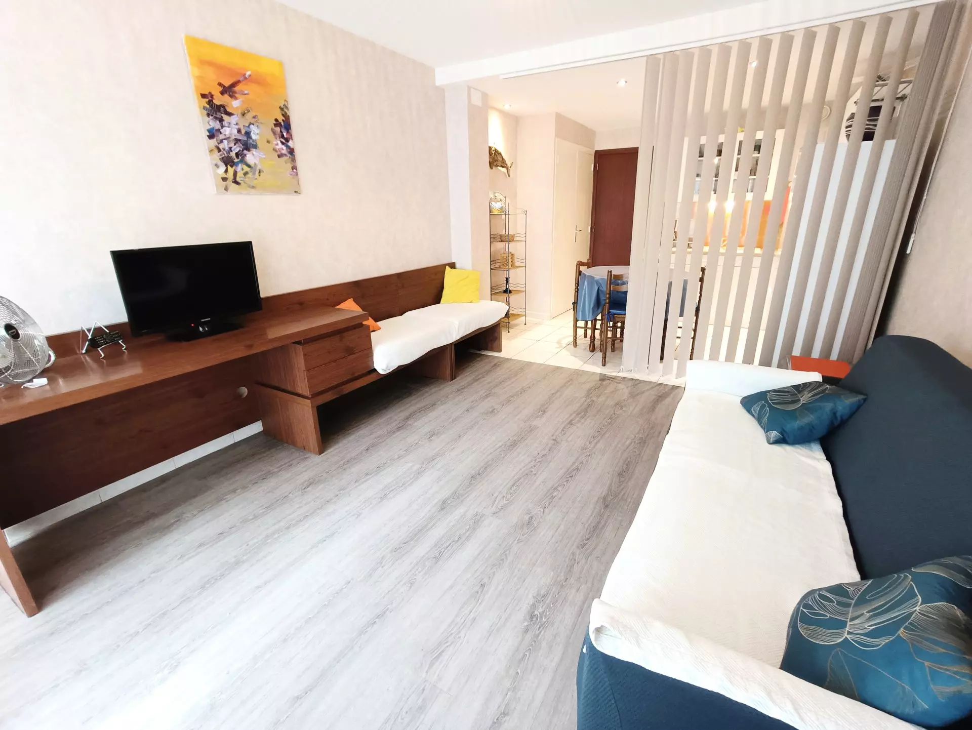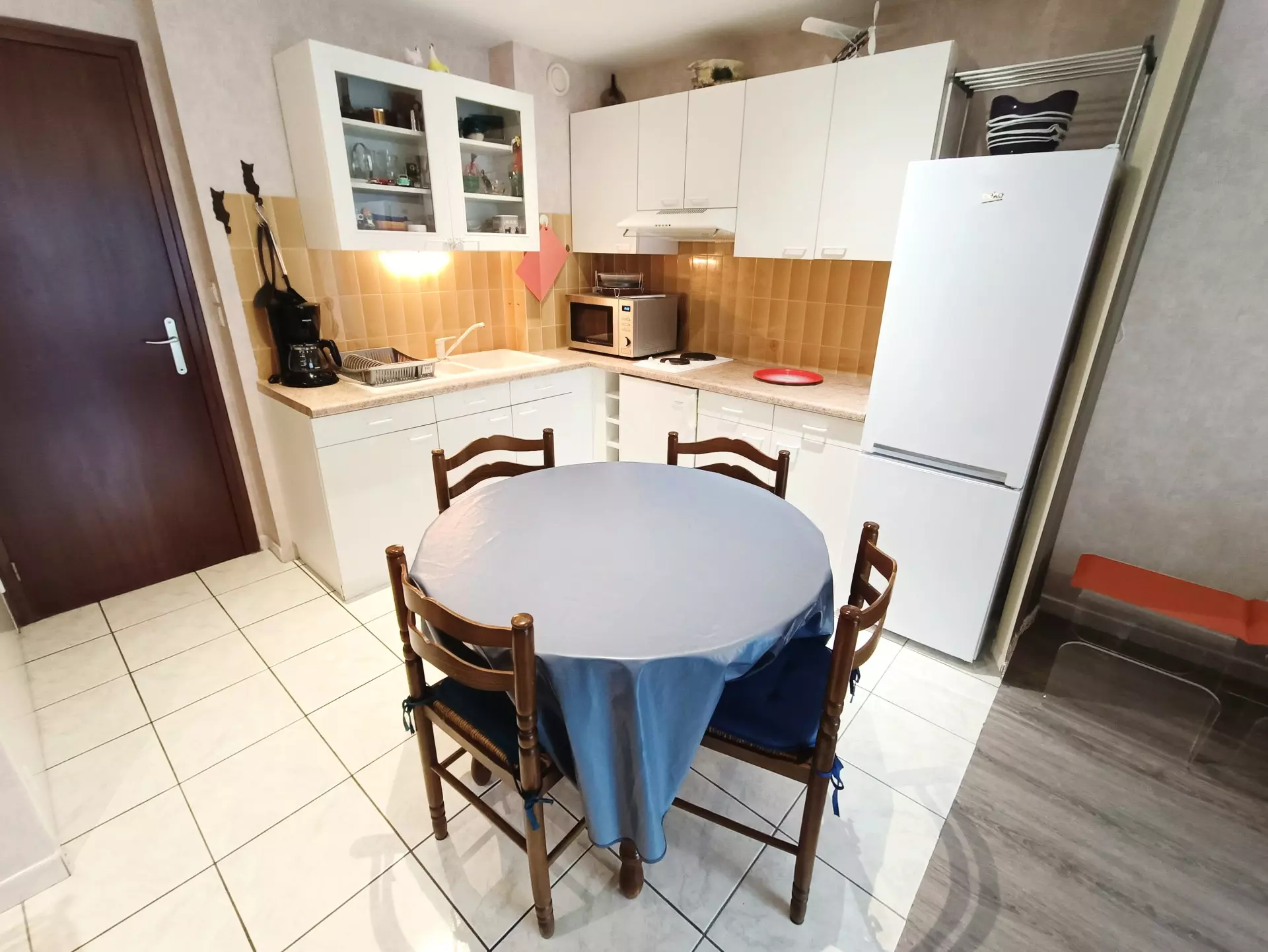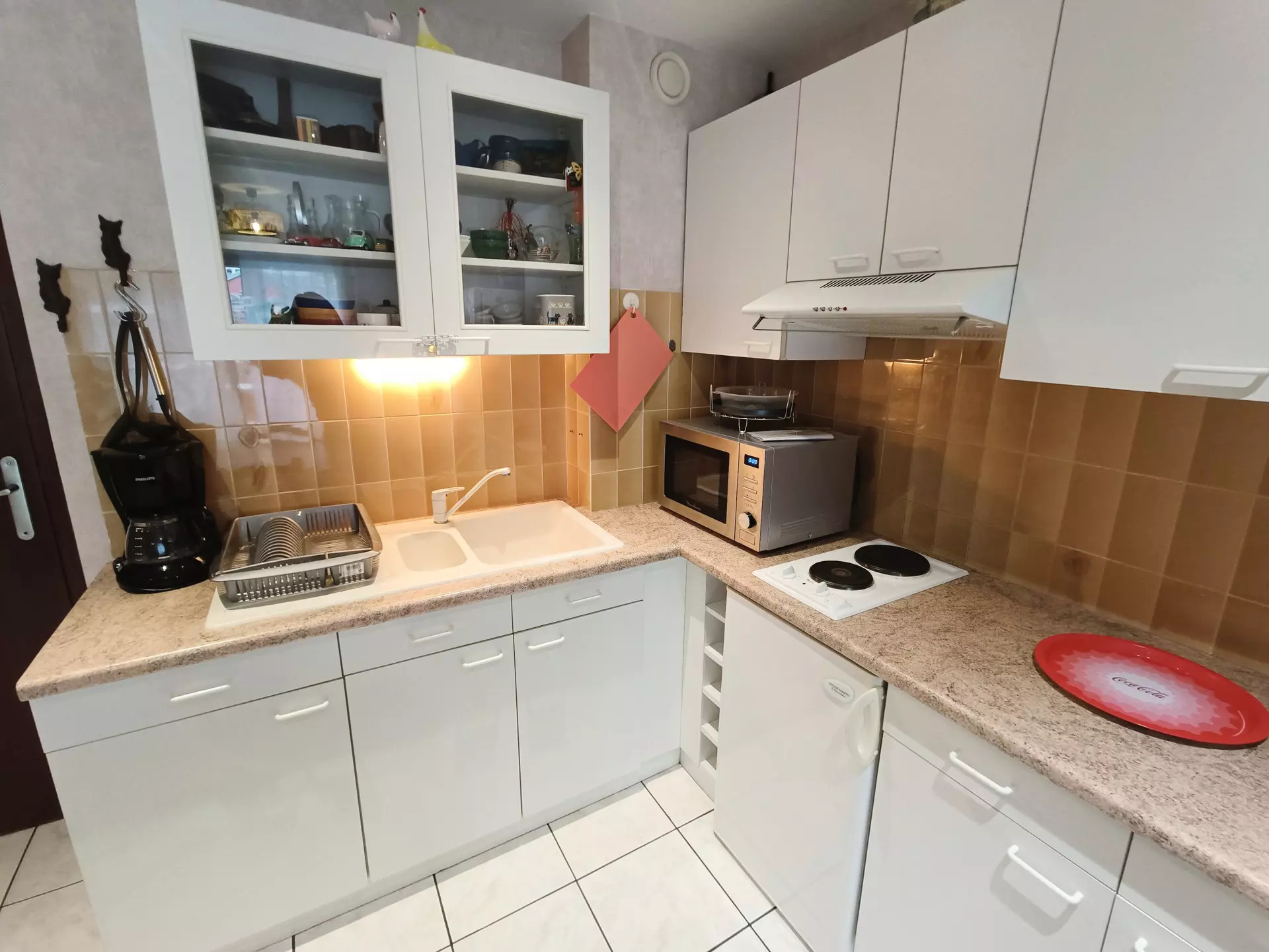 Kitchen area open to the living room (tiled floor): 1 fridge/freezer, 2 electric hotplates, microwave/grill, extractor fan, toaster, kettle, electric coffee maker, crockery and cookware.