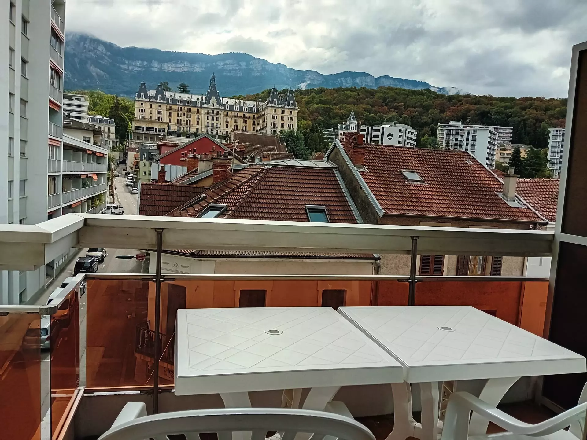 Living room (PVC floor) opening onto furnished east-facing balcony: 1 sofa, 1 low unit with bench seat, 1 flat-screen television, 1 table, 4 chairs.