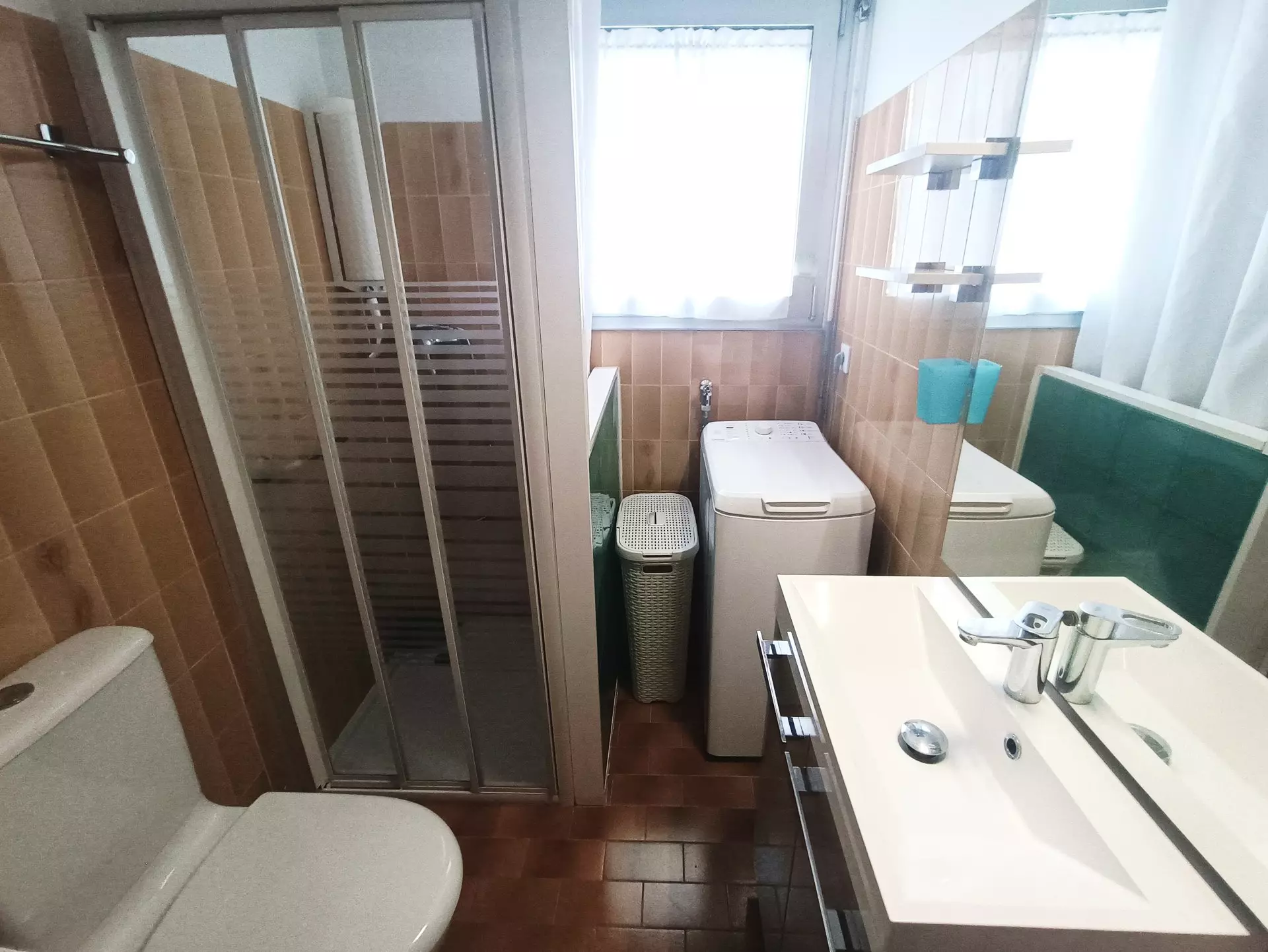 Shower room (tiled floor): shower cubicle, vanity unit, washing machine, towel dryer, toilet.