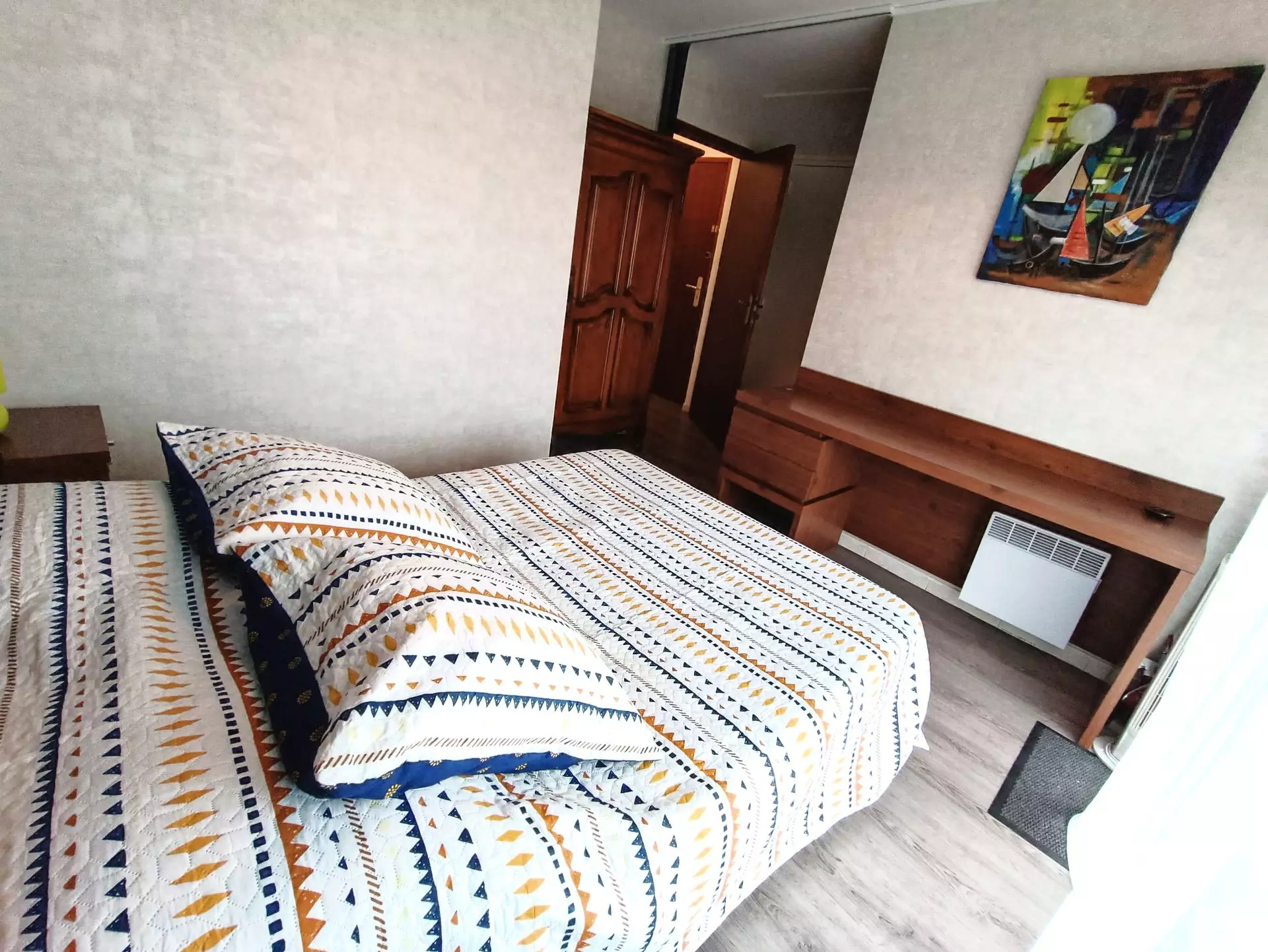 Bedroom (PVC floor) opening onto West balcony: 1 x 140cm bed, 2 bedside tables, 2 lamps, 1 rustic wardrobe.