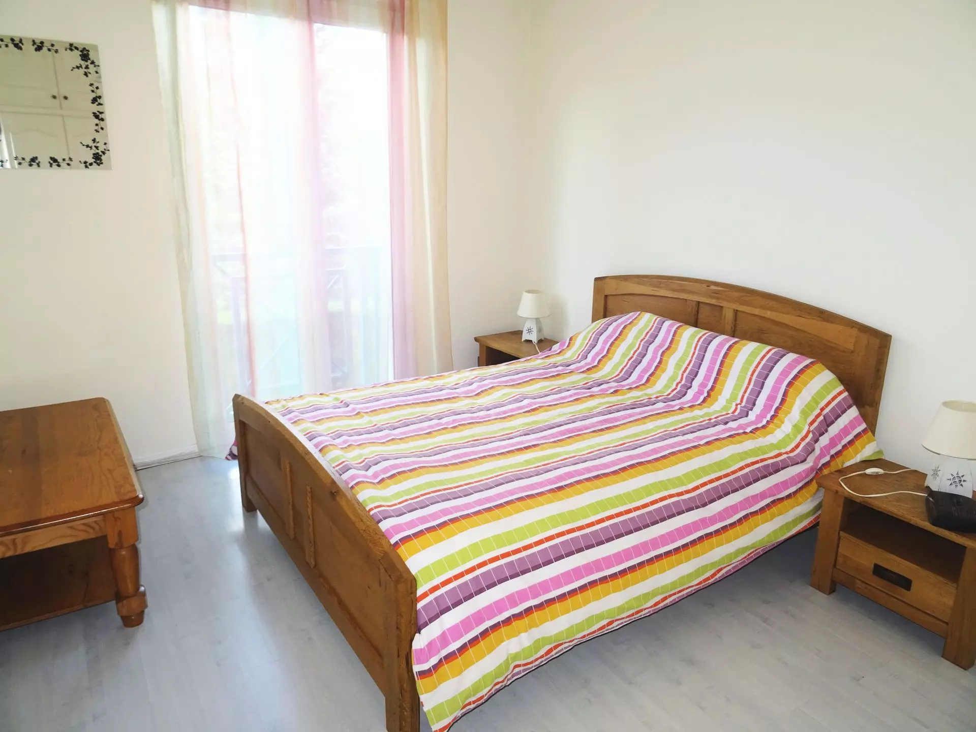Bedroom with North exposure (PVC floor): 1 double bed, 1 wall-mounted wardrobe, bedside tables, lamps, 1 coffee table