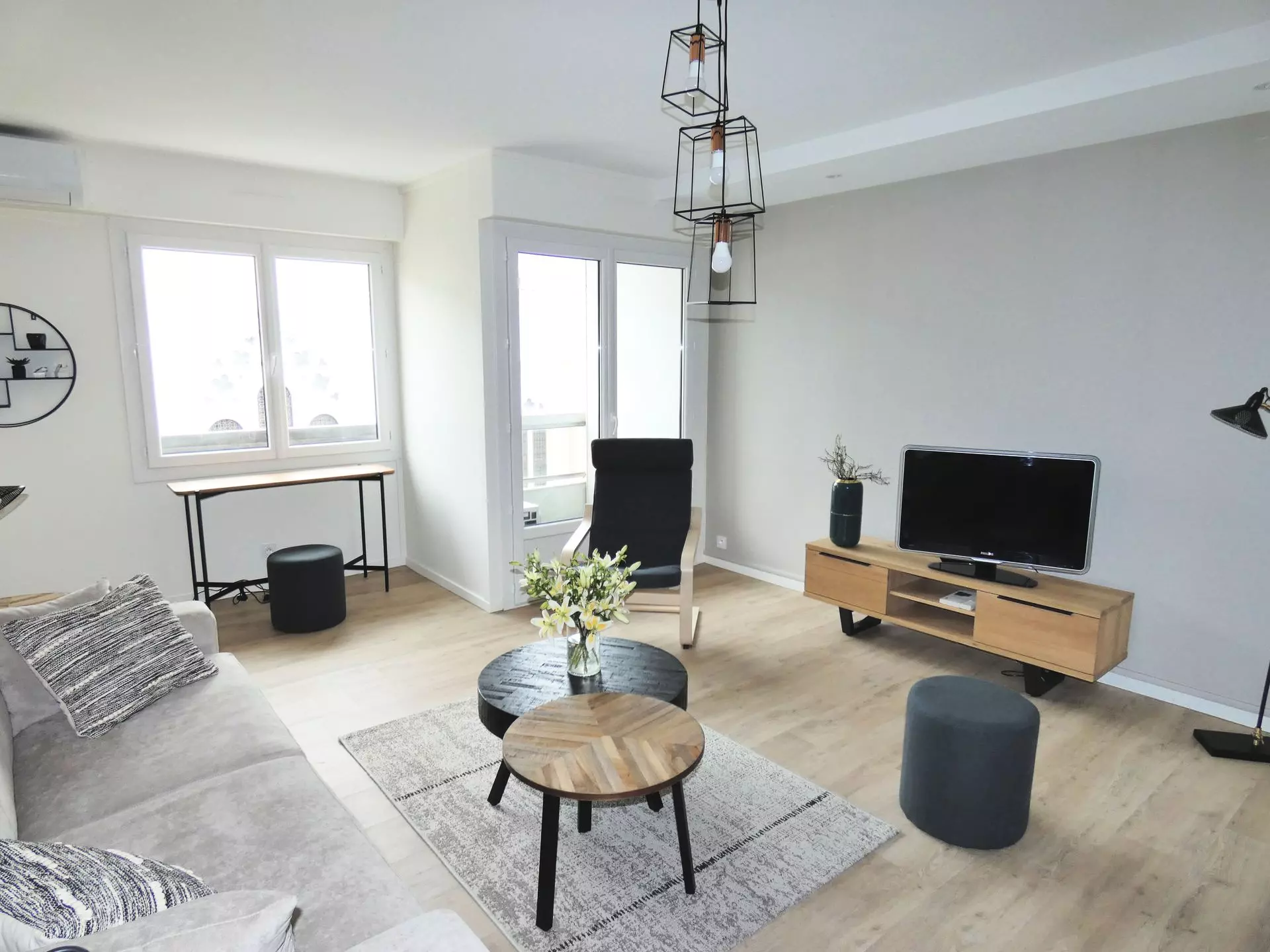 Living room (PVC floor) East loggia access: 1 rapido sofa "160cm", 1 table, 6 chairs, 1 armchair, 4 coffee tables, 2 poufs, 1 desk, 1 low TV cabinet, 1 low sideboard, 1 halogen, 1 flat screen TV, 1 dressing room.