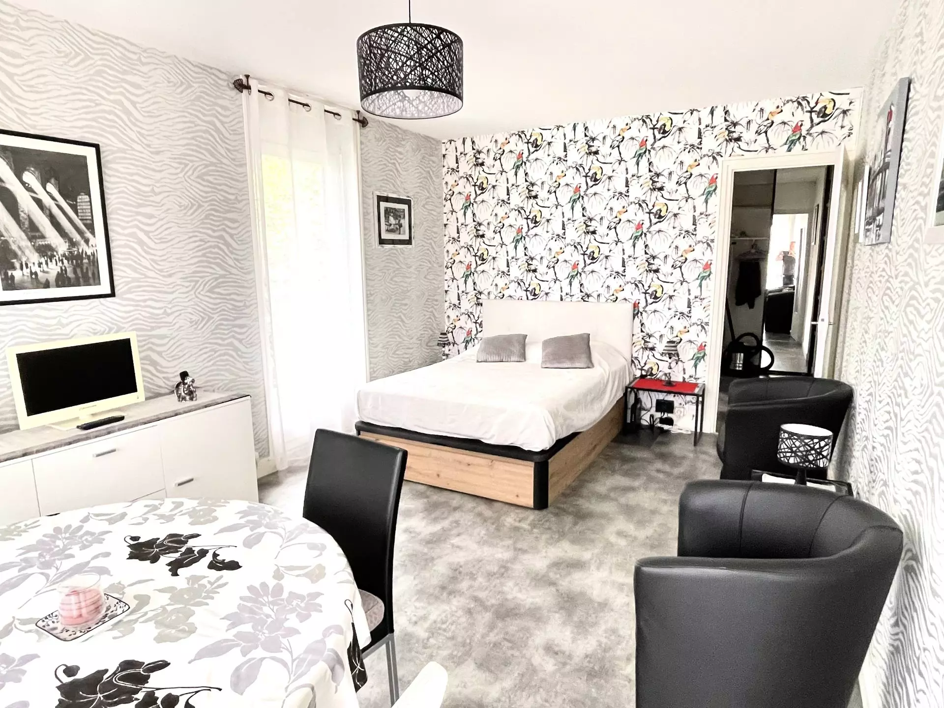 Living room (lino floor) opening onto 2 balconies: 1 x 140cm bed, 2 bedside tables, 2 lamps, 2 club armchairs with footrest, 1 coffee table, 1 low unit with television, 1 table, 4 chairs, 1 serving trolley.