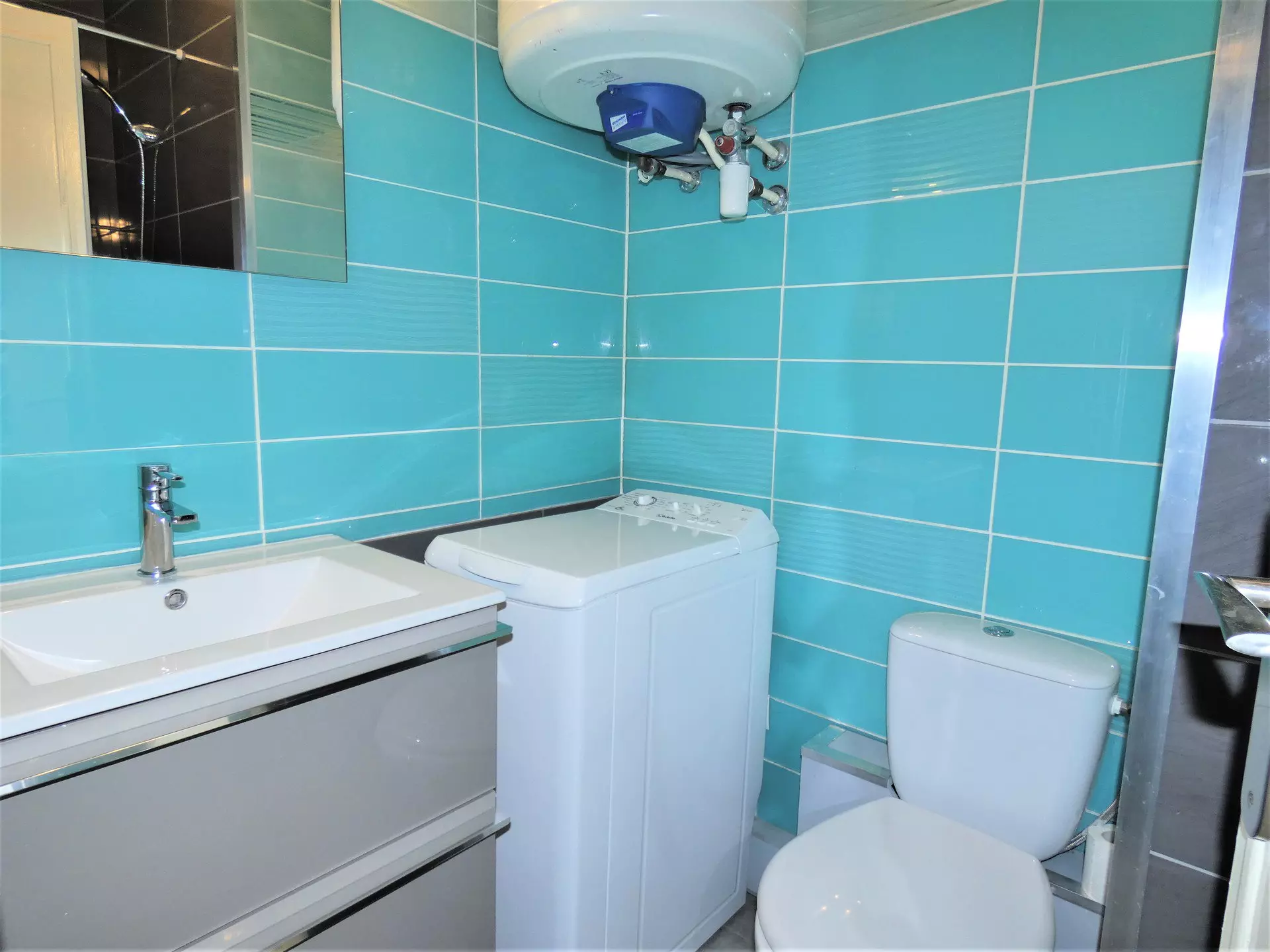 Shower room: (tiled floor): 1 shower with curtain - 1 vanity unit - 1 washing machine - WC