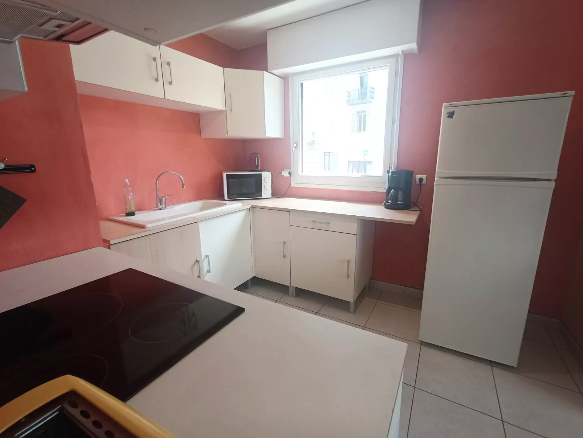 Open kitchen onto living room (tiled floor): fridge/freezer, 3 induction hobs, electric oven, microwave, kettle, electric coffee maker, toaster, crockery and cookware