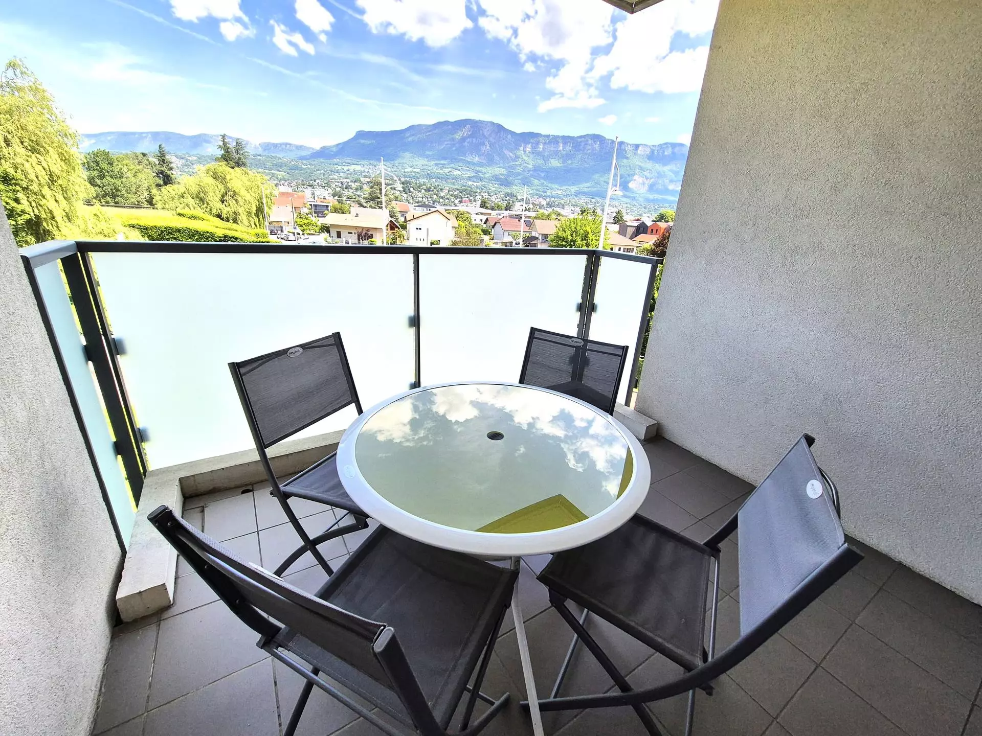 Surface area 50m² 2nd floor, open to the South onto East balcony and South Loggia with table, chairs, and armchairs.