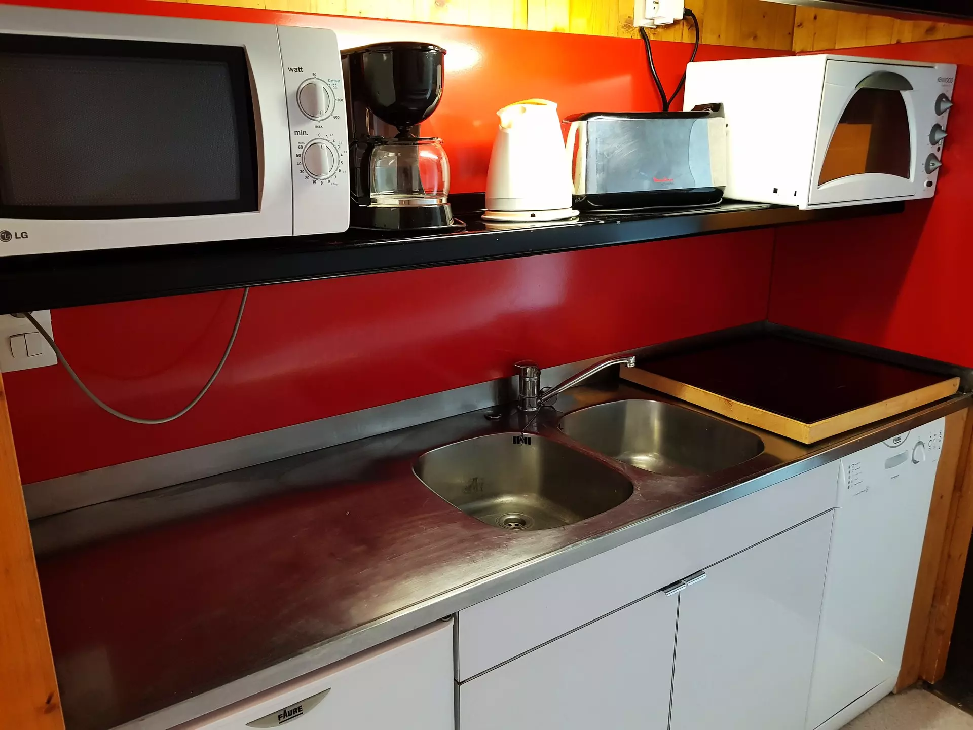It is equipped with ceramic hobs, an oven, a microwave, a dishwasher and a refrigerator.