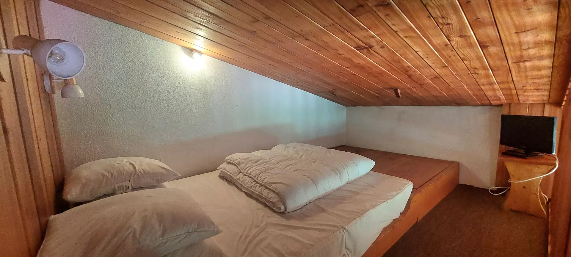 A mezzanine above the living room with a double bed and a TV (not for children)