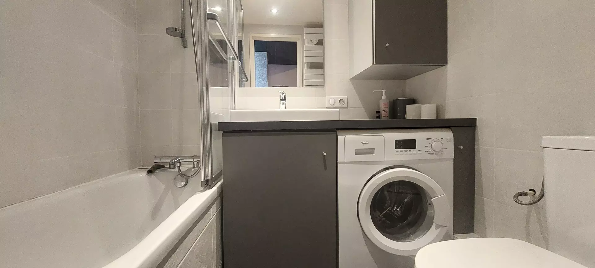 Bathroom with bathtub, washing machine and WC.