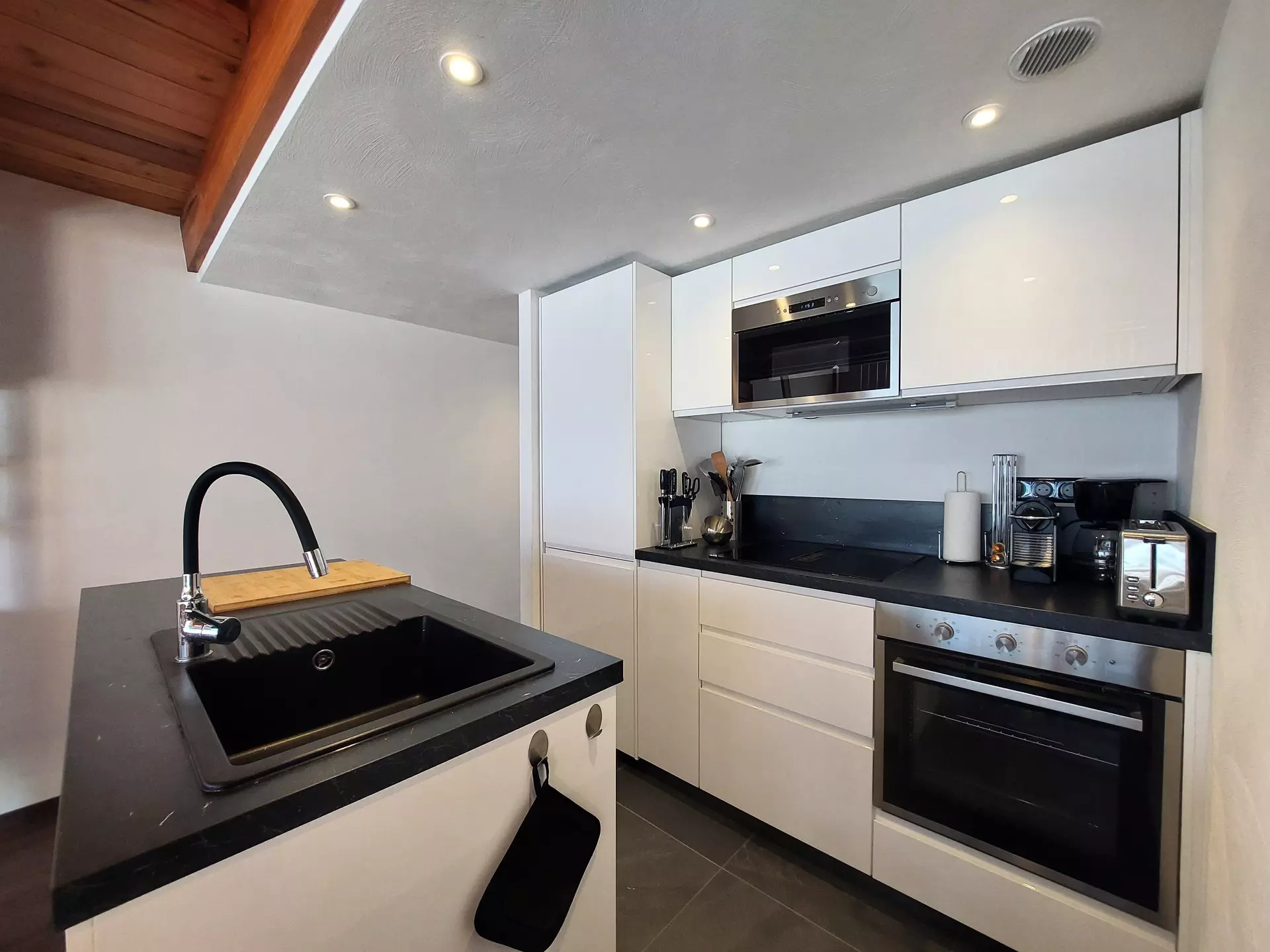 The kitchen is equipped with a dishwasher, microwave, oven, electric coffee maker, toaster and kettle.