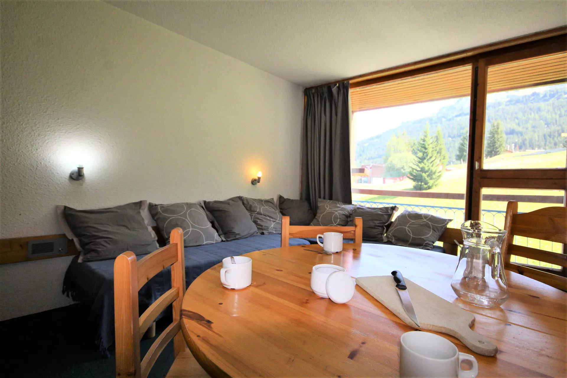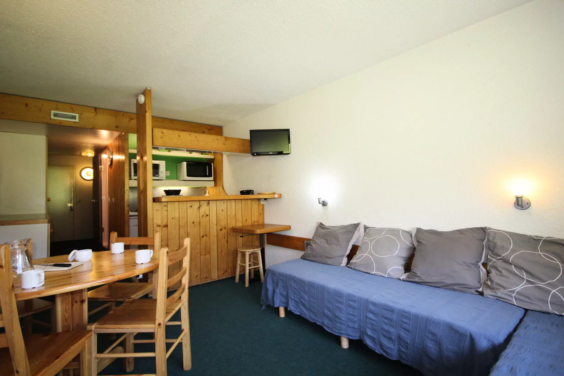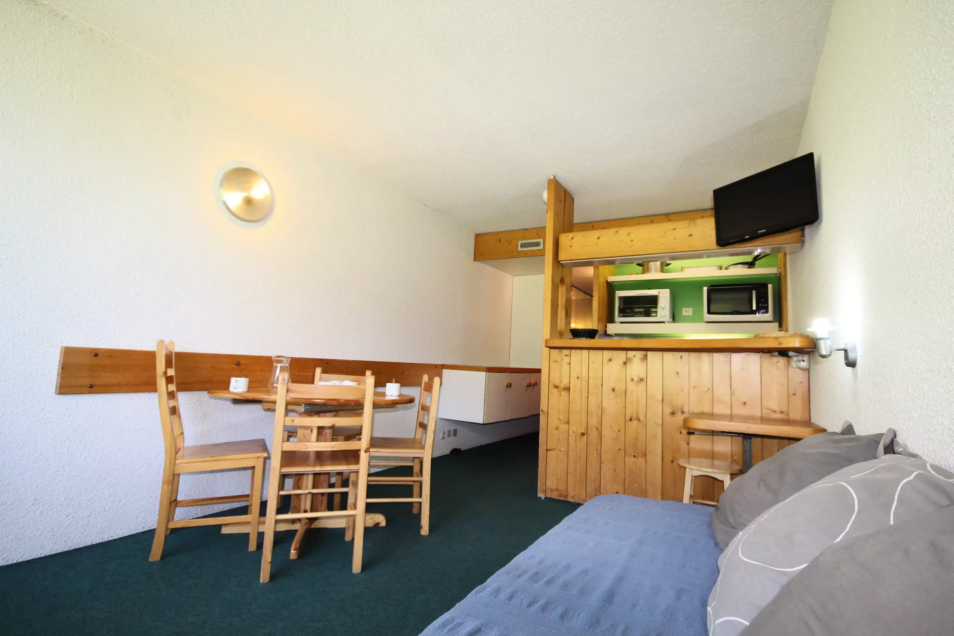 Studio equipped for 5 people with a surface area of 30 m2, located on the 4th floor of the Pierra Menta residence in the village of Charvet d'Arc 1800, North-East facing balcony, Mont Blanc view