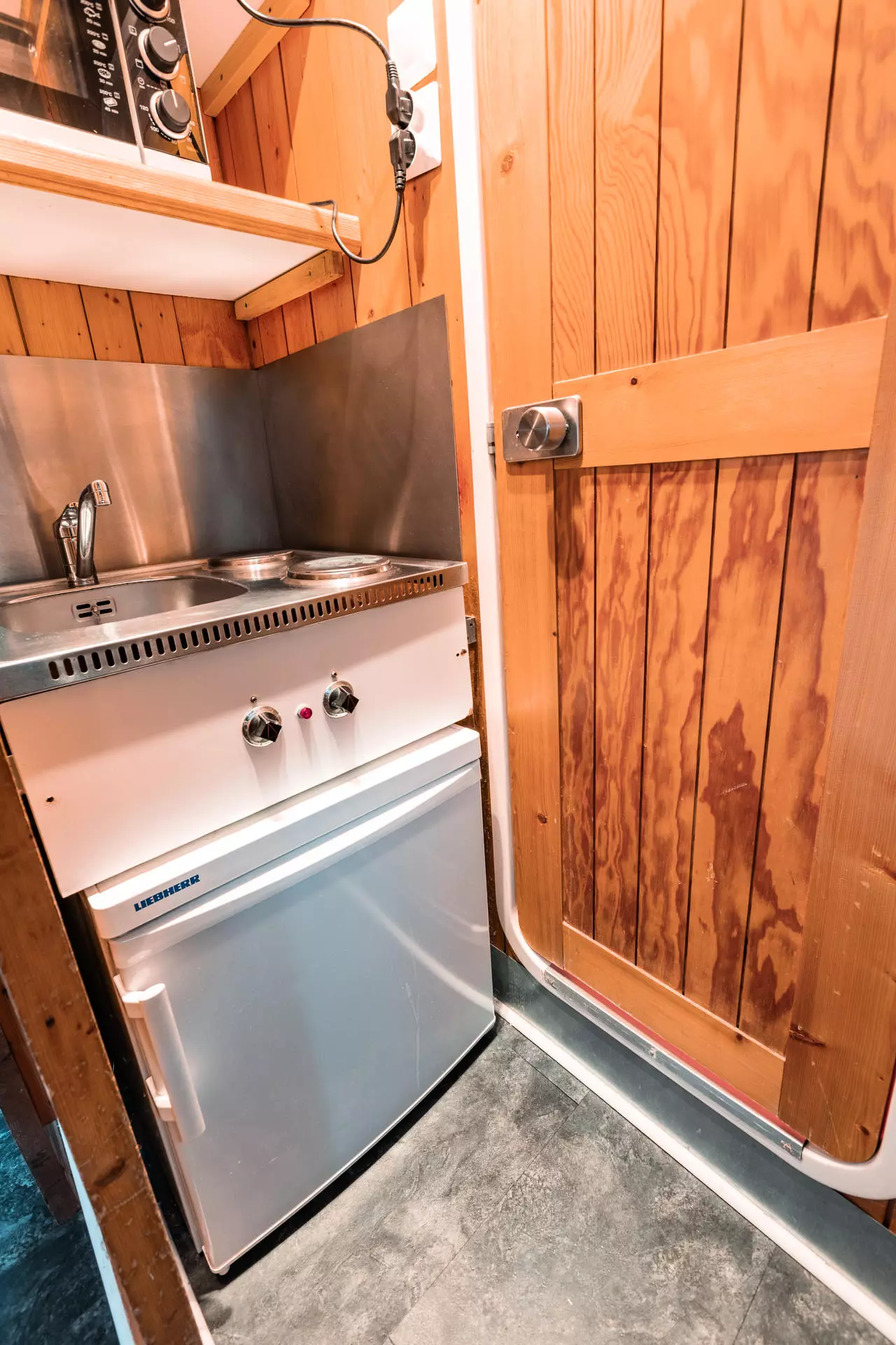 It is fully equipped with electric hobs, an oven, a microwave, a refrigerator and an electric coffee maker.