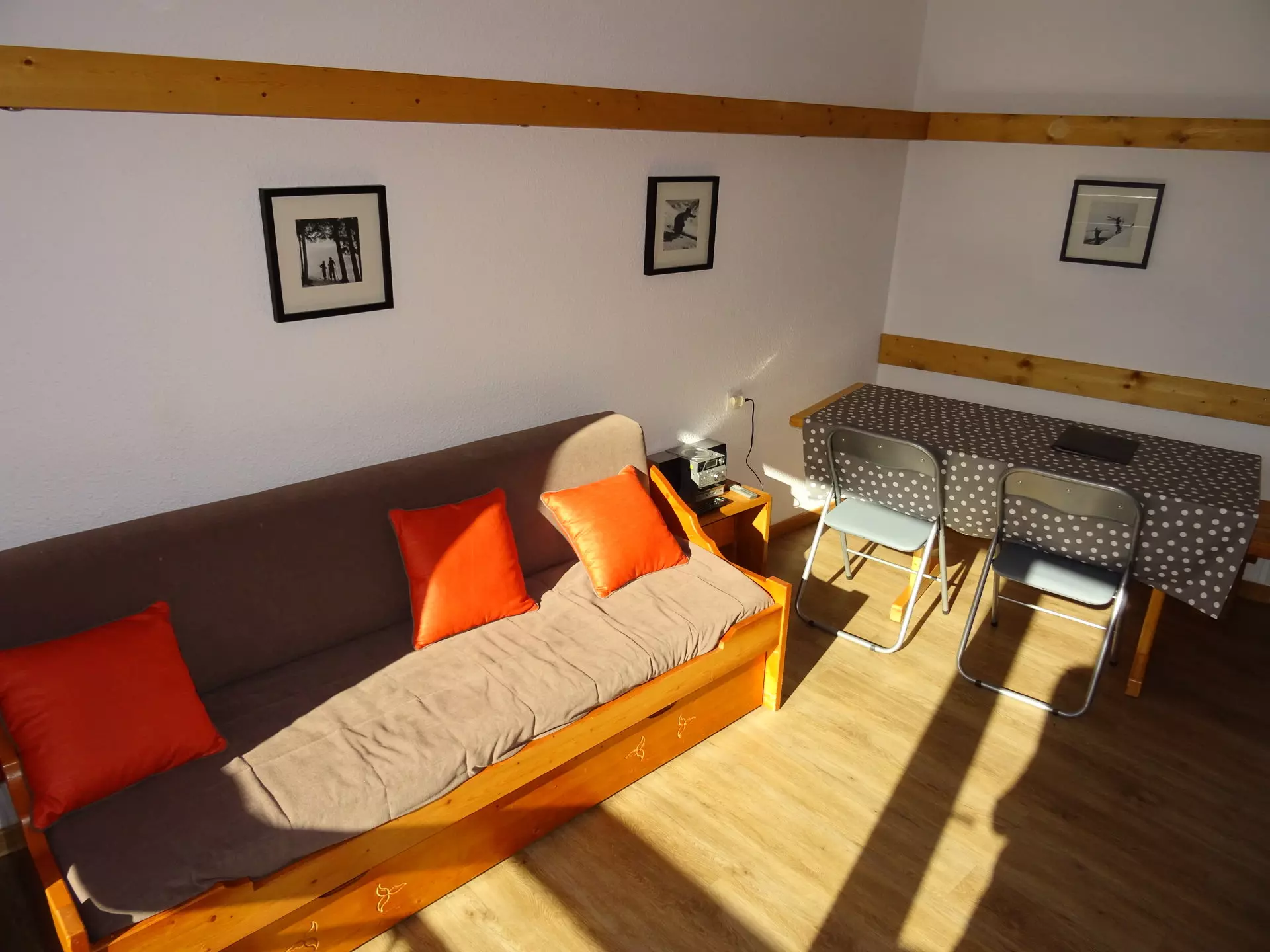 In the living room there is a pull-out sofa bed.
