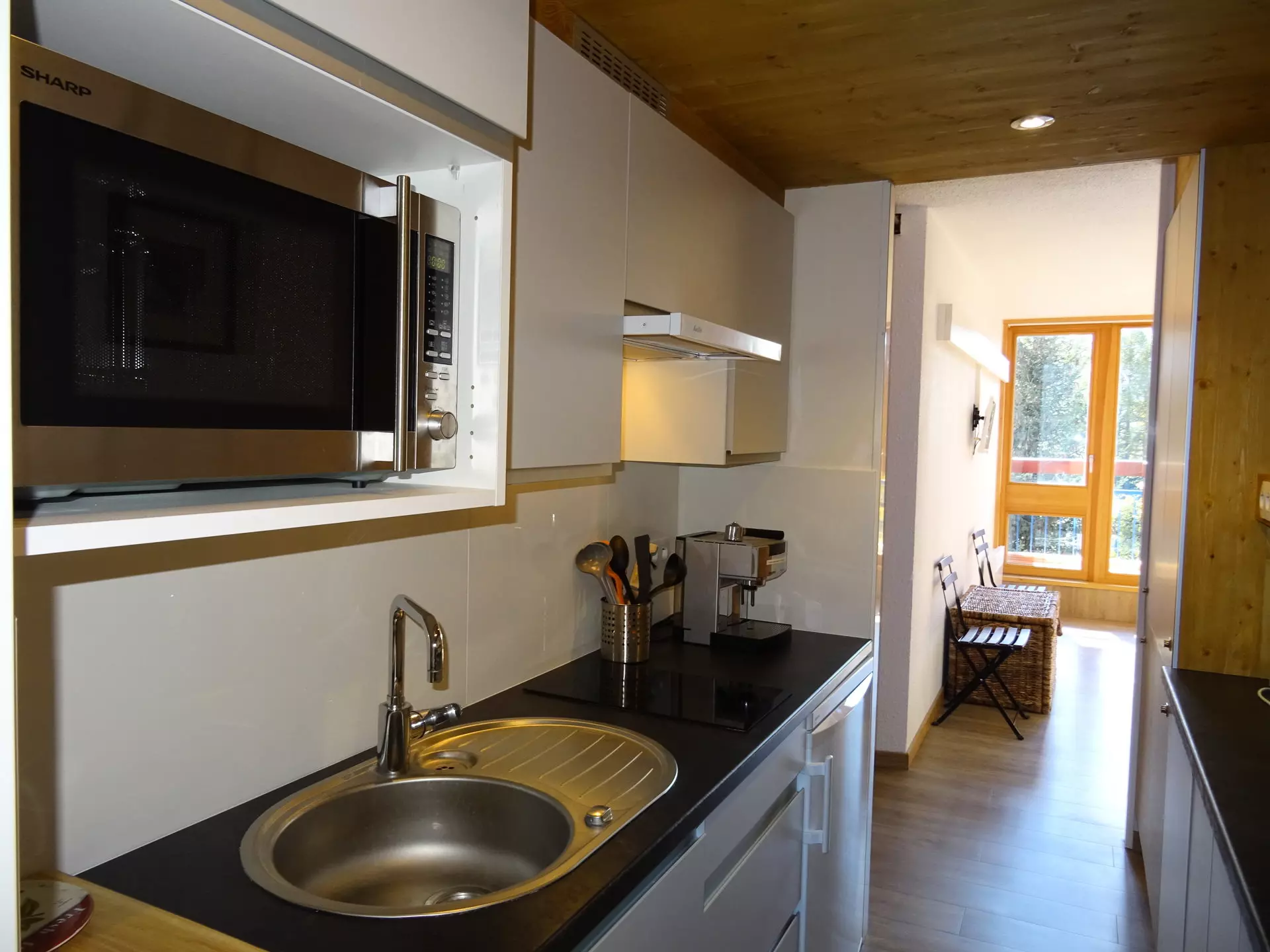 It is fully equipped with induction hobs, a combined oven and microwave, a dishwasher and a refrigerator.