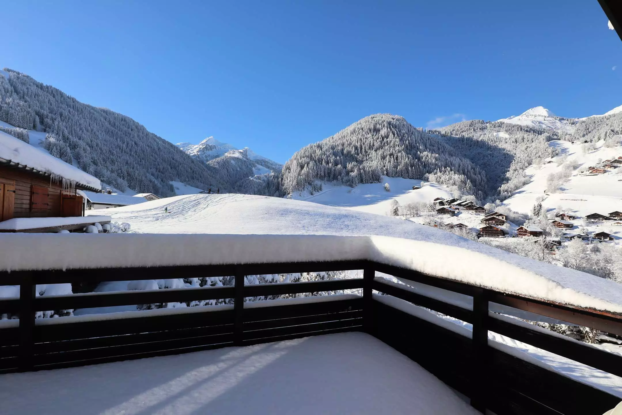 You access the chalet from a dead end, by a small staircase which leads you either to the ground floor, or via a small sheltered balcony, directly to the 1st floor and to the living room.