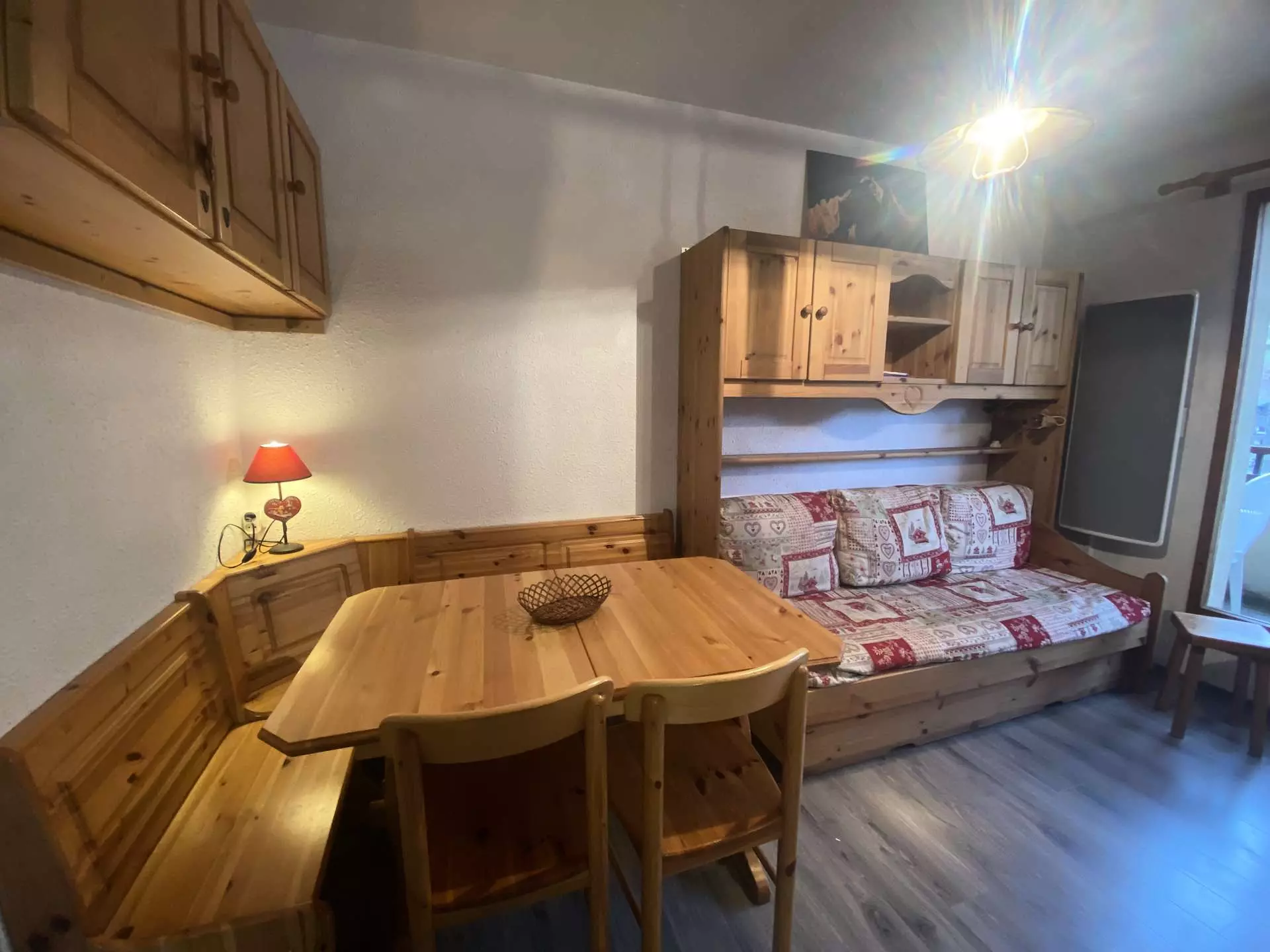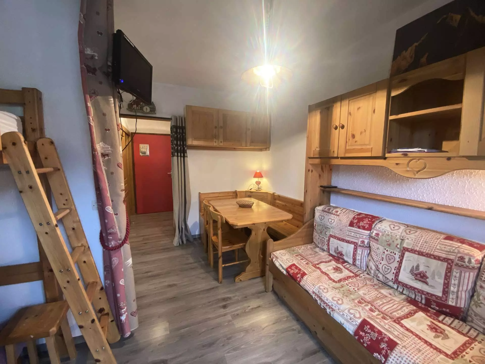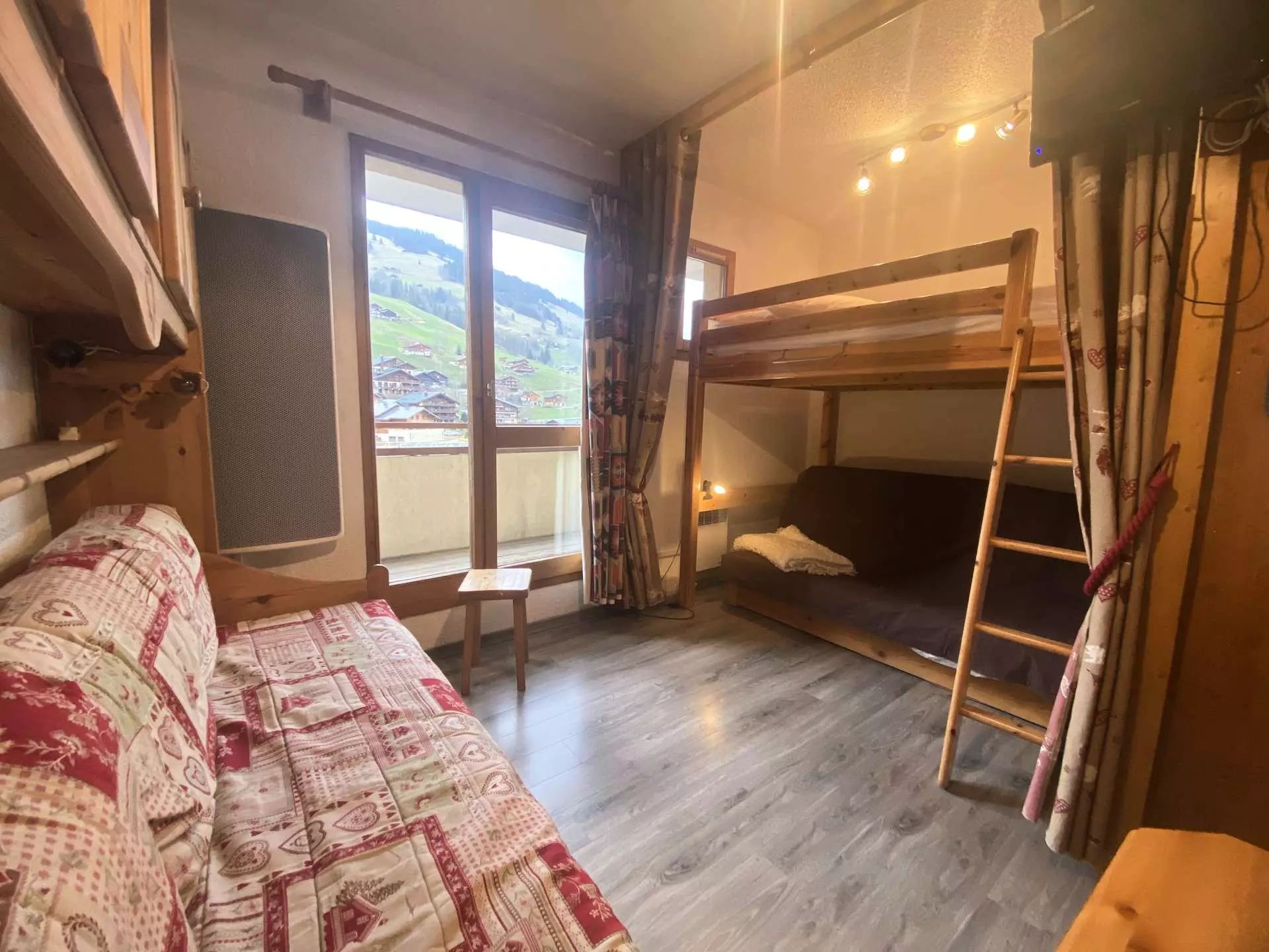 Very functional 25m² apartment on the raised ground floor - Ideal location: walking distance to the ski slopes and the village of Arêches - In a residence of 70 apartments in Val Blanc II, with a shared swimming pool in summer* - cabin entrance with bunk beds - bathroom/wc. Living room with 90 x 190 pull-out beds - equipped kitchenette (dishwasher) - TV - alcove with 1 bed 140. Mezzanine - west balcony - view of mountains and alpine pastures.