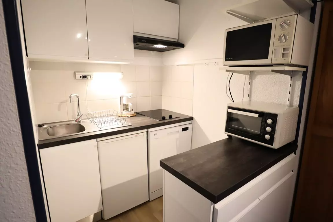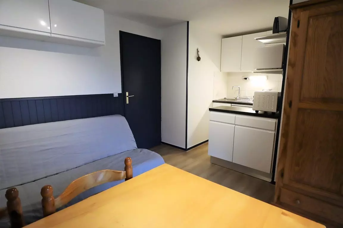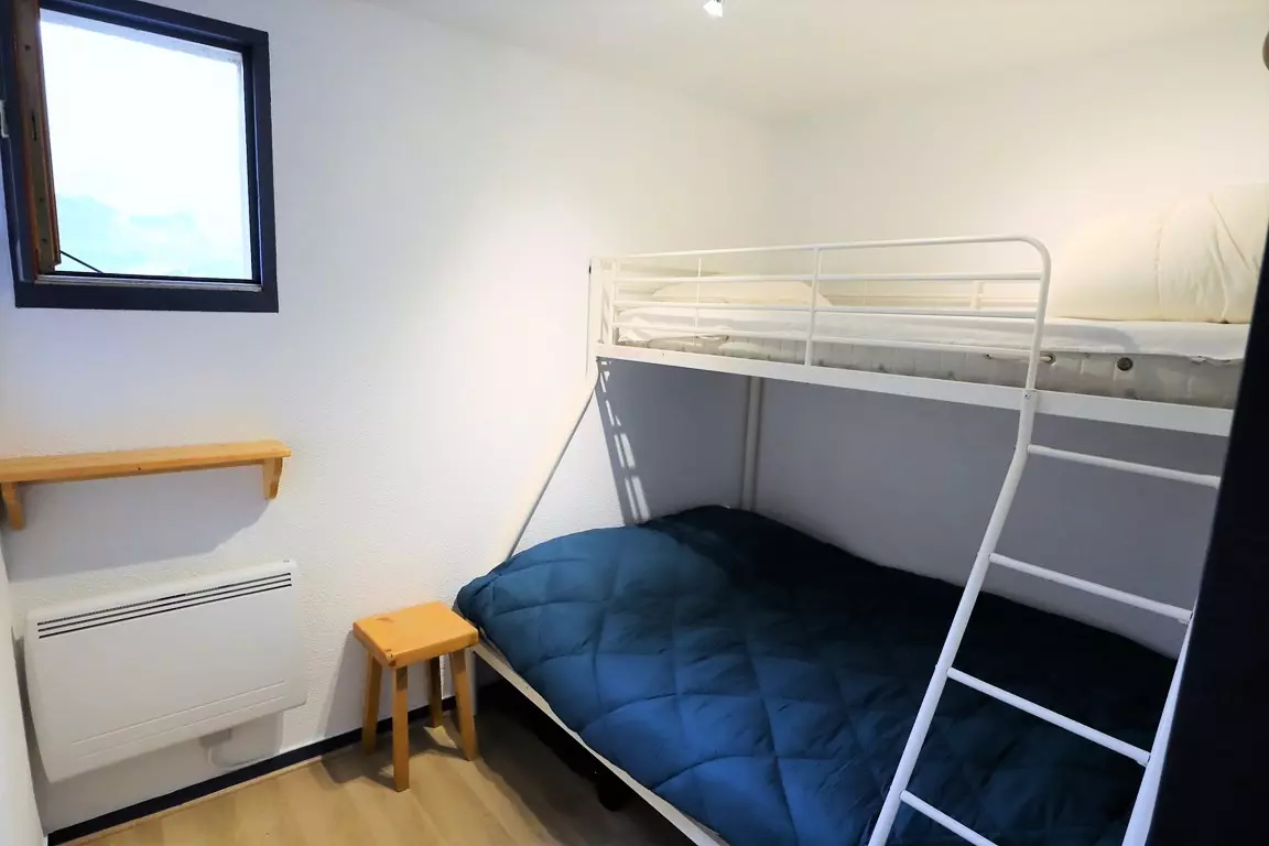 Very functional SOUTH-facing apartment of 27m² WITH BALCONY - 1st floor with elevator - Ideal location for walking to the ski slopes and the village - residence of 70 apartments in Val Blanc II with shared swimming pool in summer * - Entrance - living room with sofa bed for 2 people - equipped kitchenette (dishwasher) - closed bedroom with 1 double bed and 1 single bed above - TV. Children welcome (baby bed)