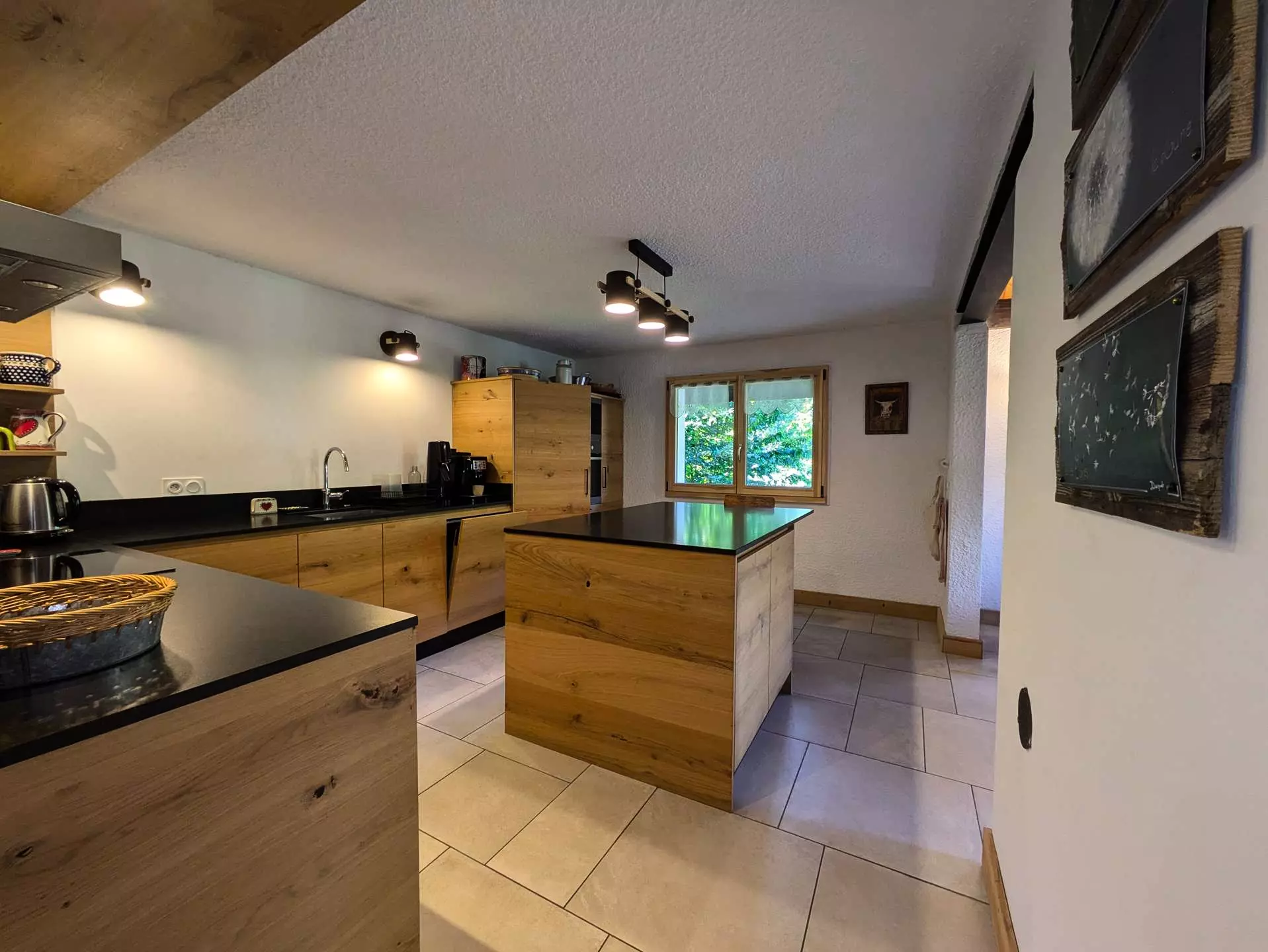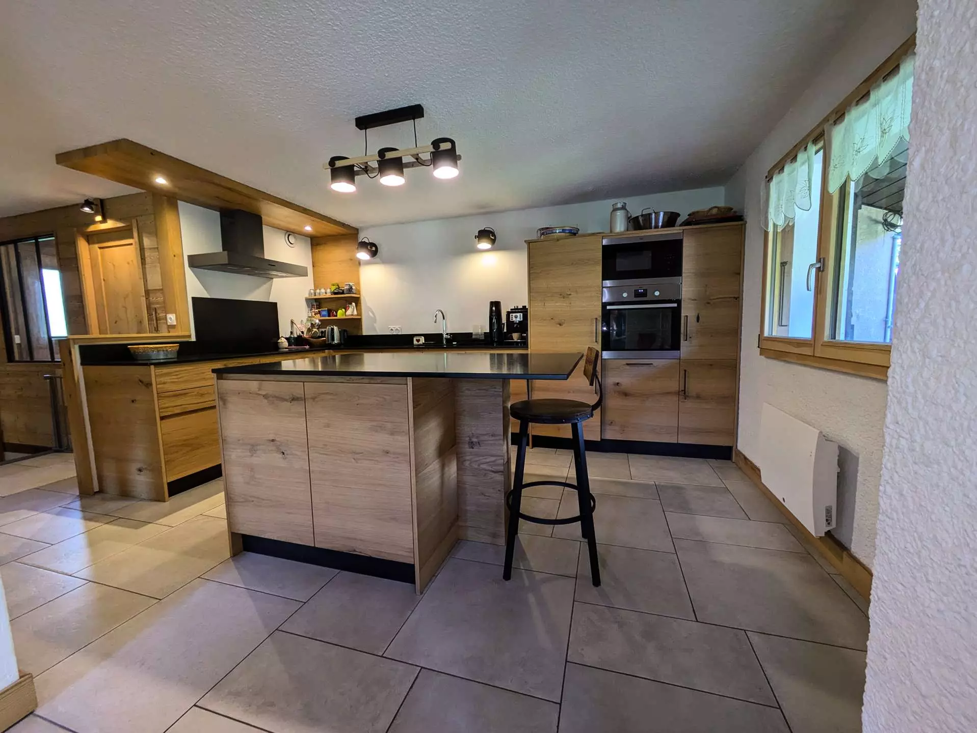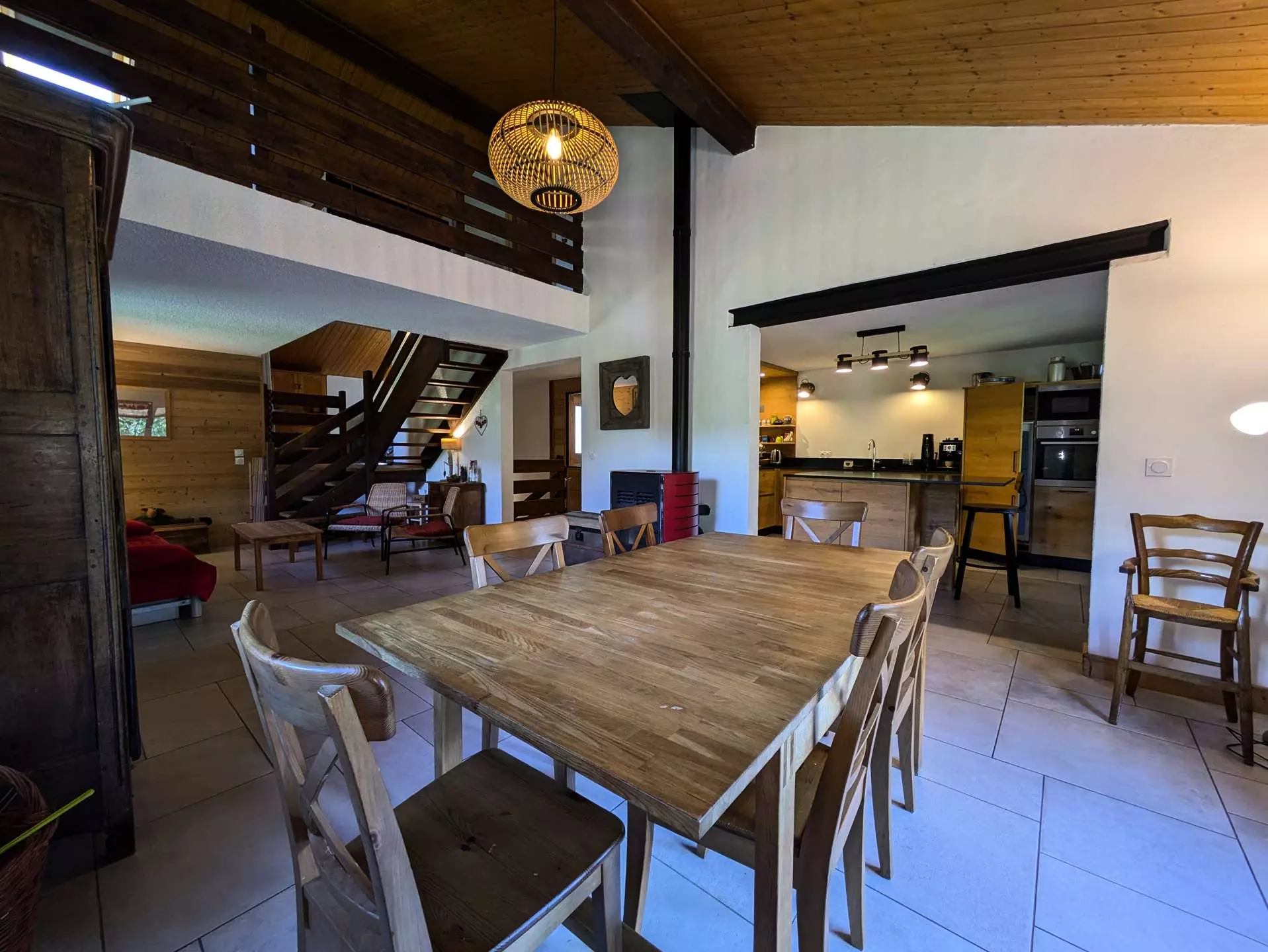 Level 1: A drop-off entrance allows you to leave your shoes and jackets. Then you enter directly into the living room / kitchen and dining area. Very beautiful living room around the stove (pellet). The L-shaped kitchen with a central island is very well equipped (oven, microwave, kettle, Nespresso + filter coffee machine, toaster, crepe maker, fondue maker, raclette maker, etc.).