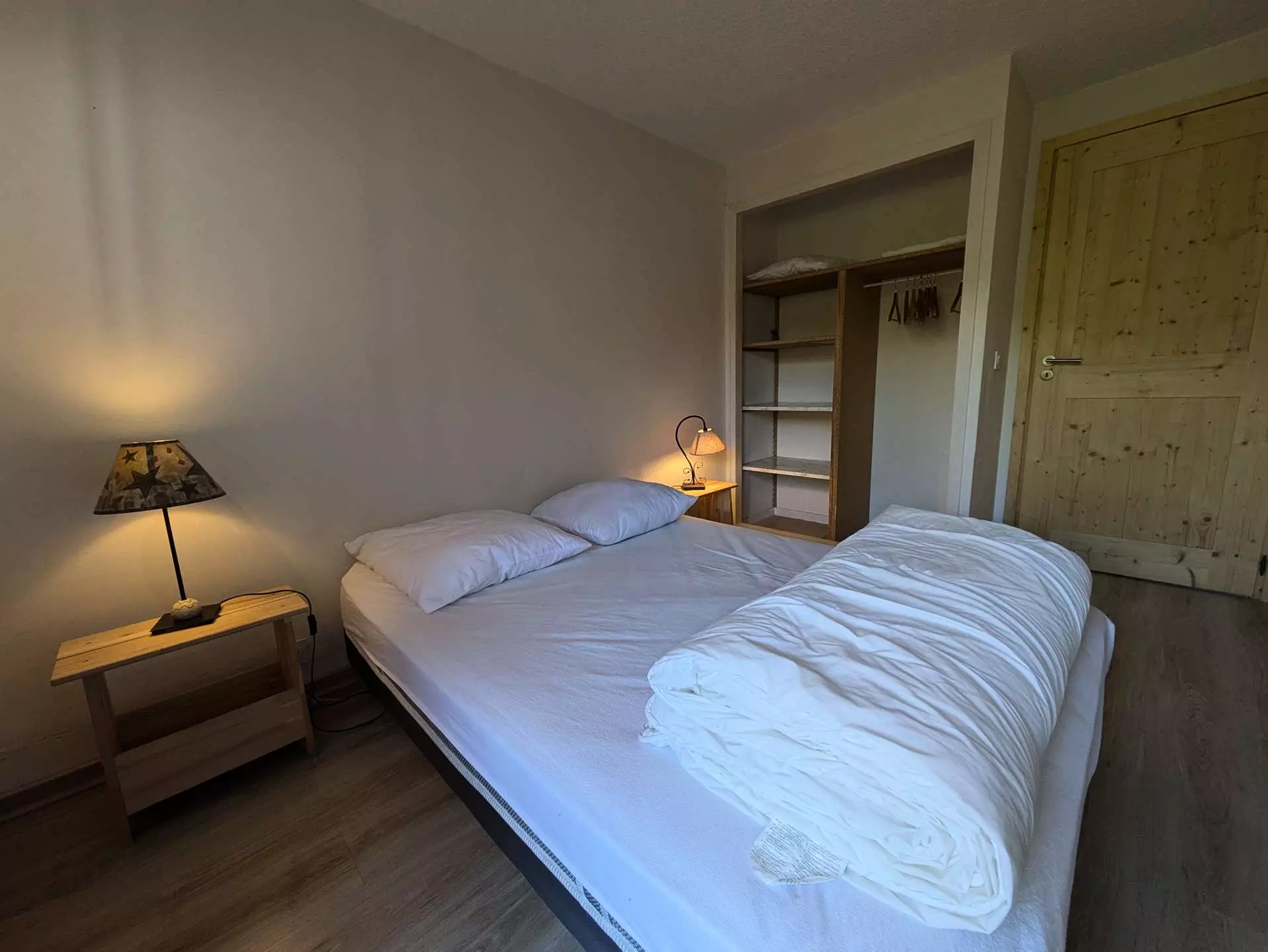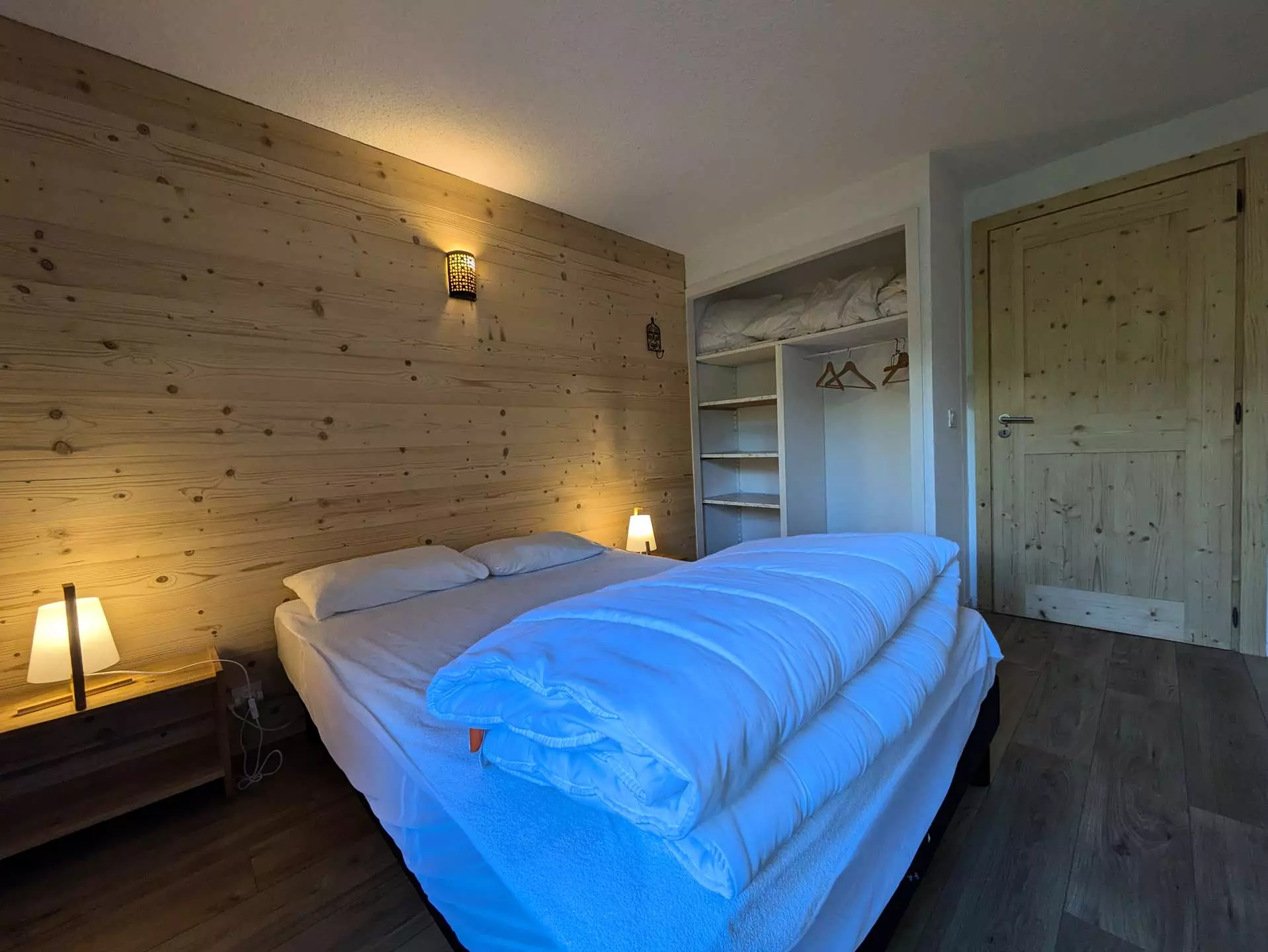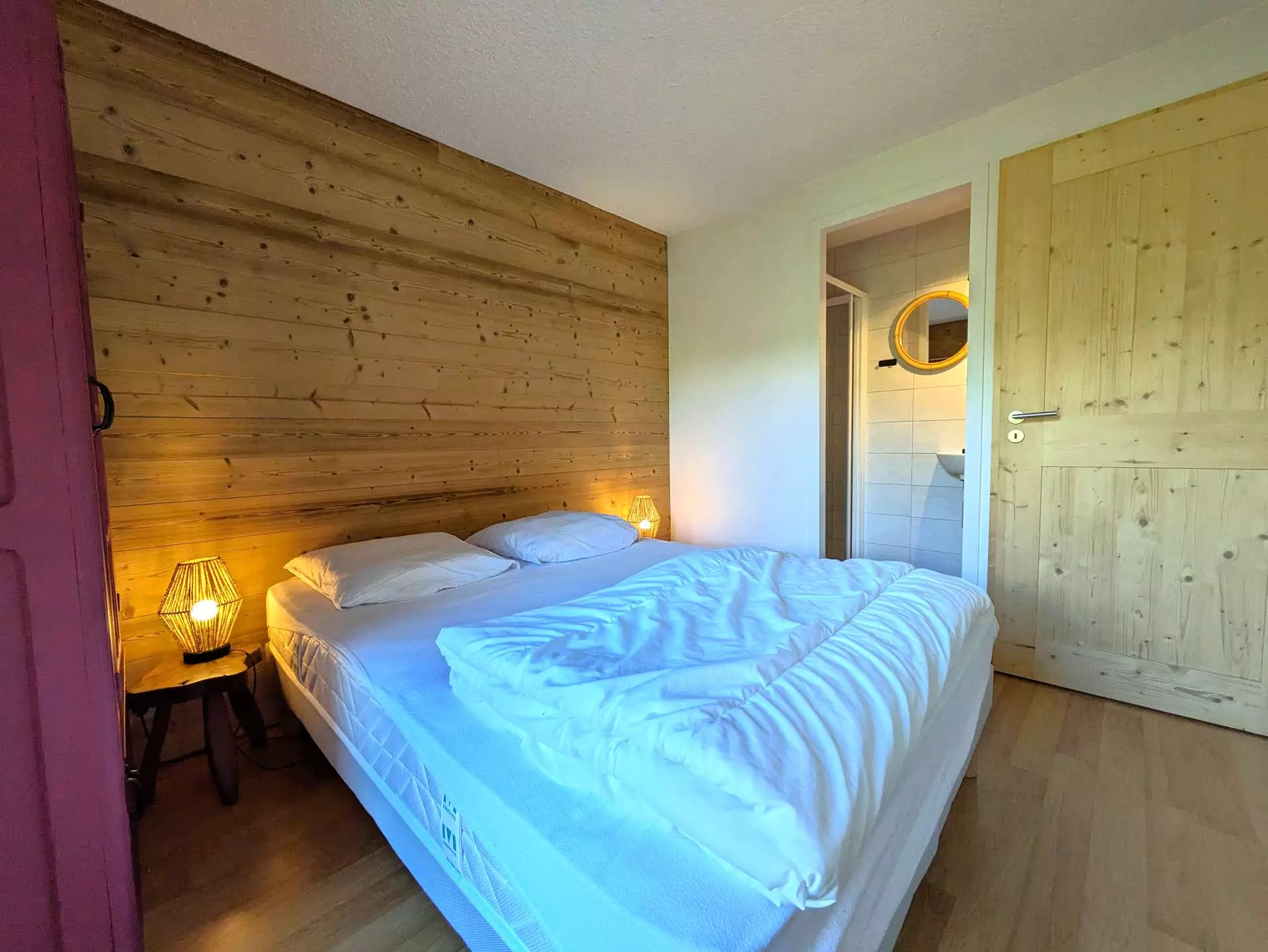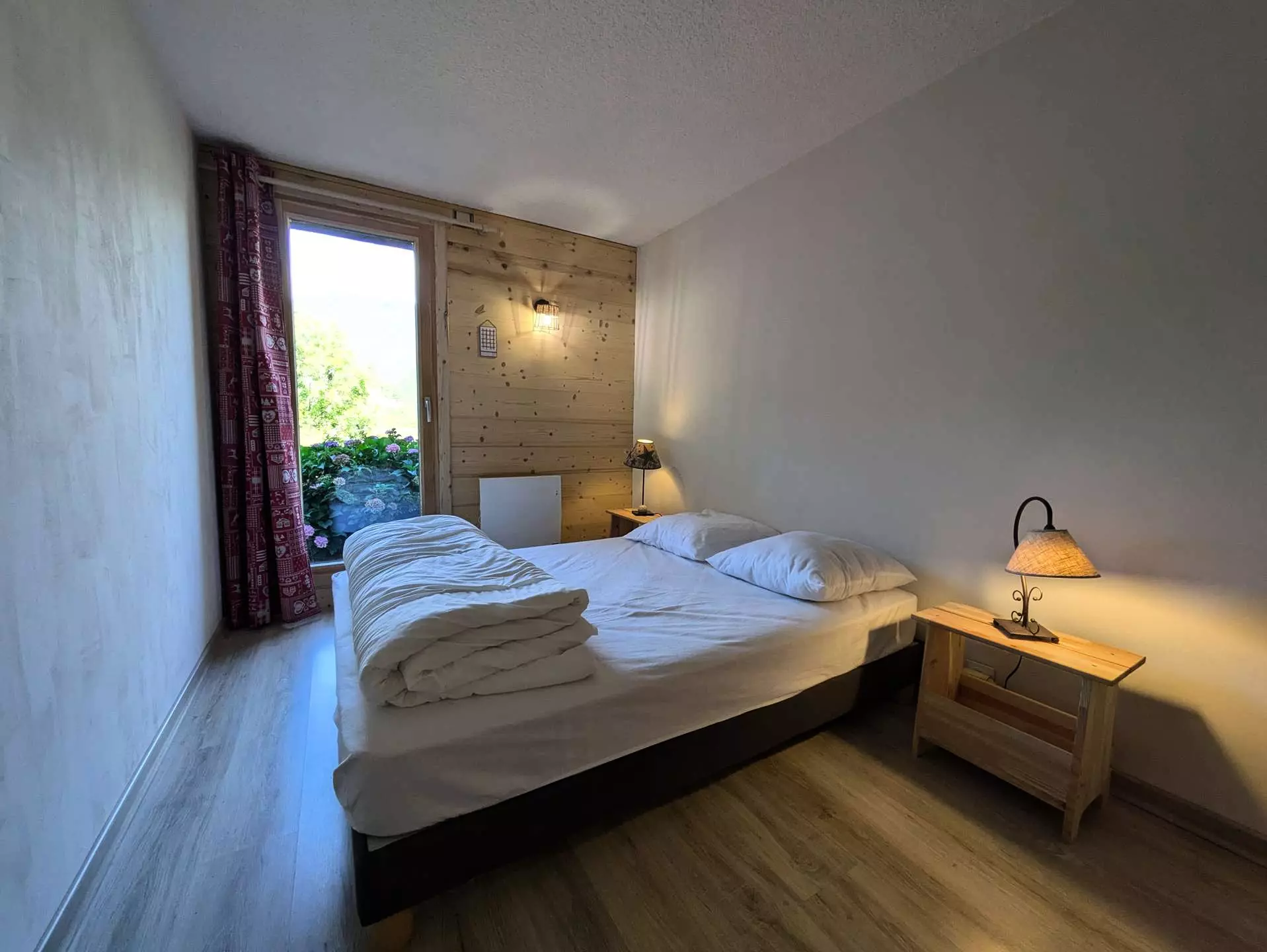 NIV.0: The bedrooms are located on the ground floor of the chalet: 3 bedrooms, each with a 140 x 190 bed (duvets) opening through a French window to the outside. Storage space for clothes. One of them opens onto a larger terrace and directly onto the lawned garden; 1 master bedroom (1 140x190 bed) with shower and sink is located on the half-floor (window) as well as another separate toilet.