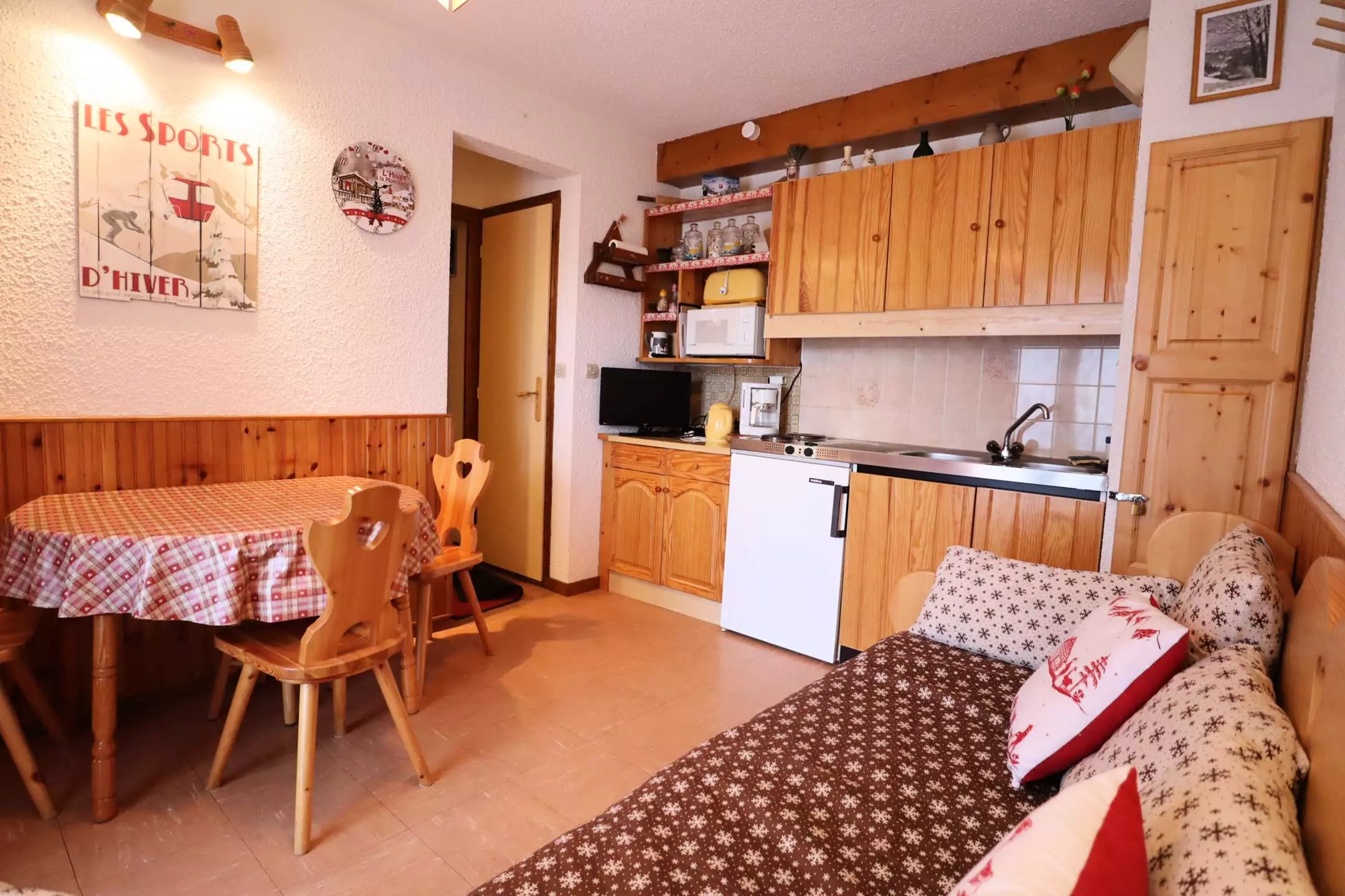 Apartment Bright and cozy apartment of approximately 23 m² with terrace in a chalet with 6 apartments. Dominant view of the mountains and village - living room with equipped kitchen area with dishwasher - 1 bedroom (1 double bed 140 x 190) + 1 pull-out sofa bed (2x80 or 160 x 190 in the living room - wc - bathroom - N/E terrace.