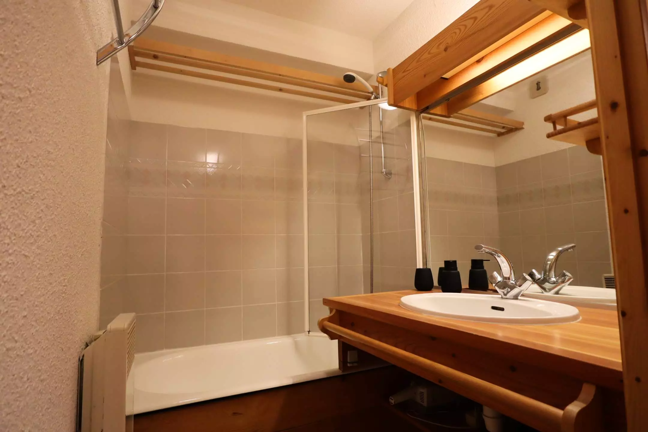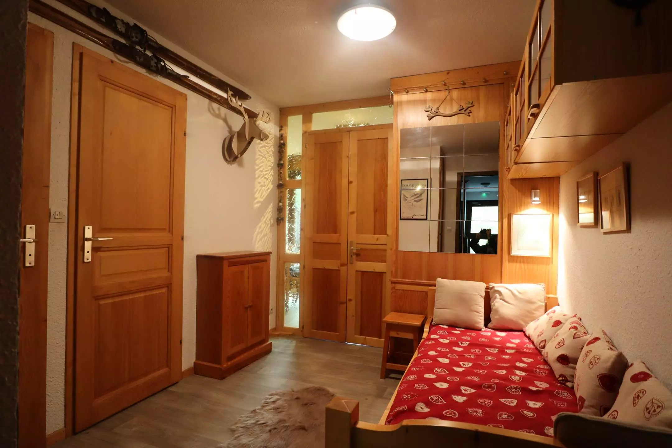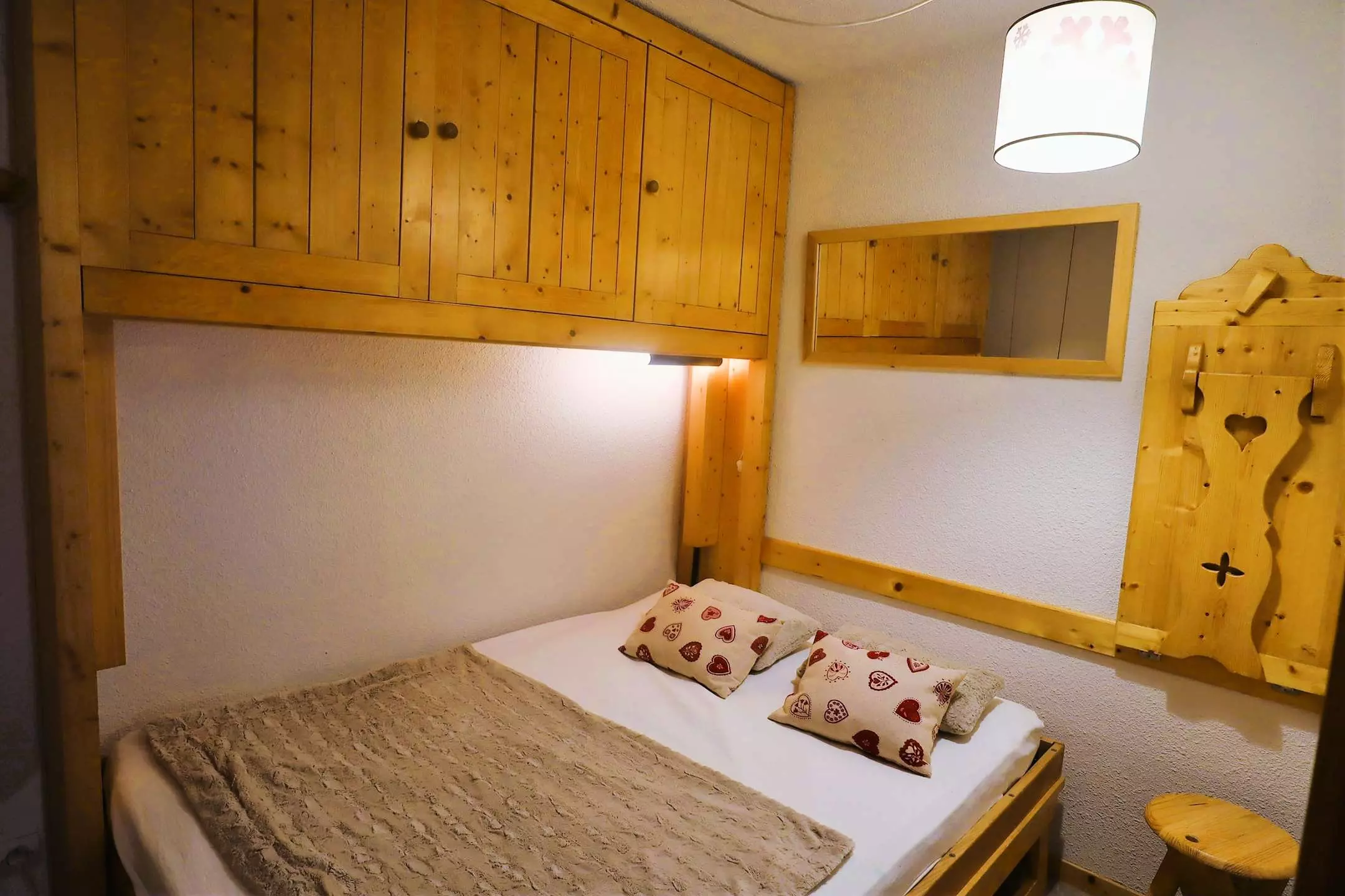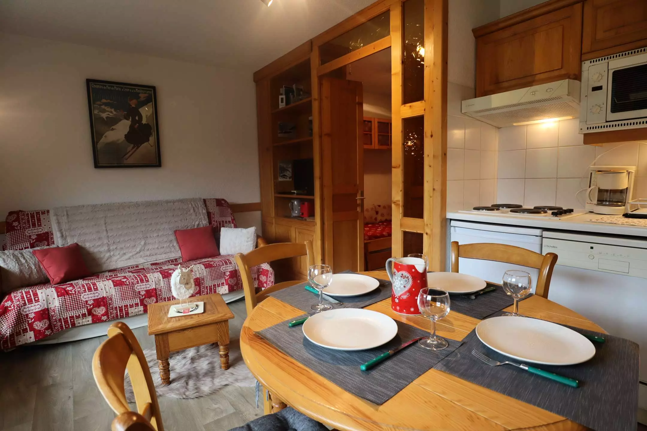 This very bright apartment given its south-west exposure offers a very pleasant living space. The entrance, in which there are two 90x190 beds and which closes to create a bedroom with storage space, serves a closed cabin bedroom with a 140x190 double bed (storage) and also a spacious living room with lounge area (Television, sofa bed) and kitchen/dining area. The US kitchen is fully equipped (dishwasher, oven, Senseo coffee maker, raclette machine) - bathroom - WC. You can enjoy the village/peaks view and the sun on the balcony (garden table and chairs).